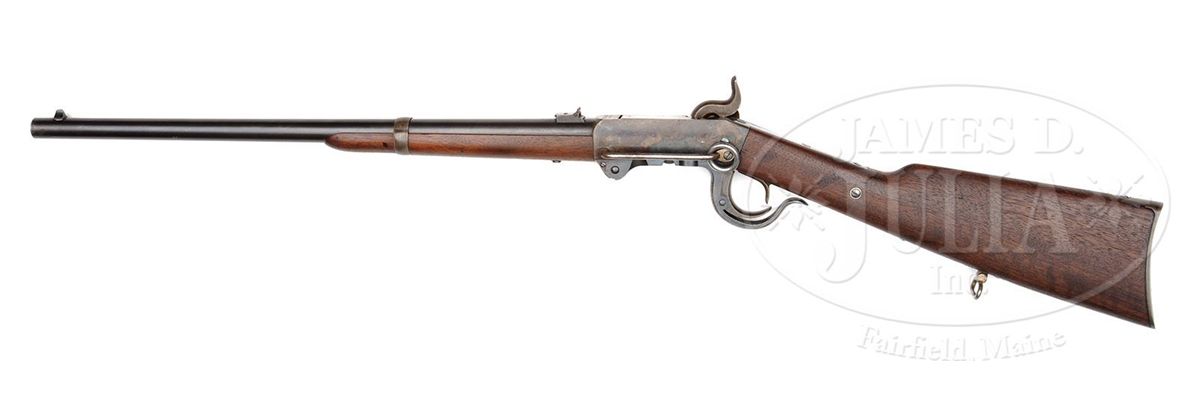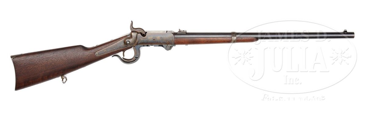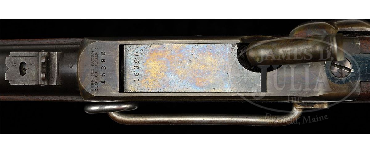 SN 16390. Cal. 52. This is a very fine example of the popular 5th model Burnside carbine you will find. This gun exhibits bright blue finish, bright case colors and crisp cartouches on a raised grain stock. This gun conforms to other guns of this pattern with 21" bbl and about 39" overall. Markings are crisp and as typically found on breech, bbl and lock, as can be seen in photos. This gun was designed by the Civil War general Ambrose Burnside. The cartridge this carbine used was one of the most unique of the Civil War being a "ice cream cone" shaped brass casing though this was still a percussion arm. CONDITION: Very fine. Bbl retains about 90% of its blue finish though most is turning plum with scattered areas of rust and pitting. The frame, lock and hammer exhibit bright case colors though muted in areas with scattered areas of rust and pitting. The breech lever and backstrap exhibit 95%+ bright brilliant blue with scattered rust and numerous small scrapes and scratches on bottom of lever. Buttstock is sound and solid with crisp cartouches, as seen in photos, with scattered tiny scrapes, scratches, dings and dents. Forestock has one small 1/2" chip with scattered dings and dents. Bore is bright and crisp and appears unfired. 4-49002 JS9