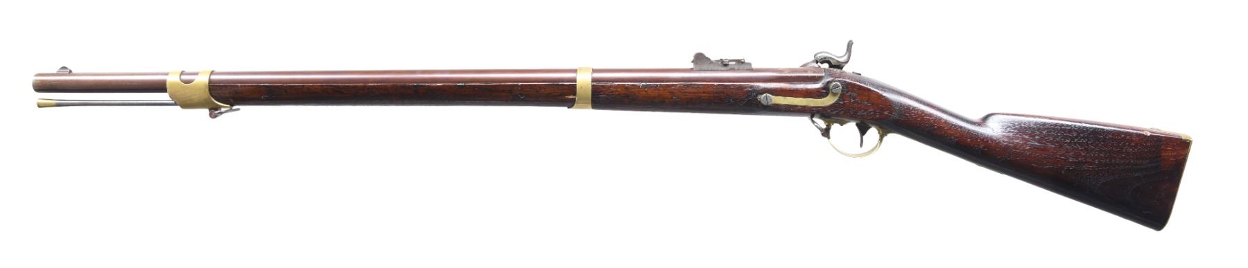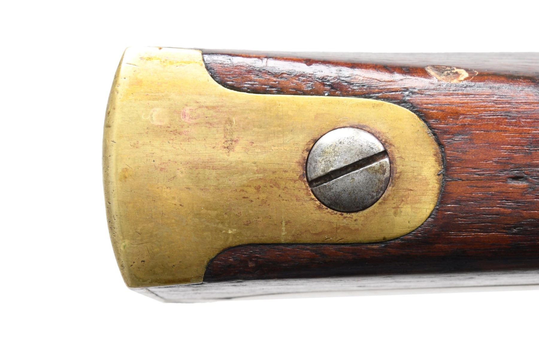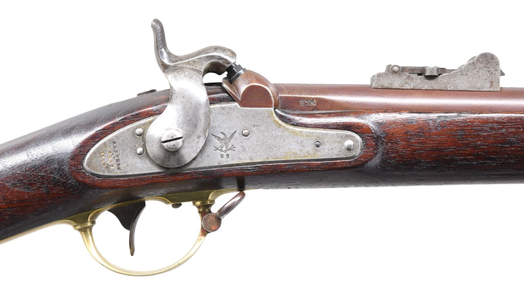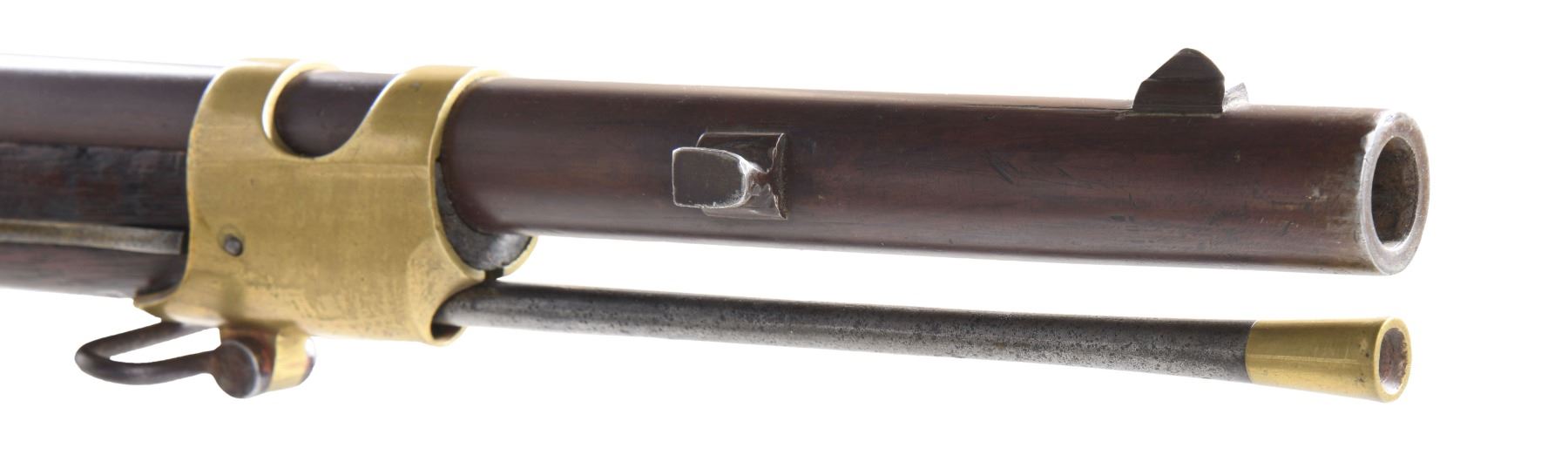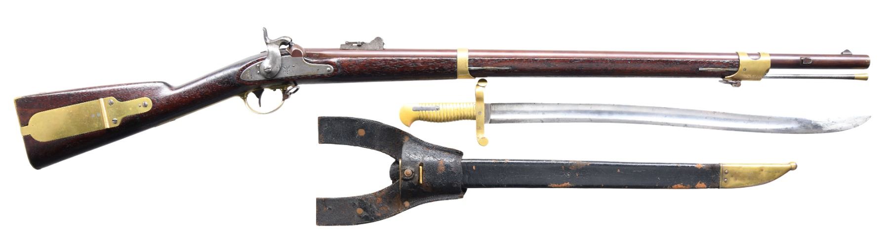 MISSISSIPPI RIFLE. Cal. 54. NSN. Standard configuration of model 1841 brass mounted two band rifle, "HARPERS FERRY 1850" marked lock with eagle & "US". 33" barrel dated 1850 and inspected "WCK" (William C. Kirby-inspector at time of alteration) along with original barrel inspection "AW / P". Harpers Ferry armory modified for saber bayonet with added lug, shortening forestock, and cut back front band. Long-range adjustable Enfield-style leaf sight (spanner screw retained) & model 1855-style front sight are characteristic of what George Moller classifies as a type III alteration performed at Harpers Ferry 1858-1860. About 4500 rifles were altered in this configuration with about half being rebored and the reminder remaining in .54 caliber like this fine survivor with matching bayonet. Bayonet has several sub-inspector initials. This is a very fine survivor with original brown finish & crisp bore with crisp shiny 7 land and groove rifling. UNATTACHED ACCESSORIES: copy of pages from George Moller's 2011 text detailing this alteration. CONDITION: fine overall, complete and original, barrel retains about 90% thinning brown finish, crisp marking & proofs. Stock is sound and solid with good "WCK" inspection stamped in flat opposite lock along with weak and barely discernible "JLR" (John L. Reseler, original 1850 inspector) mechanically sound, crisp rifled bore. Accompanying saber bayonet, scabbard, and frog are in matching very good to fine condition, 27" blade is bright/gray, staining, fits well. (01-26021/JS). ANTIQUE. $3,000-4,000.