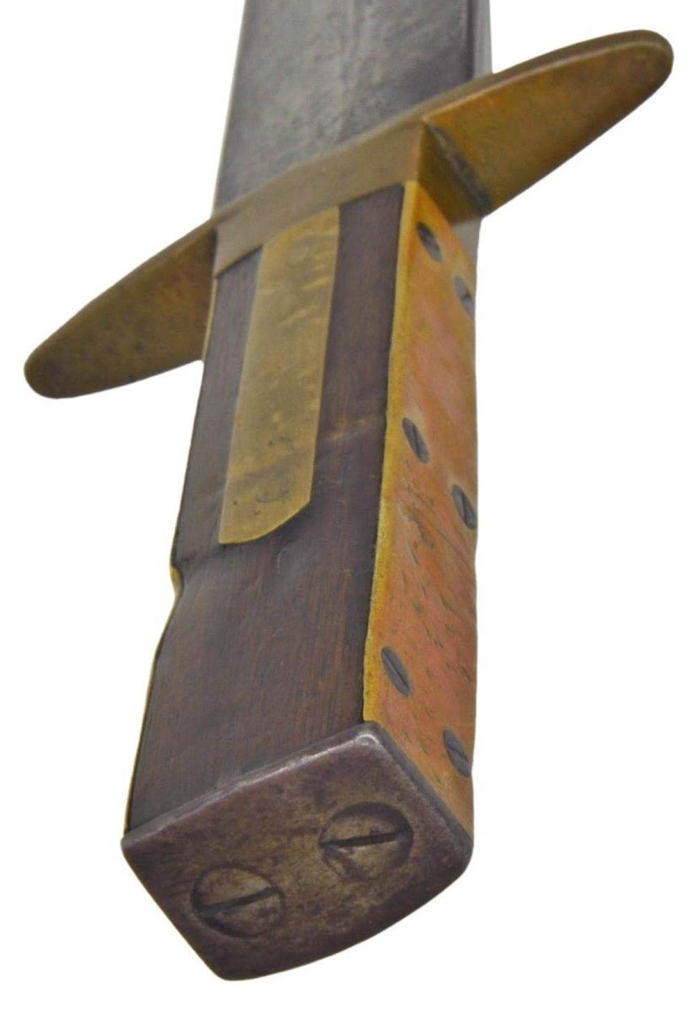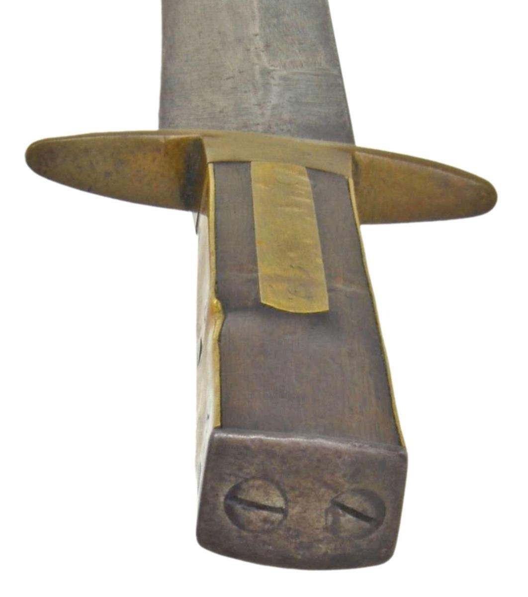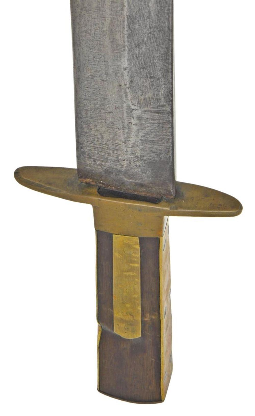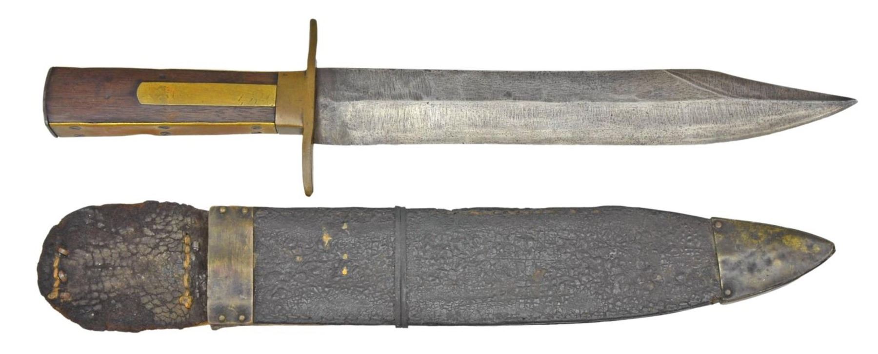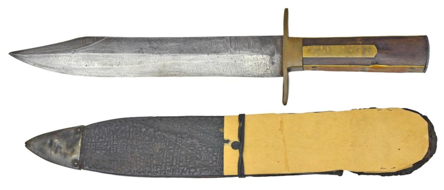 SHEATH. Hicks riflemen knives are published in early texts starting in 1956 as the rarest and earliest American martial military Bowie knives, thought made in the 1840s. Today we know that these well made bowies were made by Cleveland Ohio tool maker A. G. Hicks in 1861. Photographs of soldiers wearing knives are known as identified Confederate used examples. An interesting article published in 2017 Antique Bowie Knife Collector's Journal eludes that the enterprising Mr. Hicks was possibly attempting to sell his knives in the South before they were confiscated and sent to the governor of Indiana in July of 1861. Regardless, this is a very nice example with the rarely seen original sheath with belt loop. 14.25" overall, 9.5" clip point blade, unique cast brass crossguard, screwed brass straps on wood grip. Retard leather scabbard has brass tip and brass reinforcement at throat. UNATTACHED ACCESSORIES: copy of 2017 ABKA article on Hicks; copy of November 2015 Knife Magazine article by Mark Zalesky "AG HICKS – 64 YEAR OLD MYSTERY SOLVED". CONDITION: very good overall, blade is gray with sharpening & tool marks. One dent on side of handle from strong blow into the wood. The 14 iron screws that hold brass trim & iron pommel have matching grey iron patina to blade. Leather sheath body is sound & complete, crazing to tarred surfaces. Belt loop is almost detached and now supported by cardboard backing so it won't tear. PROVENANCE: William "Bill" Myers. (02-21295/JS). $5,000-6,000.