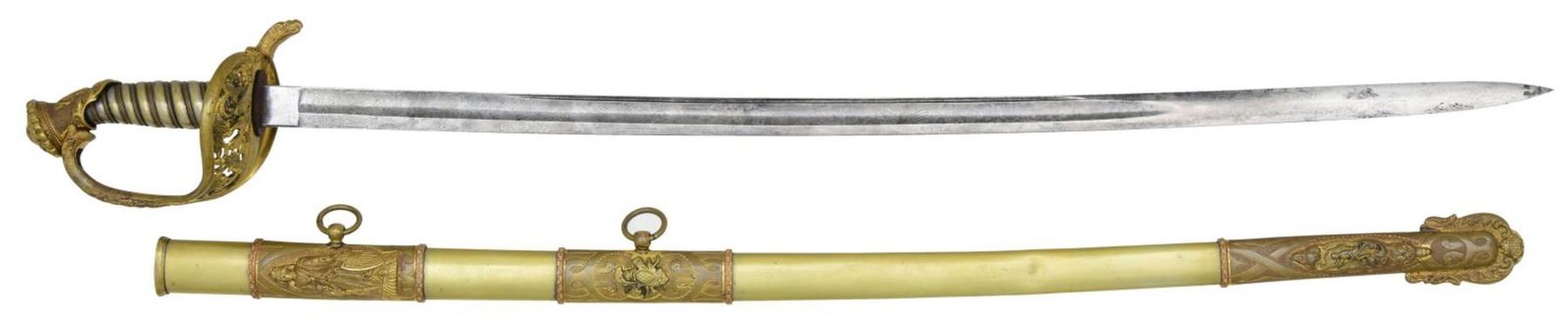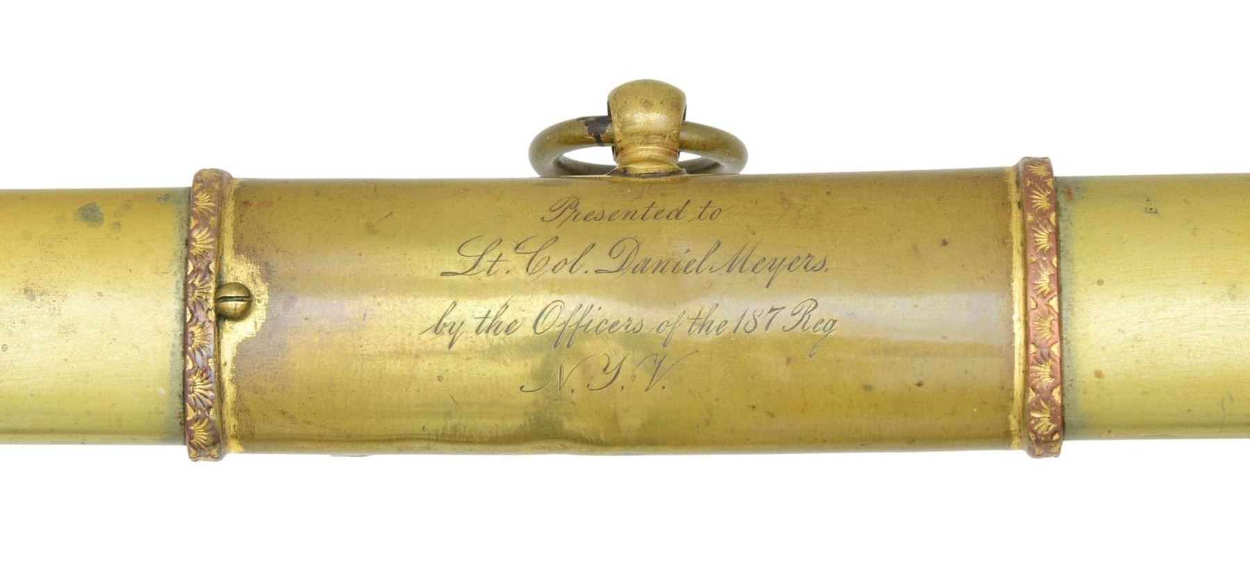 DAVID MYERS, 187th NY. Fancy Civil War Staff & Field officer sword with lots of embellishments that cost a lot more than the typical 1850 Staff & Field. 32.5" patriotically etched Clauberg blade, unusual full standing view of draped woman holding flag with "LIBERTY". Gilded pierced and high relief spread wing eagle in basket and on pommel face. Spiral sheet silver grip with triple brass wire wrap. German silver scabbard has raised relief gilded mounts, top one is engraved; "Presented to / Lieutenant Colonel Daniel Meyers / by the Officers of the / 187Th NYV". Daniel Meyers [Myers] (1837-1921) born of German immigrants in Buffalo, New York, enlisted May 9, 1861 into Co. "G", 21st New York Infantry. He was wounded September 30, 1862 and was promoted to captain in December. On October 10, 1864 he was commissioned Lieutenant Colonel of the 187th New York, probable date of presentation. He would muster out July 1865 in Washington, DC. He would die in Newport, Kentucky in 1921, after many years working for the Kentucky railroad. His twin brother Frank also served during the Civil War, mustering out as captain in the 12th New York Cavalry. CONDITION: very good overall, blade is shiny gray with complete 19" etched patriotic American panels. Hilt and scabbard mounts retain strong traces of gold wash, silver grip and wire wrap are complete. Scabbard is sound and well fit with a couple small dents in body. PROVENANCE: from the Lifelong Collection of Robert "Mike" Bricker. (02-22314/JS). $1,500-2,500.