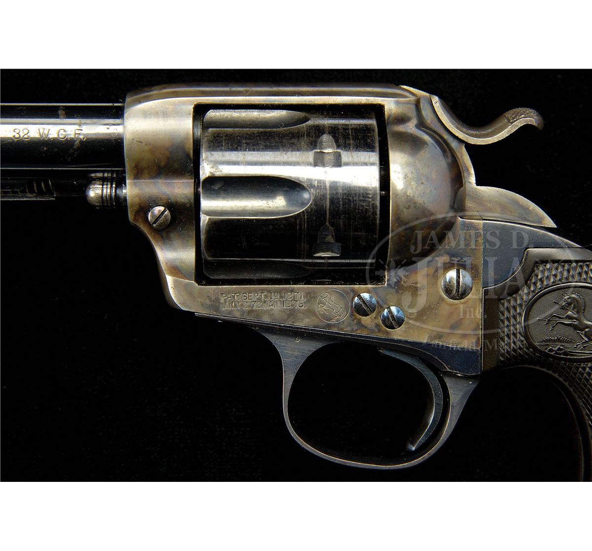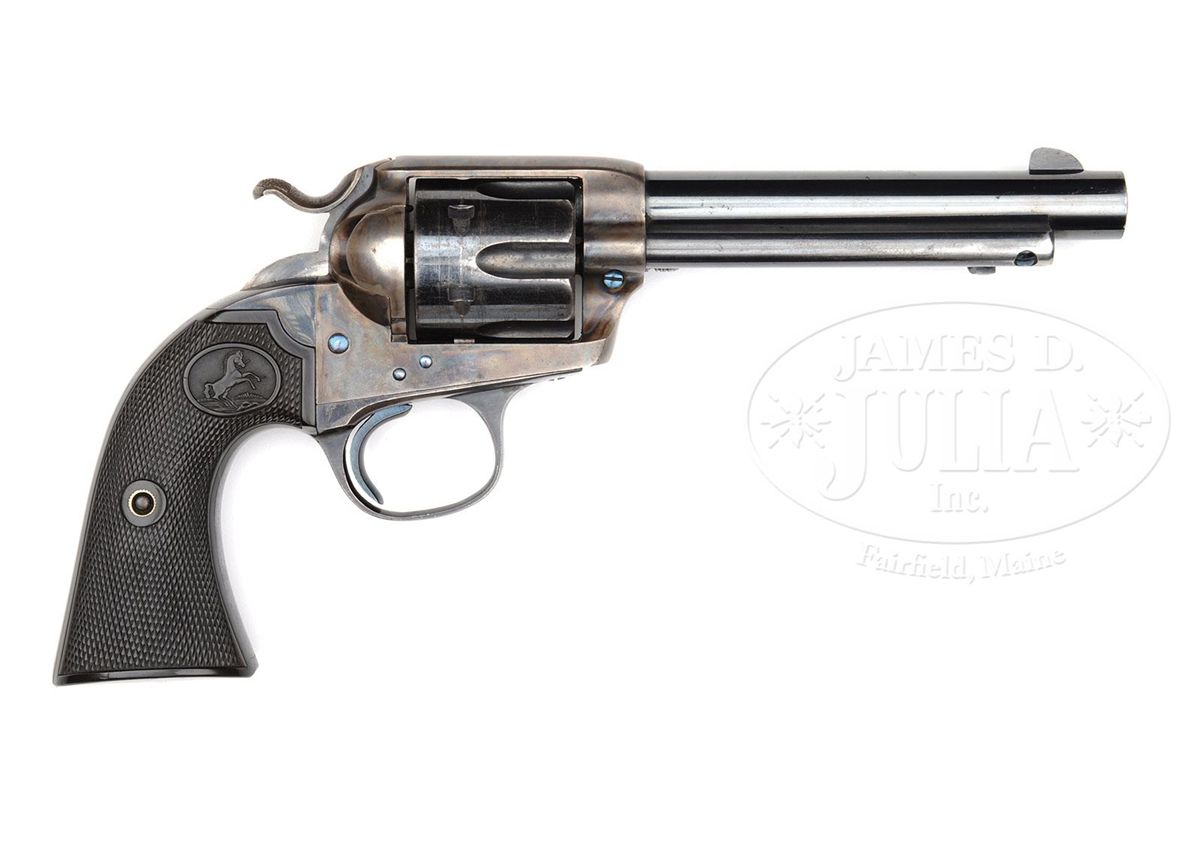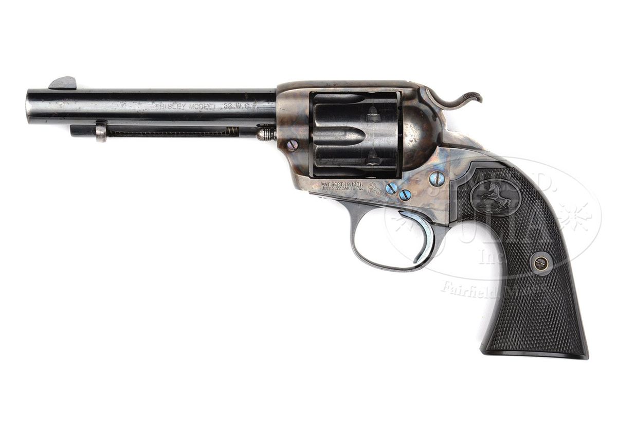 SN 264522. Cal. 32 WCF (32-20). Blue & color case hardened with 5-1/2" bbl, slightly altered front sight and 1-line block letter address, left side marked "(BISLEY MODEL)" with caliber marking. Left side of frame has 2-line, 3-patent dates and rampant Colt in a circle. Mounted with 2-pc rampant Colt hard rubber grips. CONDITION: Very fine. Bbl retains about 95% glossy orig blue and the ejector housing 92-93% orig blue; frame & hammer retain most of their strong orig case colors, bright in sheltered areas, moderately faded elsewhere; screws & trigger retain most of their orig fire blue; trigger guard retains most of its orig blue, slightly dulled on front strap; back strap retains bright blue at the top and on the butt strap with the center a plum/blue patina; cyl retains about 85% thinning orig blue. Grips are sound and show light diamond point wear. Mechanics are crisp, bright shiny bore. 4-48367 JR61