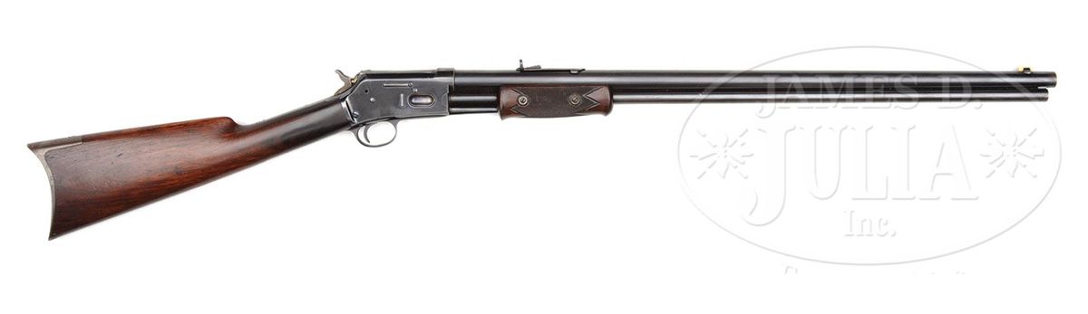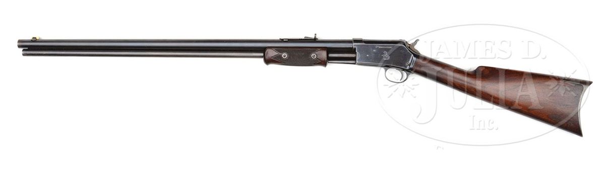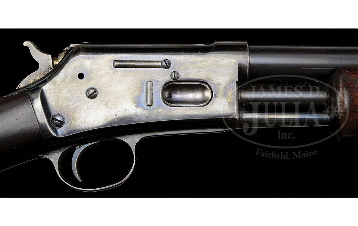 SN 69732. Cal. 32 WCF (32-20). Standard grade rifle with 26" rnd bbl, full magazine, ivory blade, Rocky Mountain style front sight and orig Colt semi-buckhorn rear sight. Left side of receiver has the rampant Colt roll marking and it is without manual safety, relying on the safety notch of the hammer. Mounted with very nicely figured, uncheckered, slab-sawed American walnut buttstock with straight grip & crescent buttplate. Forearm is checkered with dbl schnables. The medium frame Lightning was the highest production of Colt's pump actin rifles and also the model which saw the most and continuous service. Rarely are they found with high orig finish. CONDITION: Extremely fine. No disassembly was affected to check for matching parts. Bbl & magazine tube retain about 98% strong orig blue with only muzzle end wear, a couple of dings on magazine tube, which is turning a little plum color on outer radius; receiver retains 95-96% slightly thinned glossy orig blue with light sharp edge wear; hammer retains about all of its bright case colors. Stock is missing a tiny sliver on each side of top tang and has a few very minor handling & storage nicks & scratches and retains about all of its orig oil finish, turned dark around the wrist; forearm shows light edge wear and a few chipped diamonds and overall retains about all of its orig oil finish. Mechanics are crisp, bright shiny bore with slight frosting in the grooves. 4-49661 JR315