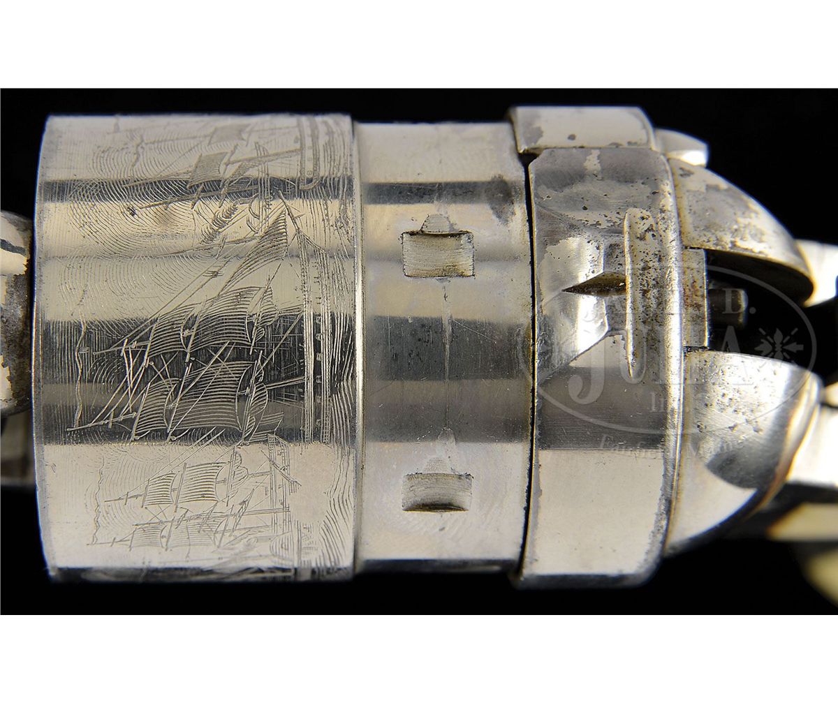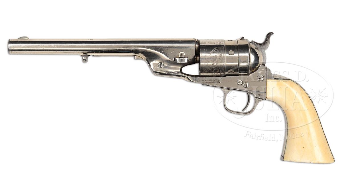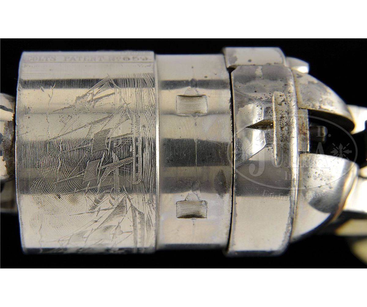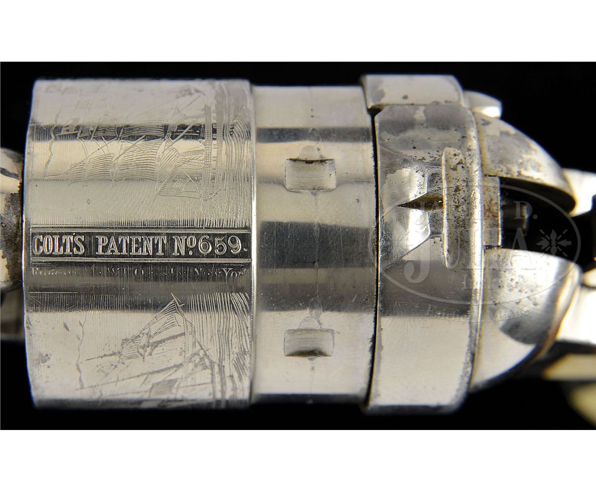 SN 5659. Cal. 44 Colt. Nickel finish with 8" bbl, slightly reduced front sight and 1-line address. Left side of frame has 2-line patent dates and caliber marking on left shoulder of trigger guard. Mounted with beautiful, orig, 1-pc ivory grip made from two slabs of ivory attached to two wood spacers in the orig manner to make a solid 1-pc grip. Inside right ivory is marked with matching SN. Rebated 6-shot cyl has the Ormsby Naval battle scene roll marking. According to Flayderman's Guide to Antique American Firearms only about 9,000 of these predecessors to the venerable Model 1873 Single Action Army were produced in the period 1873-1878. They became very popular on the American frontier and are rarely found today with high orig finish. CONDITION: Very fine, all matching except wedge & grip which are unnumbered and cyl spindle which is numbered "1178"; overall retains 96-98% strong nickel finish with muzzle edge wear and some candy striping on the frame; cyl retains about all of its strong orig nickel and shows 97-98% Ormsby Naval battle scene; grip is sound with a few age lines on bottom edges and overall retains a wonderful, mellow ivory patina. Mechanics are fine, strong bright bore with scattered pitting. 4-49300 JR407