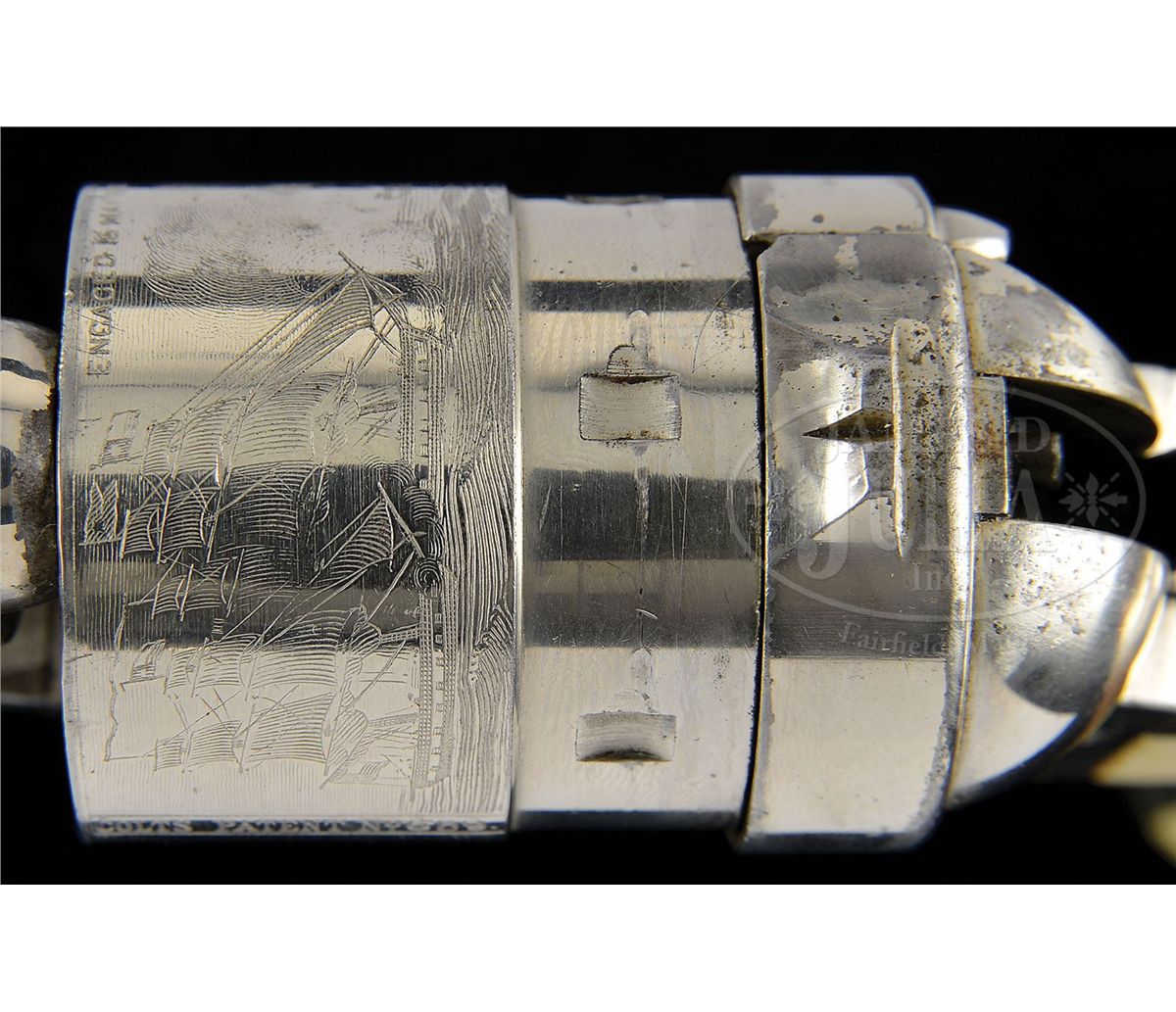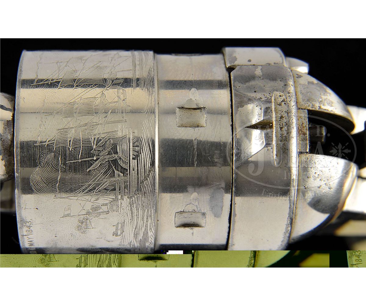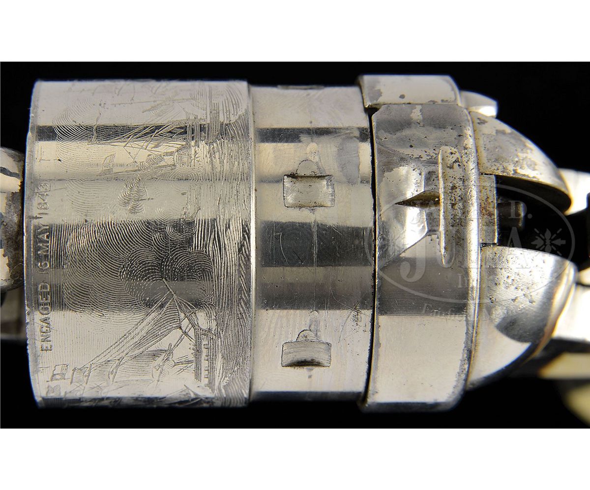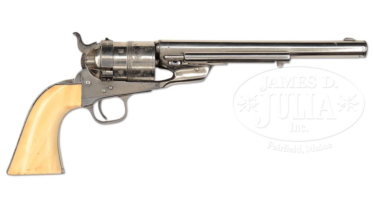 SN 5659. Cal. 44 Colt. Nickel finish with 8" bbl, slightly reduced front sight and 1-line address. Left side of frame has 2-line patent dates and caliber marking on left shoulder of trigger guard. Mounted with beautiful, orig, 1-pc ivory grip made from two slabs of ivory attached to two wood spacers in the orig manner to make a solid 1-pc grip. Inside right ivory is marked with matching SN. Rebated 6-shot cyl has the Ormsby Naval battle scene roll marking. According to Flayderman's Guide to Antique American Firearms only about 9,000 of these predecessors to the venerable Model 1873 Single Action Army were produced in the period 1873-1878. They became very popular on the American frontier and are rarely found today with high orig finish. CONDITION: Very fine, all matching except wedge & grip which are unnumbered and cyl spindle which is numbered "1178"; overall retains 96-98% strong nickel finish with muzzle edge wear and some candy striping on the frame; cyl retains about all of its strong orig nickel and shows 97-98% Ormsby Naval battle scene; grip is sound with a few age lines on bottom edges and overall retains a wonderful, mellow ivory patina. Mechanics are fine, strong bright bore with scattered pitting. 4-49300 JR407