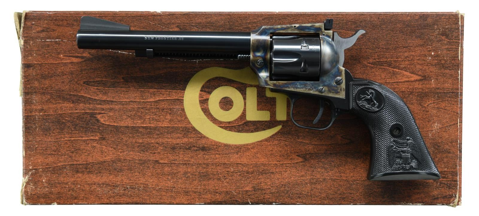 FACTORY BOX. Cal. .22 LR. S# G193957. Bbl 6". New Frontier manufactured by Colt in 1976. The left side of the barrel is stamped "NEW FRONTIER .22" with Colt's single line address across the top. Left side of frame bears patent information followed by the Rampant Colt logo. Frame is case color hardened, with the barrel and cylinder being blued, and the aluminum grip frame exhibiting an anodized black finish. Serrated ramp front sight with adjustable square notch rear sight. Frame is mounted with 2 piece Colt checkered black plastic grips. UNATTACHED ACCESSORIES: matching factory box containing its styrofoam insert, a .22 Magnum cylinder, as well as factory paperwork. CONDITION: extremely fine, with metal components retaining bountiful amounts of their original factory applied finishes overall. Mirror bore, exhibiting well defined rifling throughout. Grips are excellent. Box shows some mild exterior wear, but is otherwise very good. (23-1777/MLW). MODERN. $500-750.