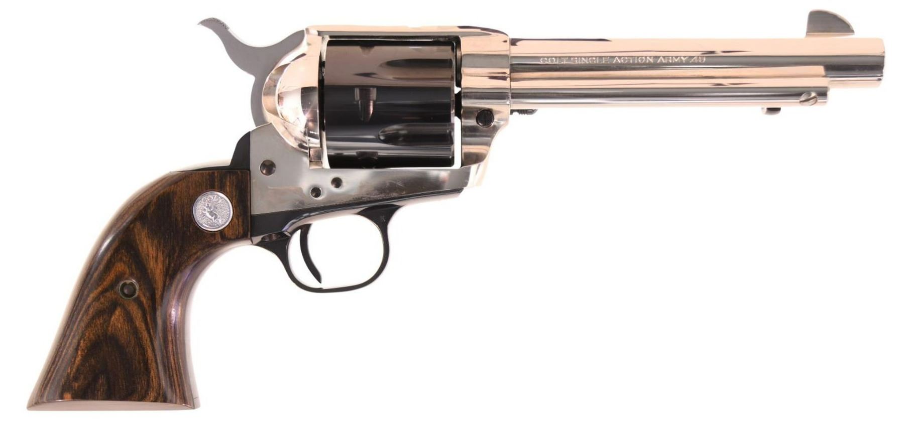 ARMY REVOLVER WITH DISPLAY CASE. Cal. 45 Colt. S# 0155JT. Bbl. 5 1/2". New Jersey Tercentenary commemorative Single Action Army revolver mfg. by Colt. The left side of the bbl. is marked "1664 - NEW JERSEY TERCENTENARY - 1964", with "COLT SINGLE ACTION ARMY .45" marked across the right. The left side of the frame is marked with Colt's patent information, followed by the Rampant Colt logo. Frame, bbl., and ejector rod housing exhibit a nickel plated finish. Cyl., cyl. base pin, ejector rod, frame screws, trigger guard, and rear grip strap exhibit a blue finish. Frame is mounted with 2-piece Colt silver medallion laminated wood grips. UNATTACHED ACCESSORIES: wood New Jersey Tercentenary commemorative display case. CONDITION: near new, with metal components retaining virtually all of their original factory finishes, exhibiting areas of what appears to be dried factory grease overall. Brilliant mirror bore, exhibiting well defined rifling throughout. Grips are excellent. Display case shows some minor superficial marks from handling and storage, but otherwise is very good overall. An extremely fine example of a Colt Single Action Army New Jersey Tercentenary revolver that one would find to be an extremely difficult example to upgrade from. (23-5617/MLW). CURIO. $600-900.