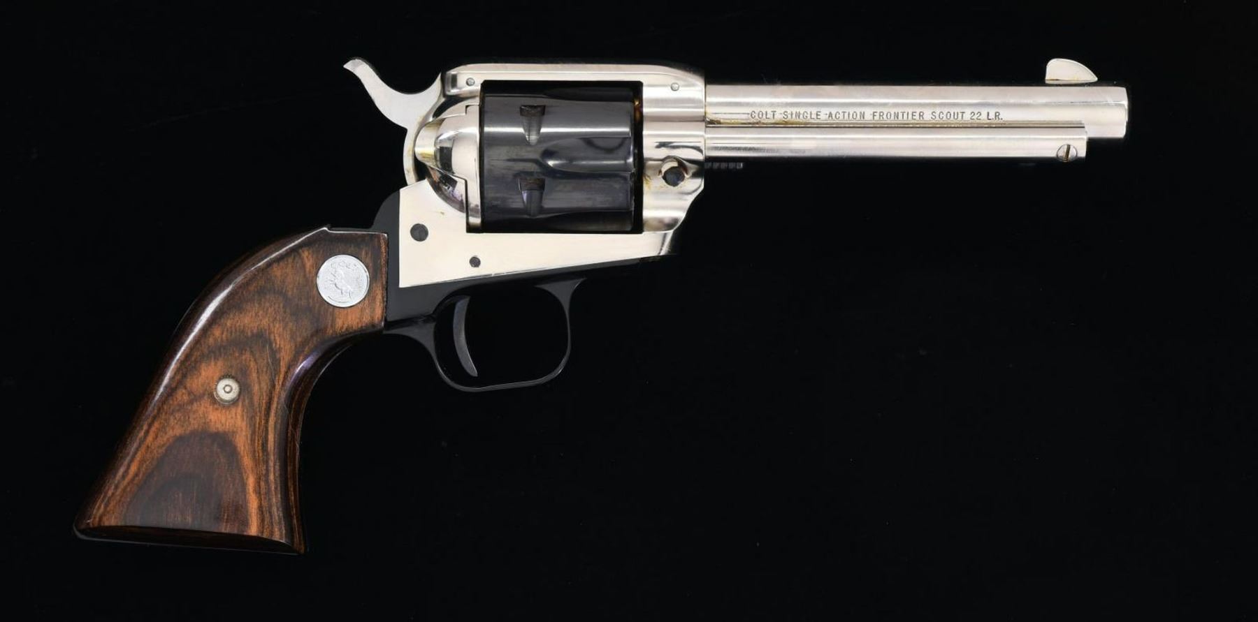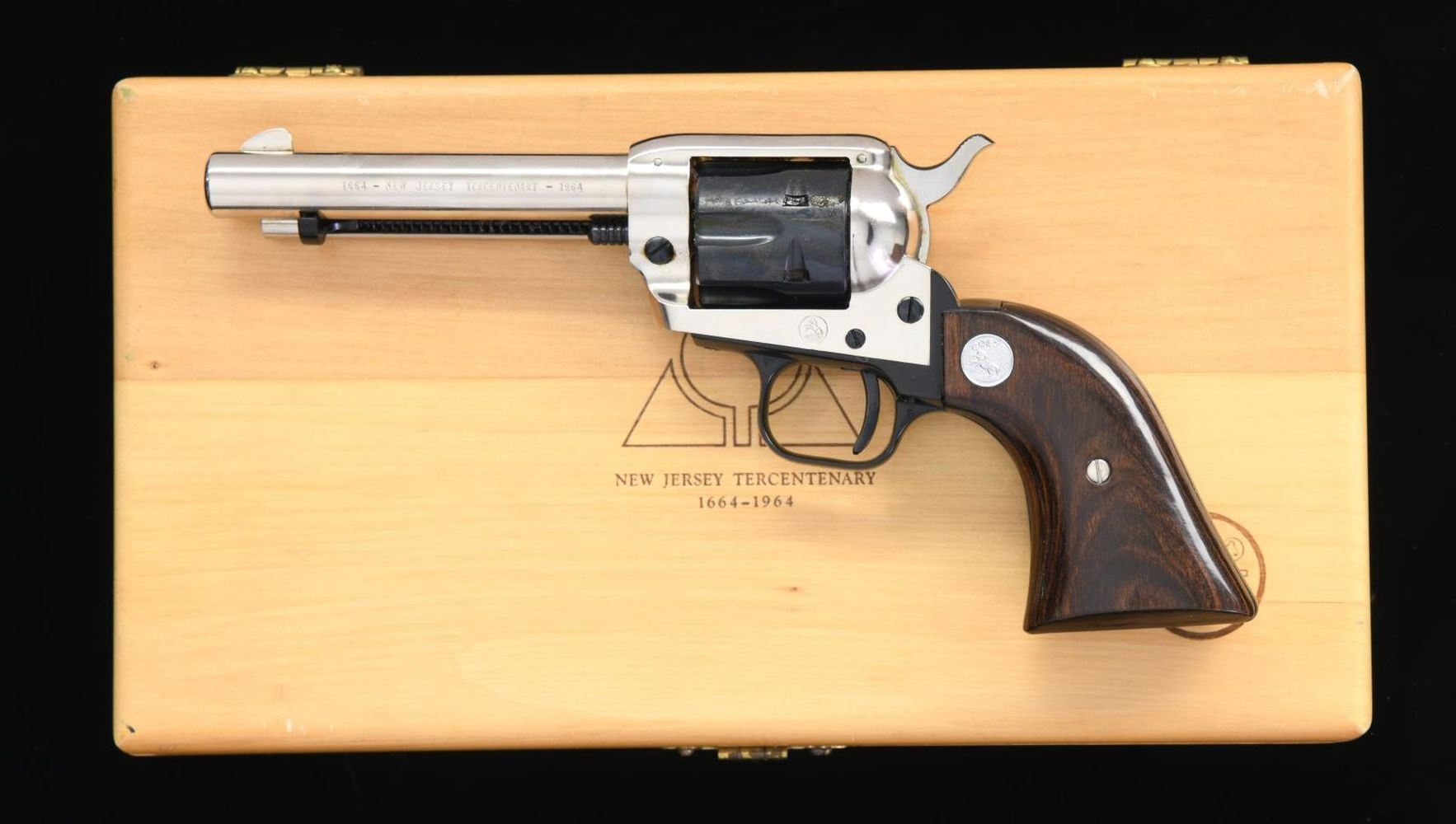 FRONTIER SCOUT REVOLVER WITH DISPLAY CASE. Cal. 22 LR. S# 0172NJ. Bbl. 4 3/4". New Jersey Tercentenary commemorative Frontier Scout single action revolver mfg. by Colt. The left side of the bbl. is marked "1664 - NEW JERSEY TERCENTENARY - 1964", with "COLT SINGLE ACTION FRONTIER SCOUT 22 L.R." marked on the right. Left side of frame exhibits the encircled Rampant Colt standing atop a globe logo. Aluminum frame exhibits a seemingly nickel plated aluminum finish, with the steel hammer, bbl., and ejector rod housing exhibiting a nickel plated finish. Cyl., cyl. base pin, ejector rod, frame screws, and trigger exhibit a blued finish. Black anodized aluminum trigger guard and rear grip strap are mounted with Colt silver medallion laminated wood grips. Blade front sight with frame notched rear sight. UNATTACHED ACCESSORIES: Colt factory New Jersey Tercentenary wood display case. CONDITION: fine, with metal components retaining virtually all of their original factory finishes overall, exhibiting areas of grease that is predominately on the cyl. Mirror bore, exhibiting a layer of grease and retaining well defined rifling throughout. Grips are excellent. Case exhibits some mild marks from handling and storage, but otherwise remains sturdy and serviceable. An extremely fine example of a Colt New Jersey Tercentenary commemorative Frontier Scout revolver. (23-5629/MLW). CURIO. $400-600.