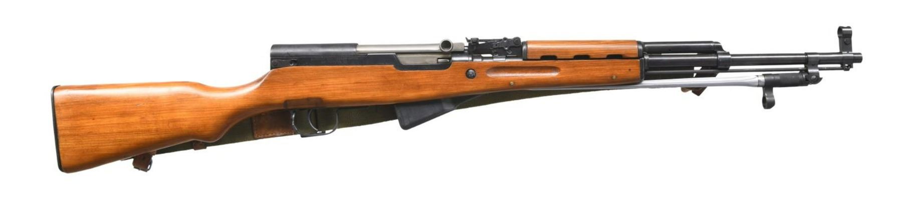 . Cal. 7.62x39. S# 11509500. All visible numbers match. Bbl. 20 5/8". Tangent rear sight graduated to 1000 meters. Post front sight with protective hood. Receiver Marked on left side with"Triangle 26" and three Chinese characters. The serial number indicates a manufacture date of 1967. The right side of the receiver is import marked as follows "NORINCO SKS 7.62x39 CHINA KSI POMONA, CA.". 12 1/4" folding spike bayonet. Cleaning rod is present. Unmarked hardwood stock set. Green web sling. UNATTACHED ACCESSORIES: cleaning kit in butt. CONDITION: all aspects including bore near excellent. (23-5782/RW). CURIO. $400-600.