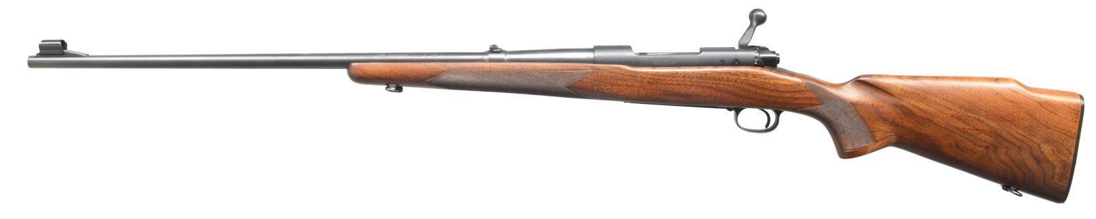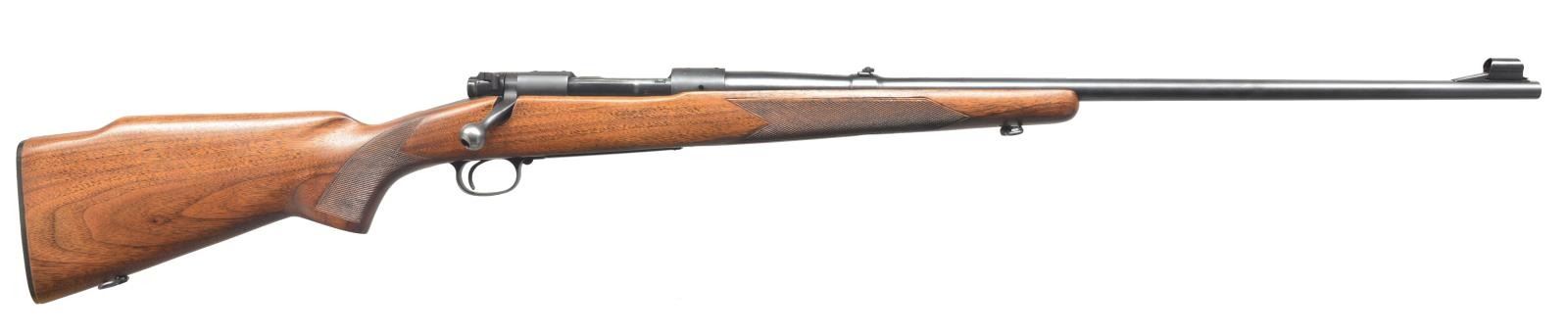 .264 WIN. MAG. "WESTERNER". Cal. .264 Win. Mag. S# 468918. Bbl. 26" Matte blued w/ flip up Lyman 16B sight & silver bead front sight in number 6 type striated ramp w/ hood. Typical action w/ polished bolt body has steel bottom metal w/ hinged floorplate. American walnut pistol grip Monte Carlo stock features plastic buttplate, sling loops, & point pattern checkering at grip & forend. CONDITION: metal parts retaining nearly all of what appears to be original blue w/ a few scattered light marks. Bolt knob silvering somewhat. Bolt shows little use. Stock has only a few marks in what appears to be its original finish, most noticeably a group of 10 or 12 sm. dents at bottom of forend. Sharp shiny bore. Mechanically good. (20-3973/MGM). CURIO. $1,200-1,800.