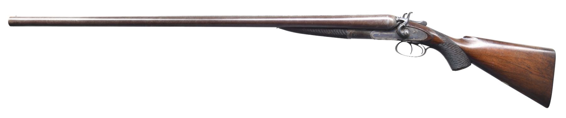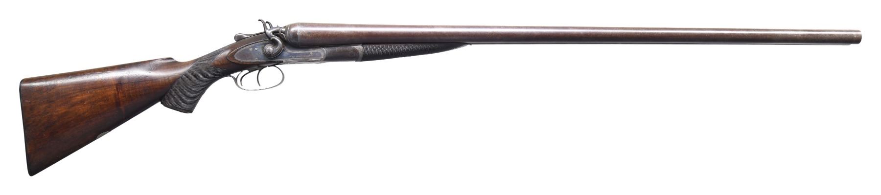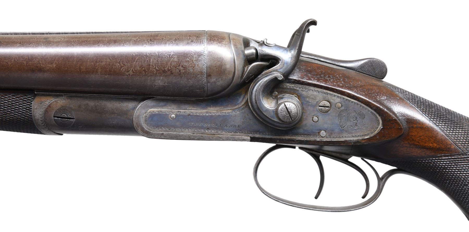 Cal. 8 Ga. S# 34418 (1885). This well made big gun has 34" two stripe broad damascus barrel engraved "W&C. Scott & Son Makers & Patentees, London." on concave game rib. Bottoms of barrels are stamped with Birmingham black powder proofs along with bore and muzzle info and "NOT FOR BALL". Case hardened top lever action is fitted with front spring locks with rebounding serpentine hammers. Action has line border engraving while locks have scroll borders with portrait of dog at rear of left lock. Both locks are engraved with maker's name. Steel trigger guard has Scott lighthouse logo and S# on tang that extends to horn grip cap. Capped pistol grip buttstock of lightly figured European walnut measures 14-1/8" over checkered horn buttplate, point pattern checkering runs over top of grip and a vacant silver oval is on toeline. Matching short splinter forend has Scott patent front lever release. MEASUREMENTS: STOCK: DAH: 3-3/16". DAC: 1-15/16. CAST: about 1/4" off. LOP: 14-1/8". WEIGHT: 12 lb. 8 oz. CONDITION: fine to very fine. Barrels retaining over 60% original brown. Action has most of its original case color. Locks have over 90% color. Stocks retain most of their original oil finish with some marks and scratches. Checkering is lightly worn. Bores are bright and shiny without noted problems. Action is tight. Locks crisp. An unusual high condition waterfowler; most are in poor condition as a result of being used in adverse environments. (01-26977/MGM). ANTIQUE. $3,000-5,000.