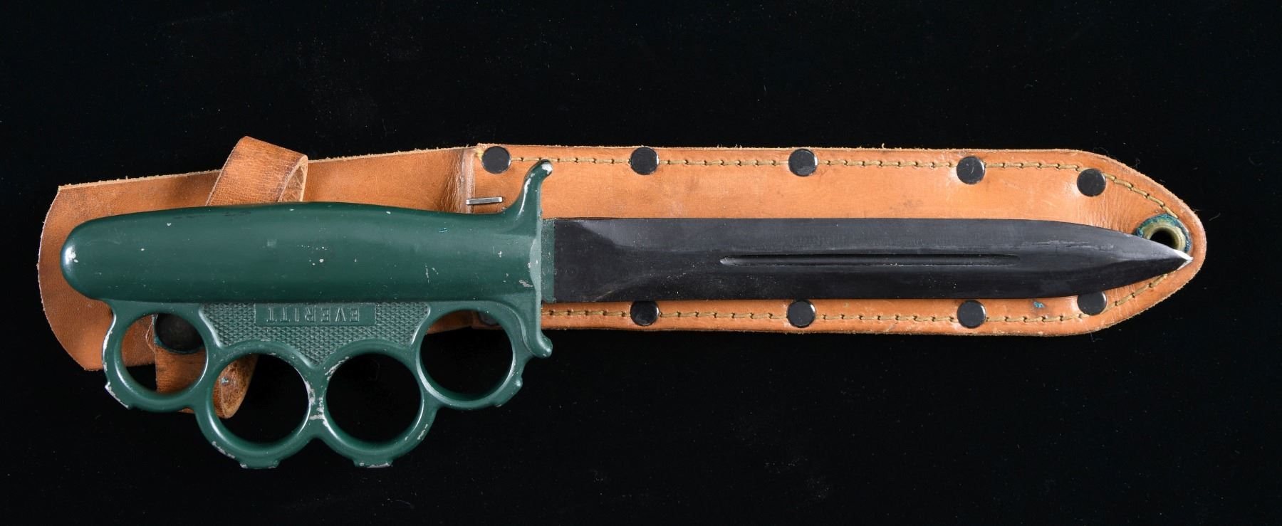 7" Double edge fullered blade with black finish. 12" overall. Dark green painted alloy handle with four finger loops. Loops have raised square points. Cast handle is marked "EVERITT" on both sides in raised letters within the checkered web. Tan leather sheath with snap closed retaining strap. Correct 6 staples at the throat. Brass lanyard hole at tip. CONDITION: knife retains 75% of its original black and green finish with light wear and flaking. Blade tip has been lightly sharpened. Sheath has very light wear and staining with some verdigris around snap and lanyard hole. Stitching is tight. (02-23686/RW). NON GUN. $1,000-1,500.