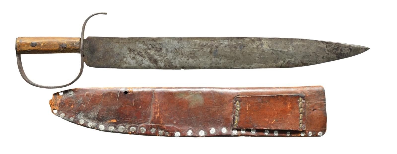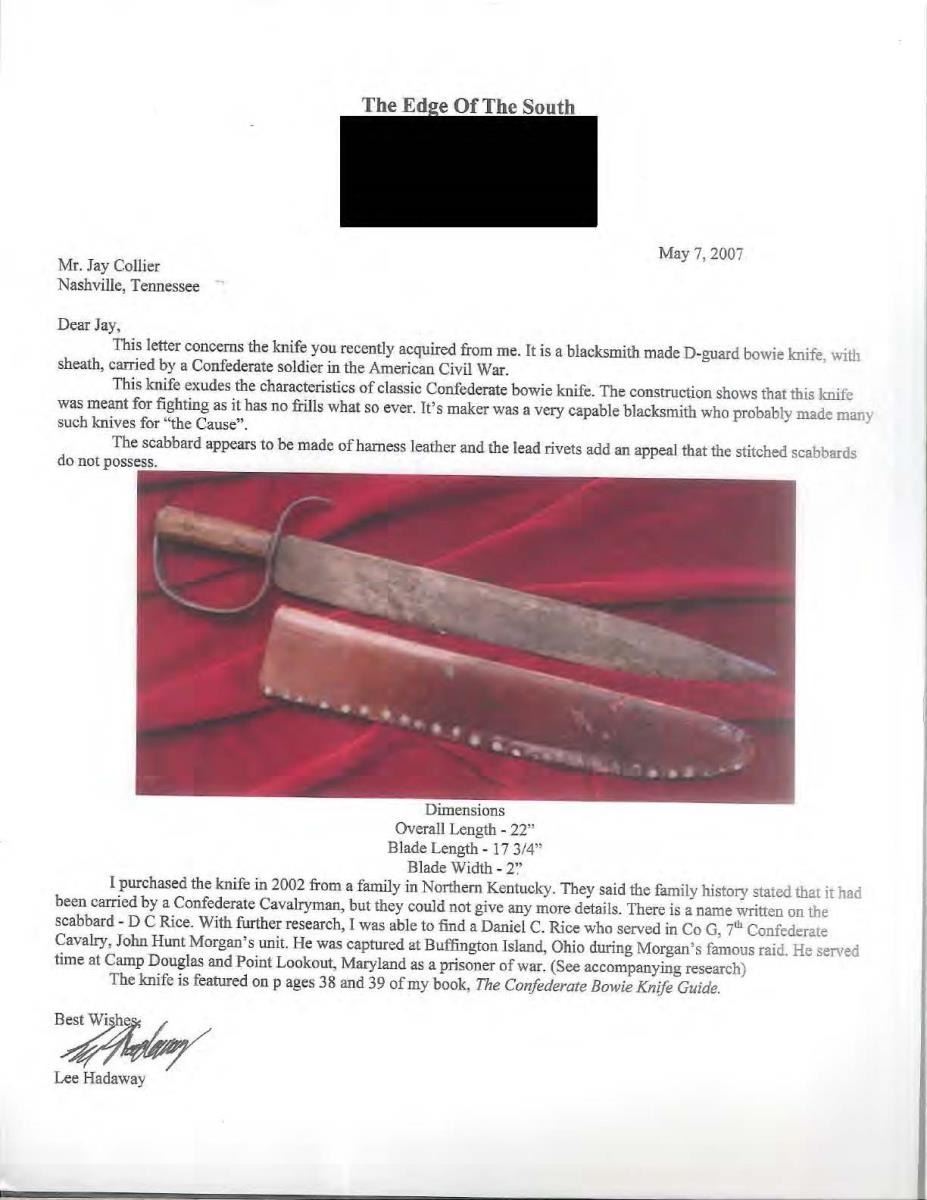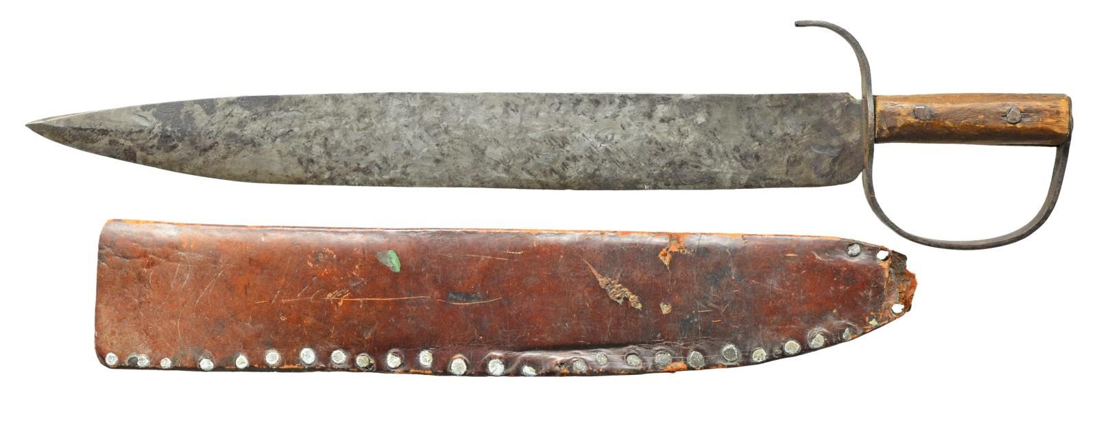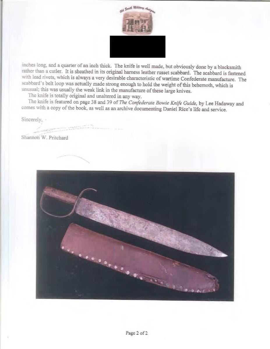 DANIEL C. RICE, 7TH KENTUCKY CAVALRY, JOHN HUNT MORGAN’S COMMAND. Classic massive Confederate D-guard, 17.75" blade, 2" wide, .3" thick. This is a big knife made for only one purpose, “kill Yankees”. Knife has been well preserved in wonderful “as-found” condition including classic lead riveted leather scabbard inscribed “D. C. Rice”. This knife was found in Northern Kentucky in 2002 & the family only knew that it belonged to a Confederate Cavalryman. There are 2 Confederate cavalrymen w/ same initials & last name, one in the 27th Texas Cavalry (David C. Rice) & another in 7th & 11Th Kentucky Cavalry which was recruited in Kentucky, so most likely this was Daniel C Rice’s knife. UNATTACHED ACCESSORIES: binder containing 2 letters of provenance from Shannon Pritchard & Lee Hadaway. The "Confederate Bowie Knife Guide" by Lee Hadaway 2004. The knife is pictured & described on pages 38 & 39 of this text. CONDITION: very good overall, blade retains original tool marks & appears to be as it was originally made, gray w/ scattered staining & light pitting. D-guard is also uncleaned w/ iron patina. 2 Wood slabs forming grip are sound w/ light scuffing, some shrinkage. The original heavy brown leather sheath retains rawhide sewn belt loop w/ name easily discerned. Rivets have lead patina. Last inch of sheath is broken & missing at tip. Exemplary condition for Confederate local made bowie. (02-14830/JS). $5,000-7,000.