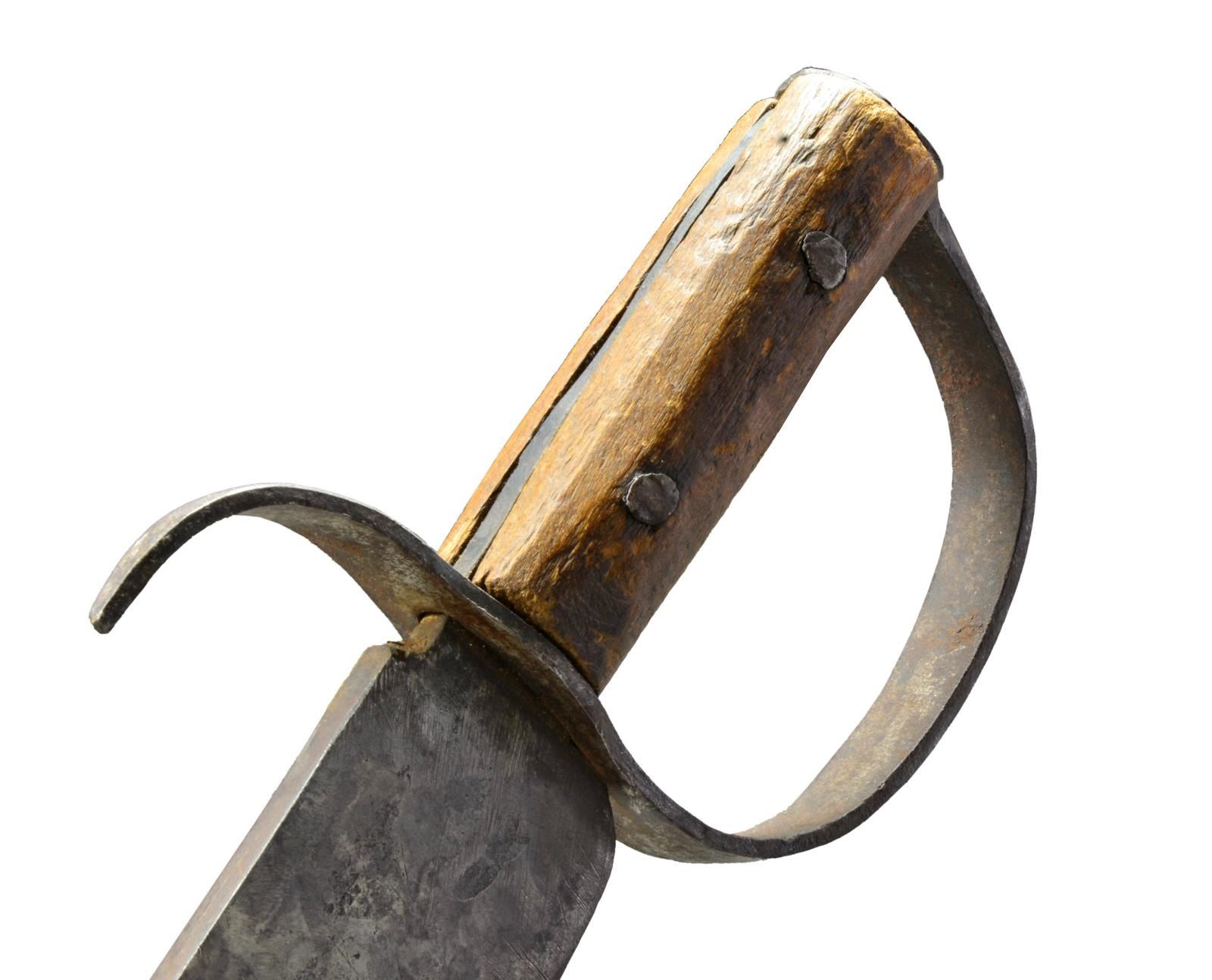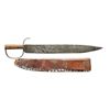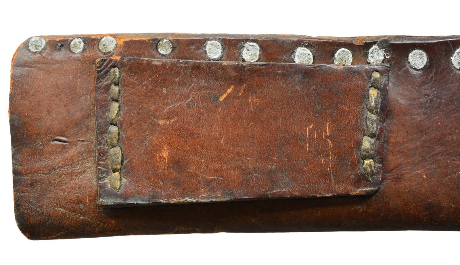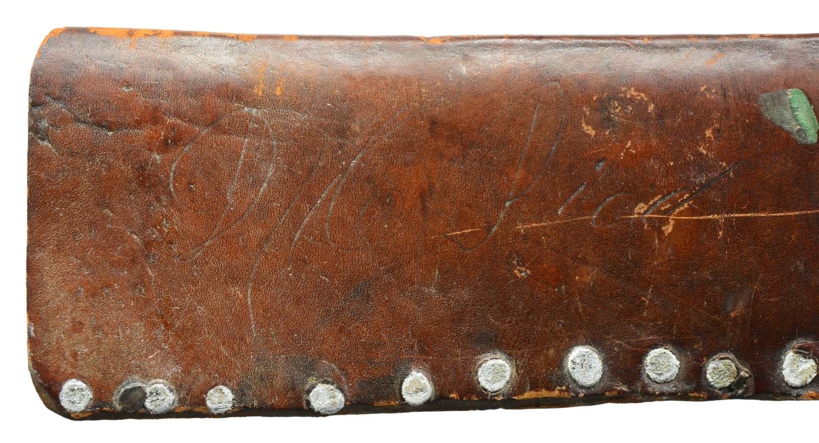 DANIEL C. RICE, 7TH KENTUCKY CAVALRY, JOHN HUNT MORGAN’S COMMAND. Classic massive Confederate D-guard, 17.75" blade, 2" wide, .3" thick. This is a big knife made for only one purpose, “kill Yankees”. Knife has been well preserved in wonderful “as-found” condition including classic lead riveted leather scabbard inscribed “D. C. Rice”. This knife was found in Northern Kentucky in 2002 & the family only knew that it belonged to a Confederate Cavalryman. There are 2 Confederate cavalrymen w/ same initials & last name, one in the 27th Texas Cavalry (David C. Rice) & another in 7th & 11Th Kentucky Cavalry which was recruited in Kentucky, so most likely this was Daniel C Rice’s knife. UNATTACHED ACCESSORIES: binder containing 2 letters of provenance from Shannon Pritchard & Lee Hadaway. The "Confederate Bowie Knife Guide" by Lee Hadaway 2004. The knife is pictured & described on pages 38 & 39 of this text. CONDITION: very good overall, blade retains original tool marks & appears to be as it was originally made, gray w/ scattered staining & light pitting. D-guard is also uncleaned w/ iron patina. 2 Wood slabs forming grip are sound w/ light scuffing, some shrinkage. The original heavy brown leather sheath retains rawhide sewn belt loop w/ name easily discerned. Rivets have lead patina. Last inch of sheath is broken & missing at tip. Exemplary condition for Confederate local made bowie. (02-14830/JS). $5,000-7,000.