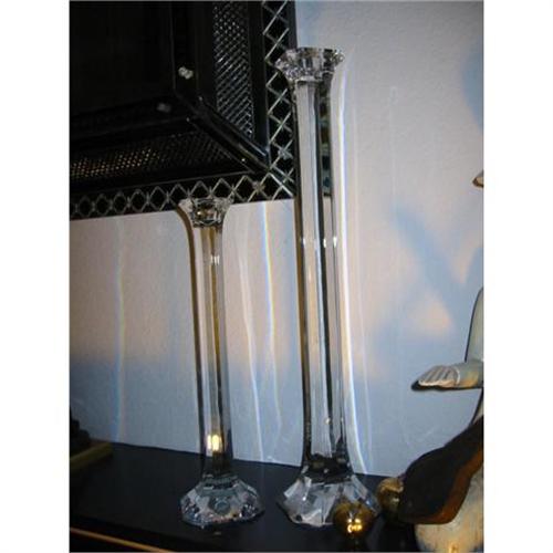 Fine Crystal Lenox Made in Germany set of two candle holders in excellent conditions. Never been used, and they are in Geometric Contemporary style. They are Tall. 20 inch with 4.5 inch in diameter and 2.5 inch on the top. The smaller is 14 inch in height and 4 inch in diam. They are labeled and are Lovely.
