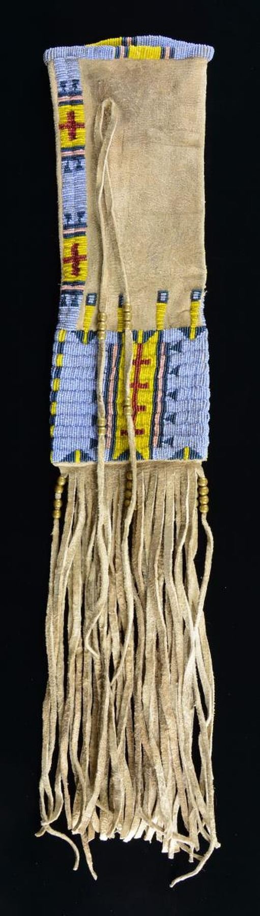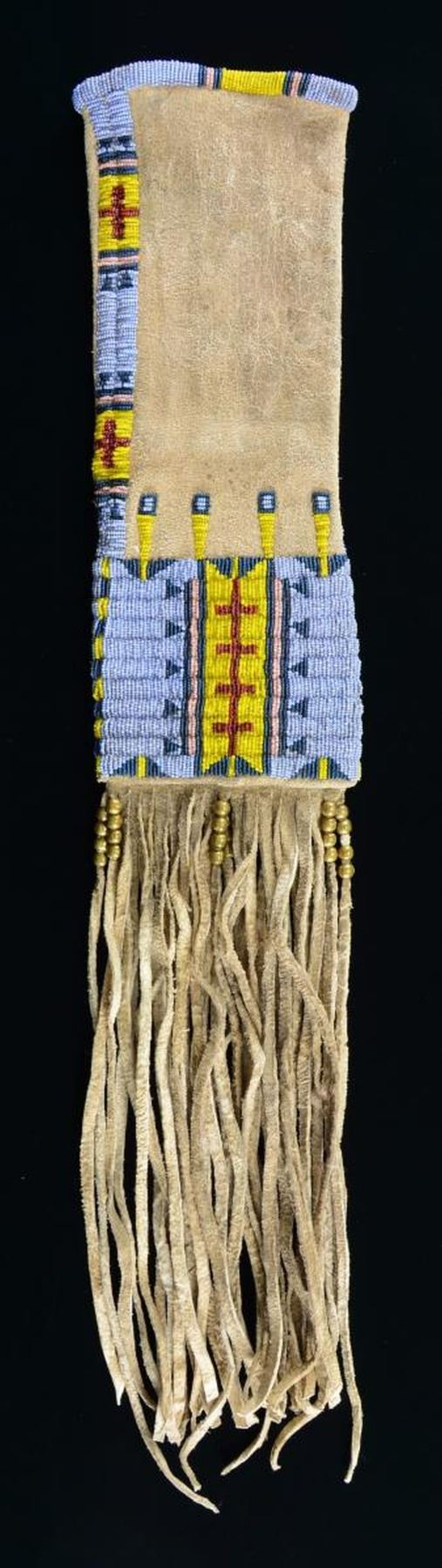 27” including fringe x 5.25”, thread sewn beaded throat & 4” x 5.25” panel beaded with sky blue mixed with gray ground, yellow, pink, and red, large brass beads on rawhide fringe. CONDITION: very good. (02-20999/JS). $500-600.