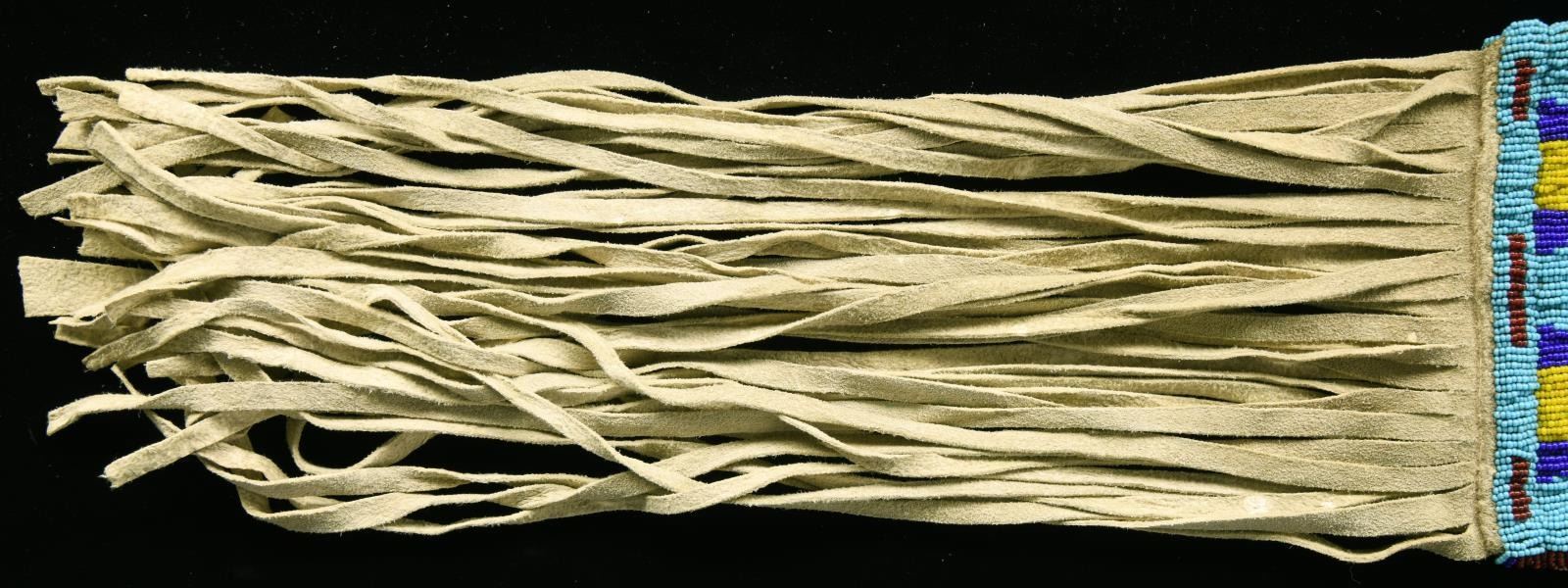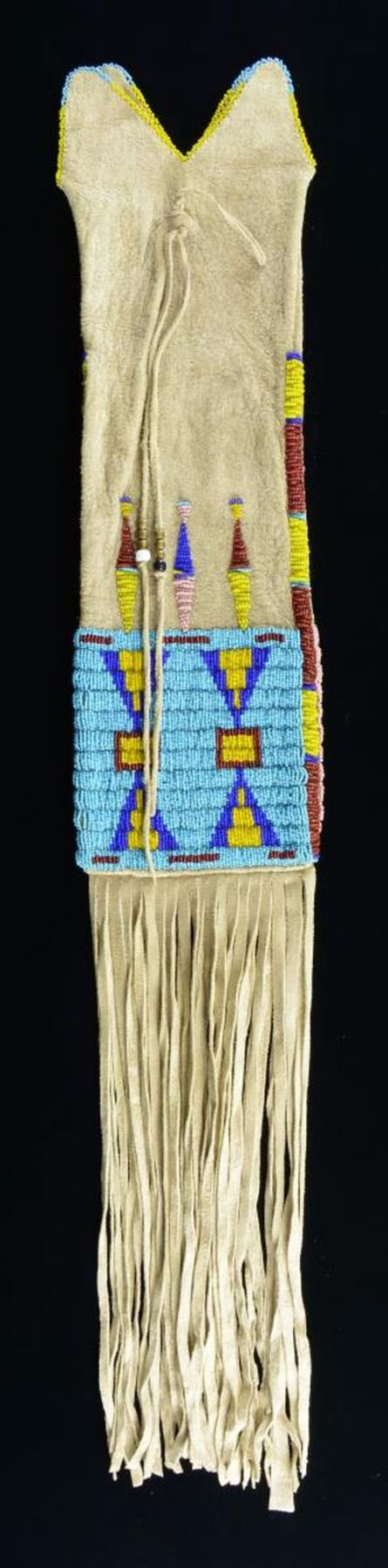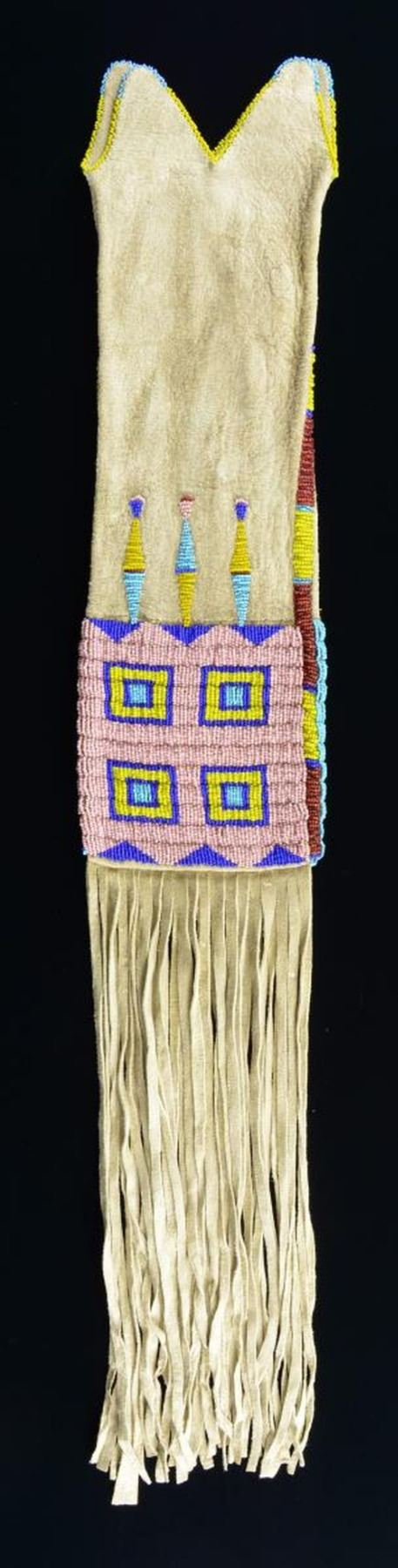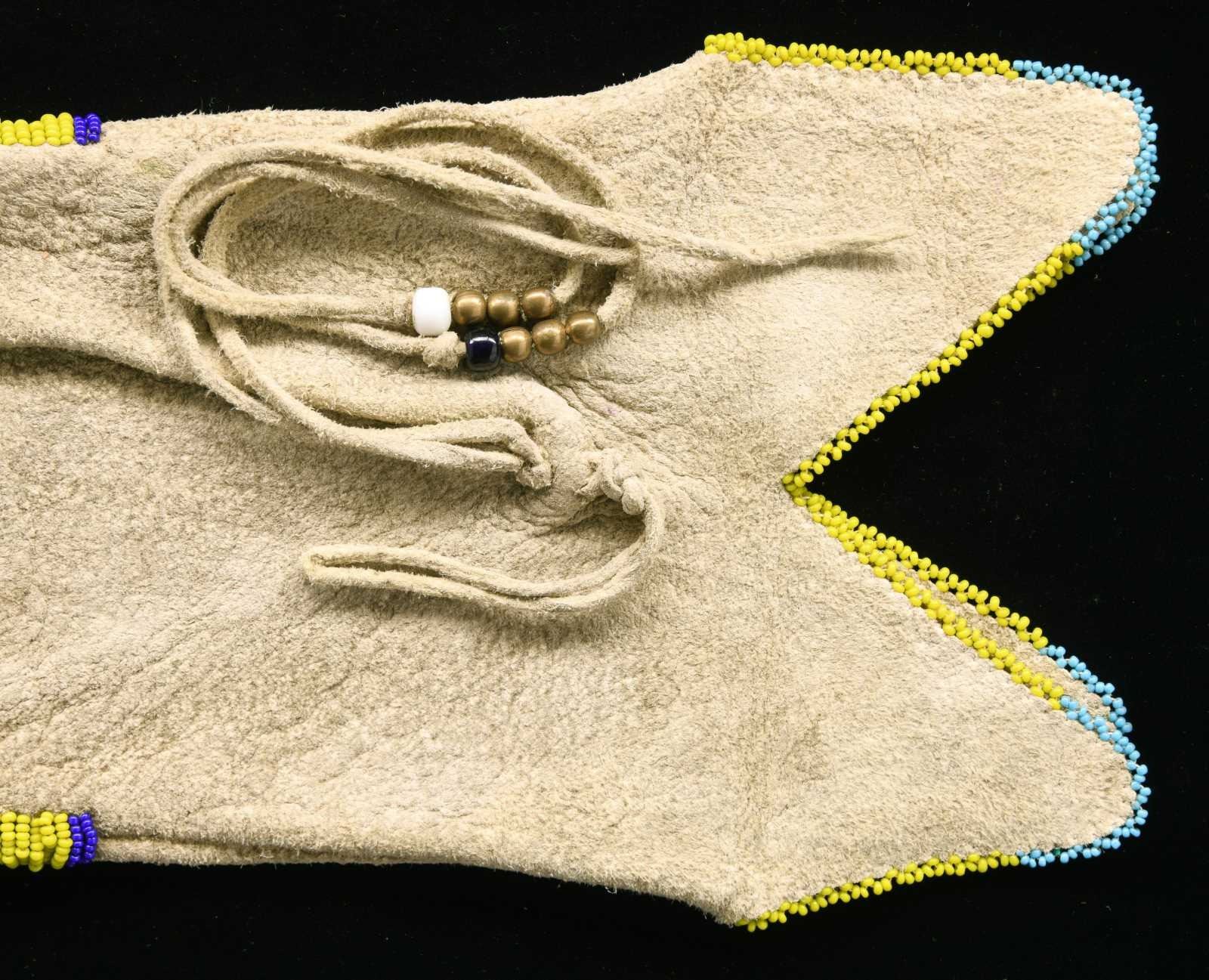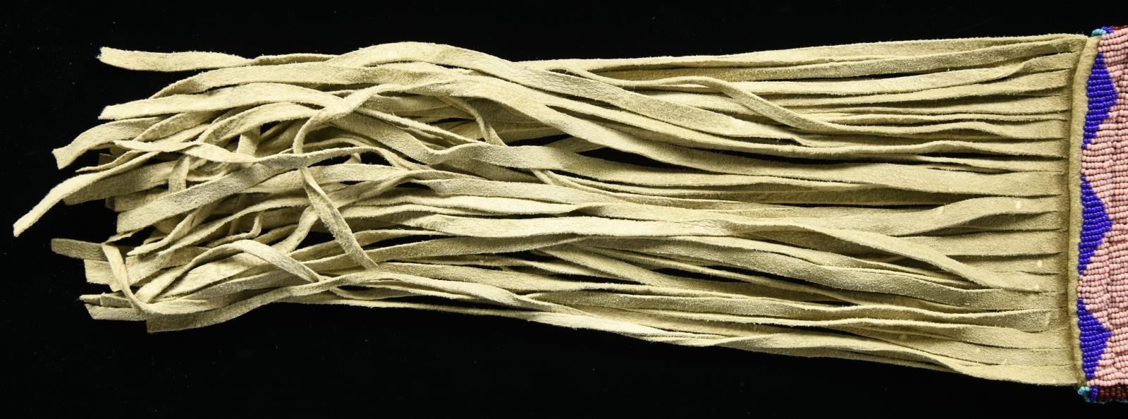 33” including fringe x 6” 4-branched blue & yellow bead thread sewn throat. Large 5.5” x 6” panel beaded with pink ground, yellow, blues, and red. CONDITION: very good. (02-21000/JS). $500-600.