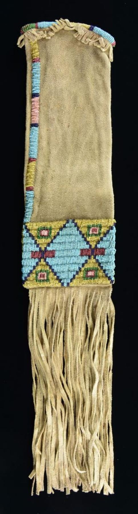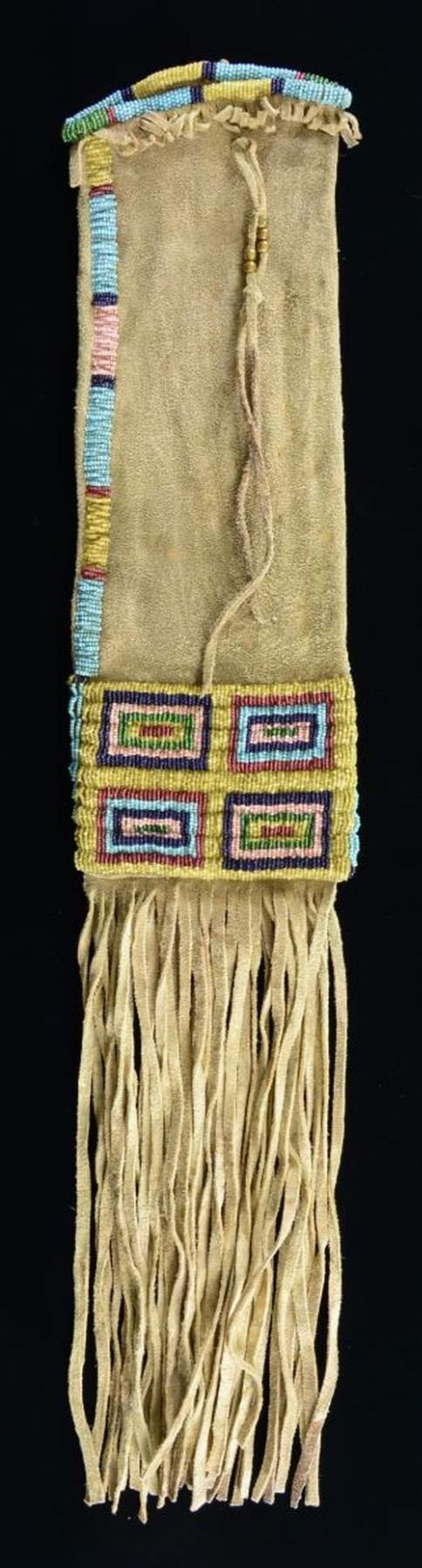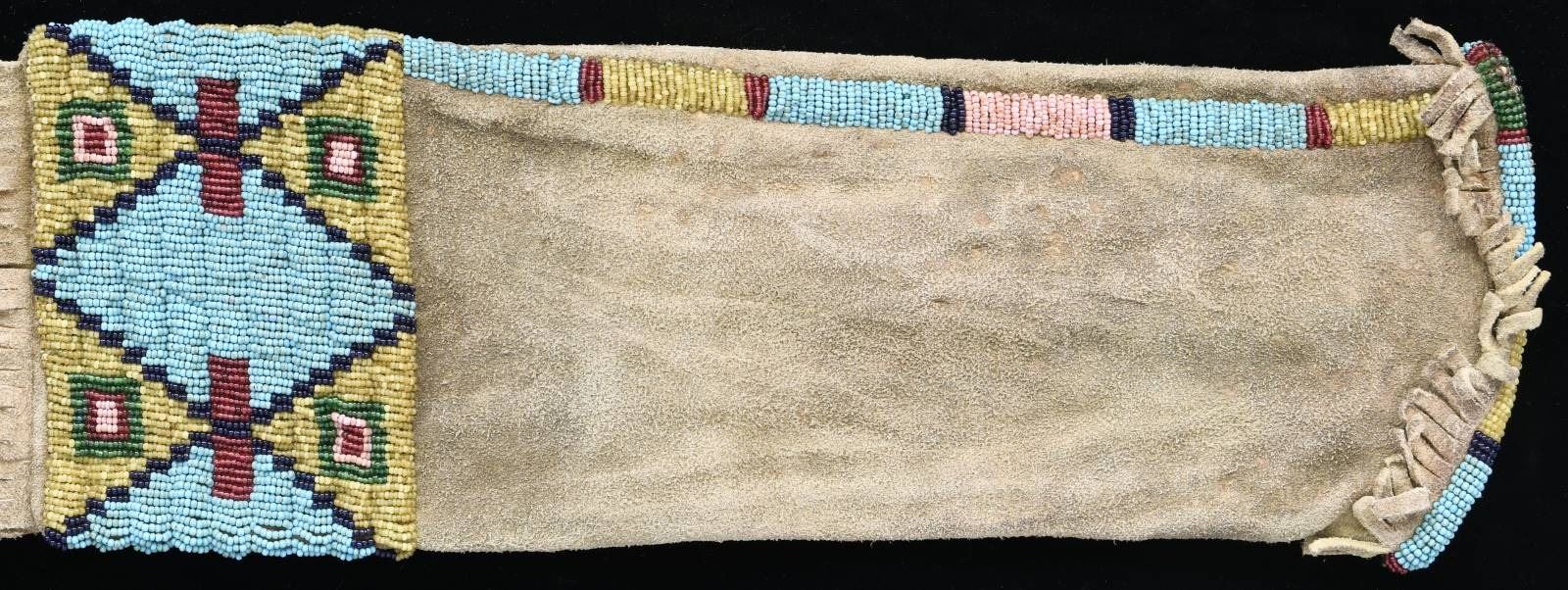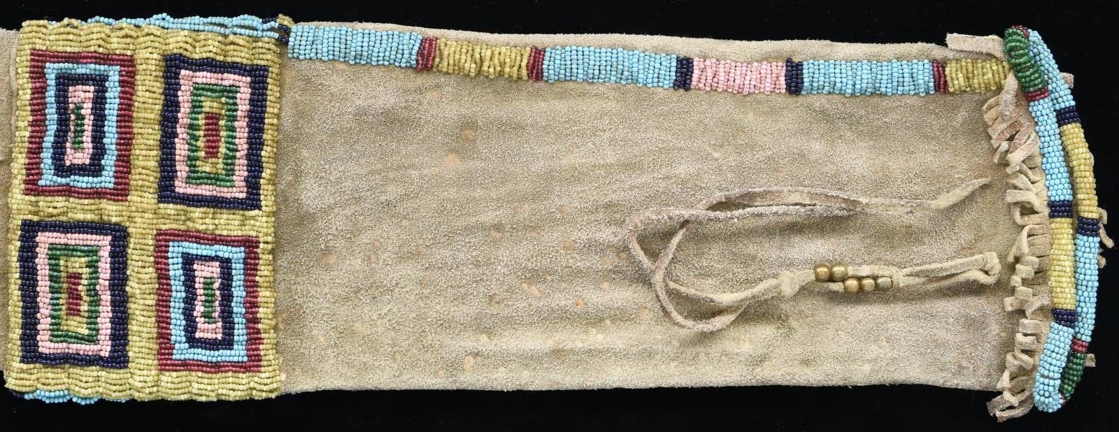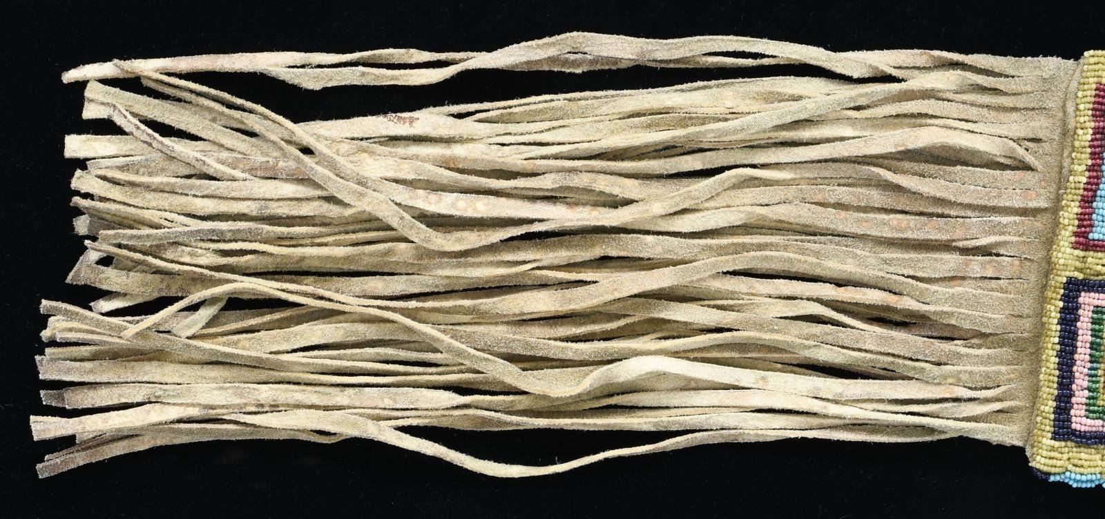 26” including fringe x 5.25”, thread sewn beaded throat & 4” x 5.25” panel beaded with yellow ground, blues, pink, and red. CONDITION: very good. (02-21002/JS). $500-600.