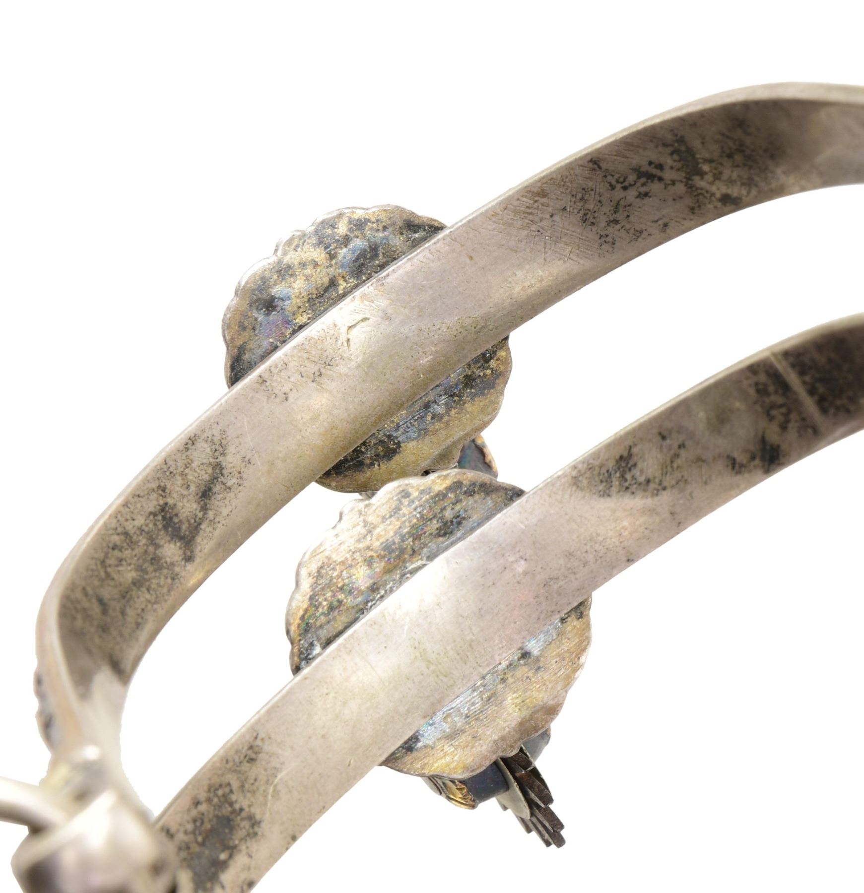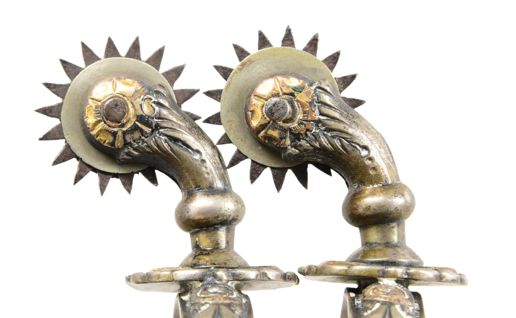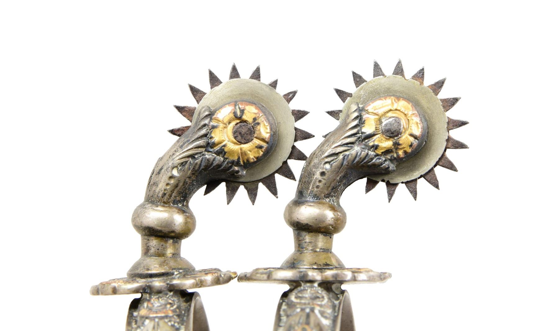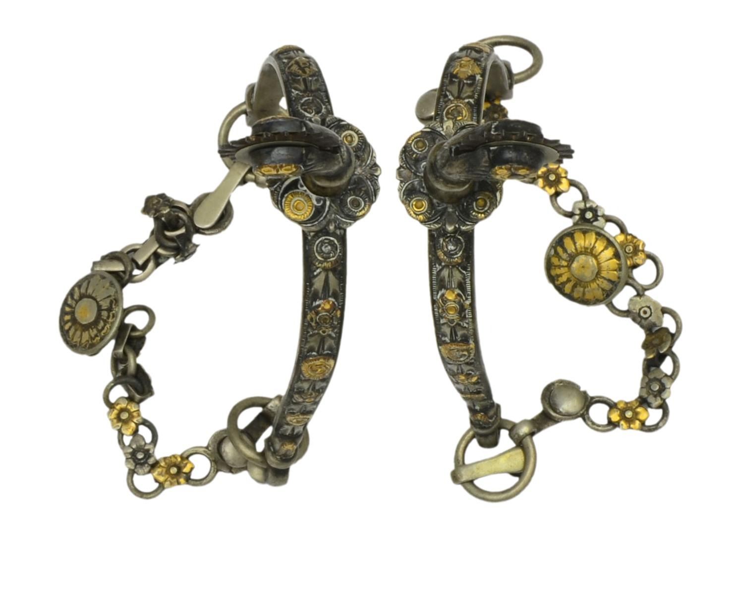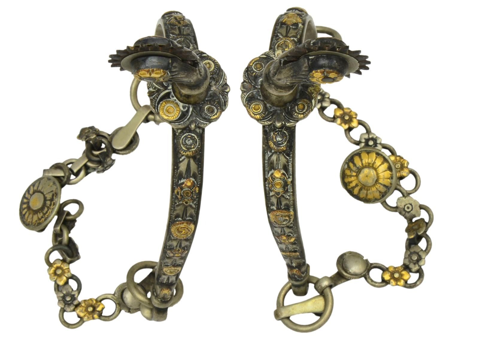 Southwestern or South American, German silver, silver plate with gold floral accents; chained boot attachments with same design. CONDITION: good overall, old polishing and wear. PROVENANCE: Martin Lane Historic & Western Americana Lifetime Collection. (02-21682/JS). $300-500.