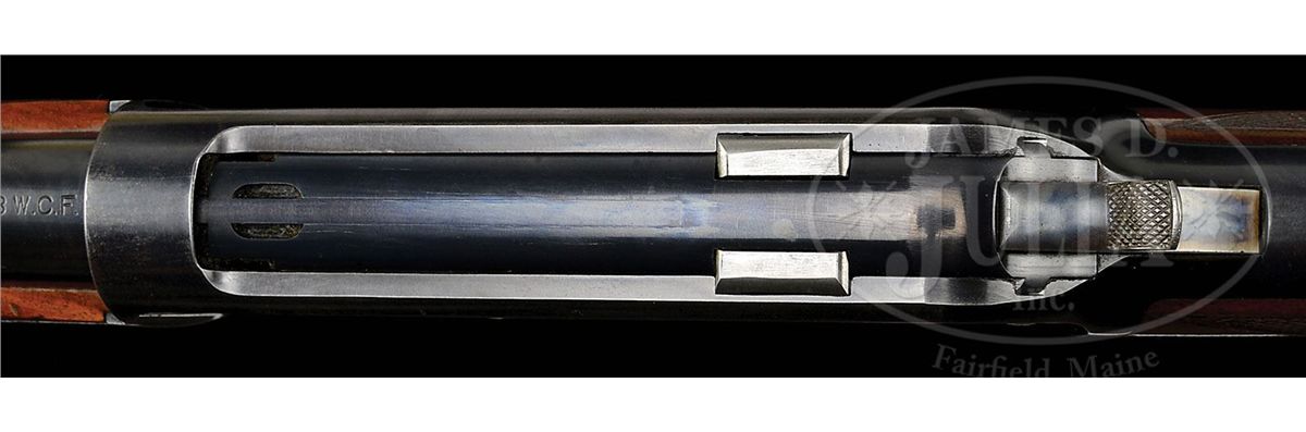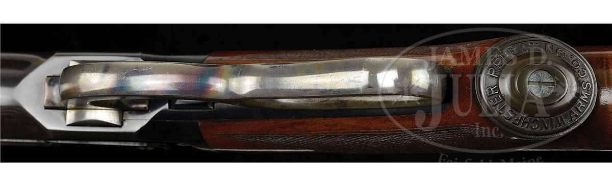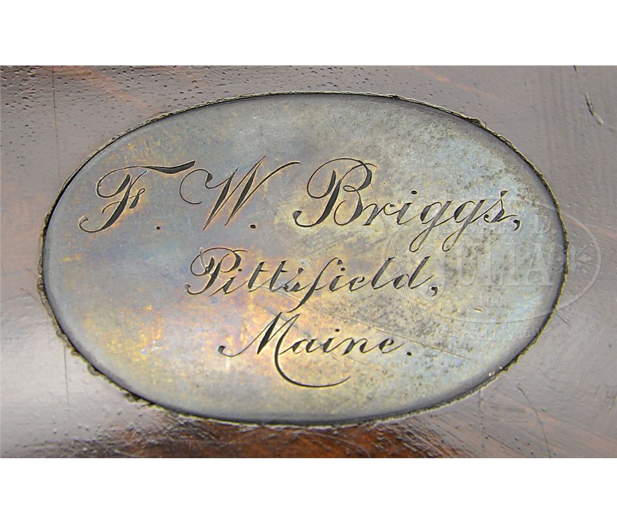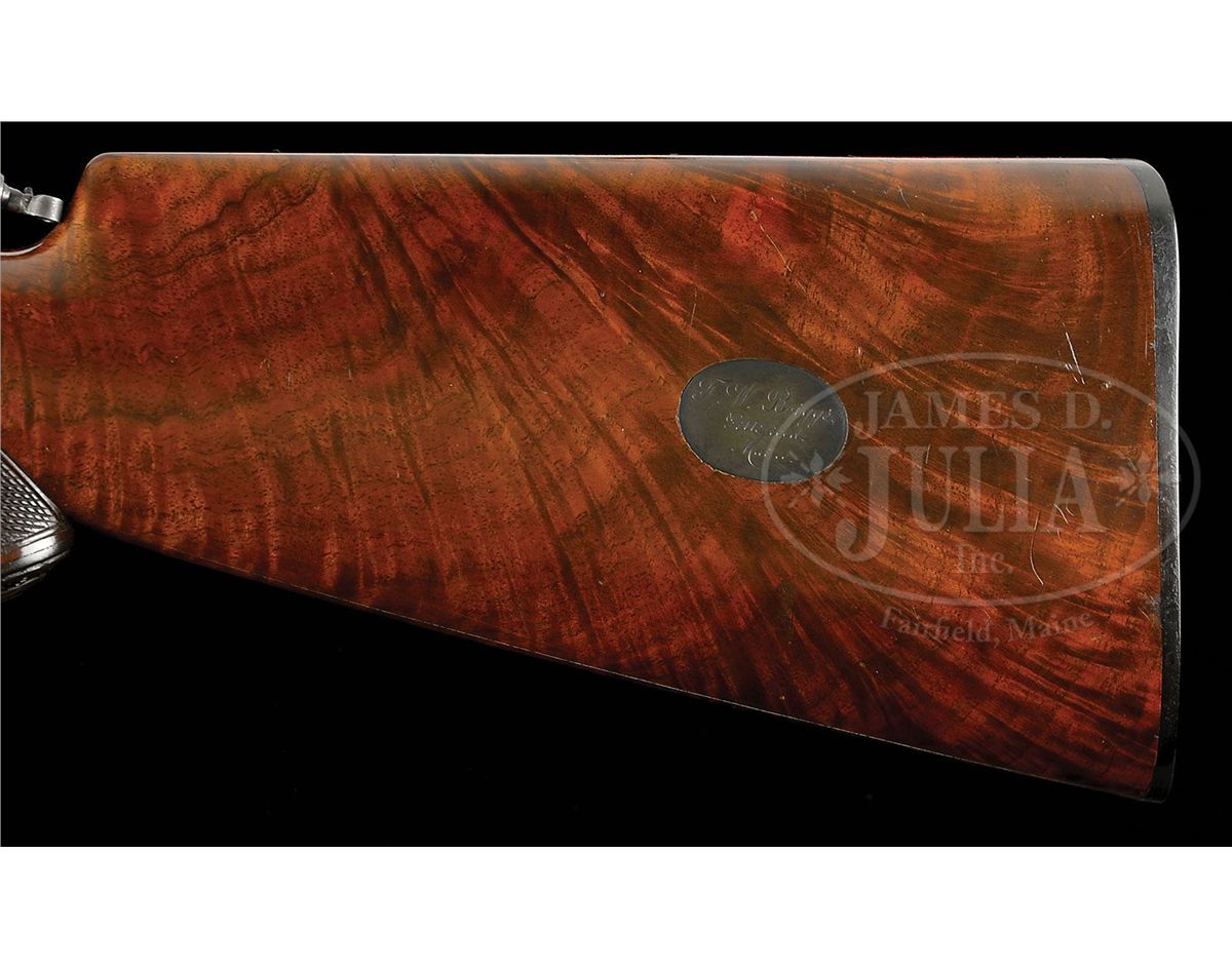 SN 122201. Cal. 33 WCF. Beautiful deluxe '86 with special order 24" lightweight tapered rnd bbl, half magazine, broken ivory bead Beach's front sight, semi-buckhorn rear sight and Lyman combination tang sight. Mounted with about 3X, very highly figured, center crotch, flame grain American walnut with H-style checkered forearm and capped pistol grip buttstock that has Winchester hard rubber buttplate. Left side of buttstock is inlaid with a 1-5/16" X 7/8" silver oval engraved in period script "F.W. Briggs / Pittsfield, / Maine". Left side of the lower tang, under the wood is marked "XX" and with the assembly number "459". Matching assembly number is found in top tang channel of buttstock. A quick Google search disclosed that Francis W. Briggs was the President and member of the Board of Directors for The Somerset Traction Company (a railroad) based in Skowhegan, Maine and resided in Pittsfield, Maine. Mr. Briggs is so listed in several annual reports at least until 1911. This short line railroad was established in about 1895 and ran 16.8 miles from Madison, Maine to Skowhegan, Maine. The line was abandoned in the 1930s. No additional personal information was found regarding Mr. Briggs. PROVENANCE: Woody Frey Collection. CONDITION: Extremely fine, all matching. Bbl, magazine tube and forend cap retain virtually all of their crisp, orig factory blue. Receiver also retains nearly all of its orig factory blue with light sharp edge wear and some fine thinning on the belly and top rear edges. Hammer retains about all of its brilliant, orig factory case colors and the lever about 90% bright case colors, brilliant on the sides. Wood is sound with a few light scratches and retains most of its bright, orig piano varnish finish. Checkering shows light diamond point wear. Mechanics are crisp, brilliant, shiny bore. 4-48431 JR179