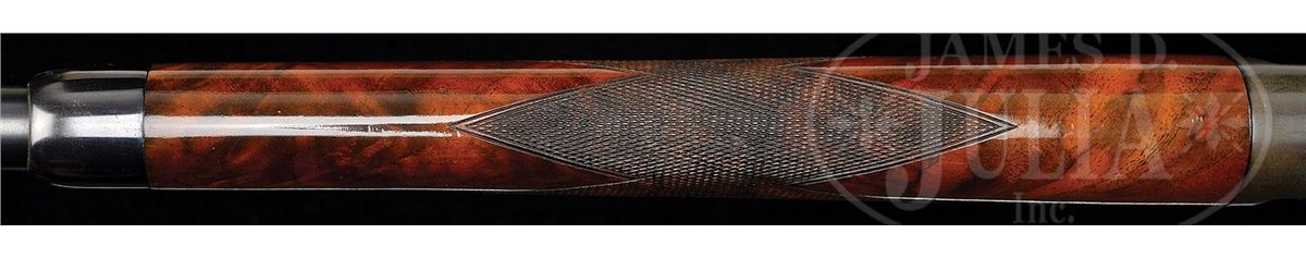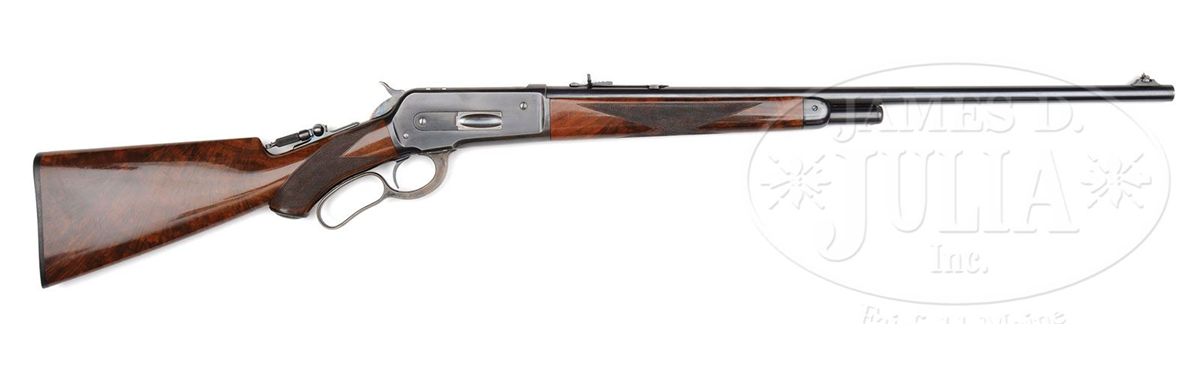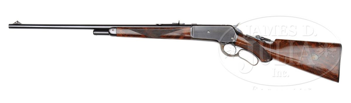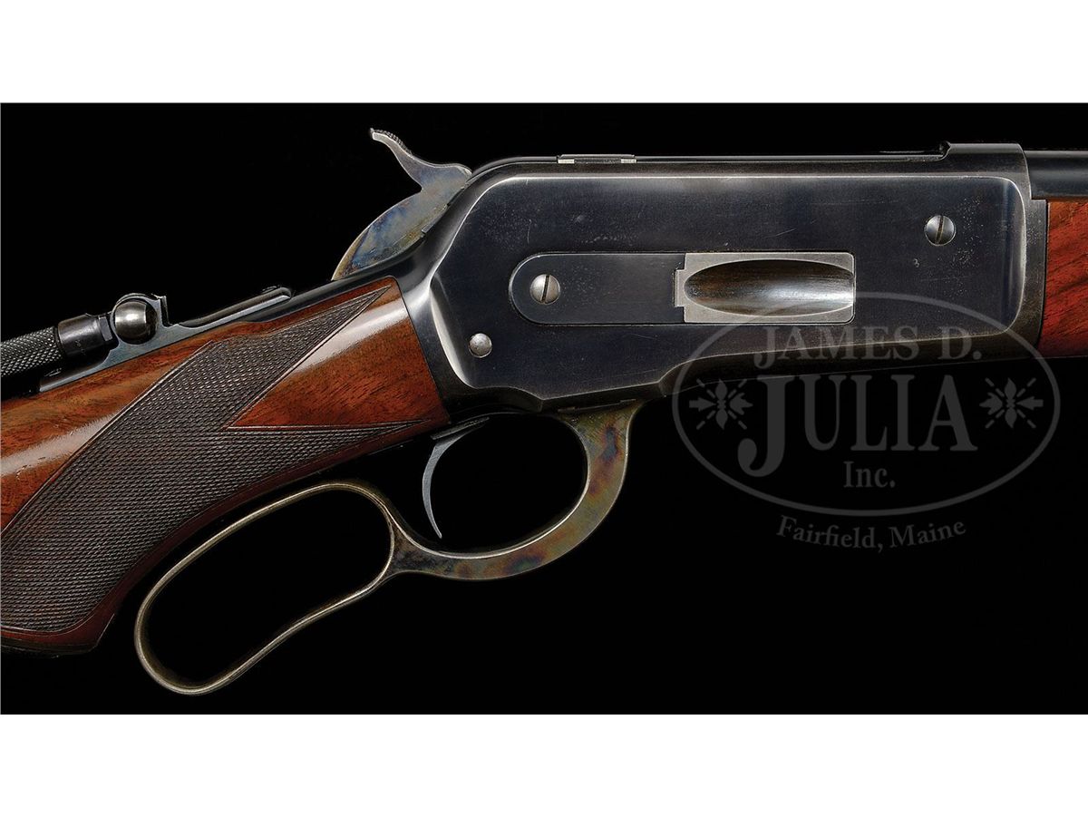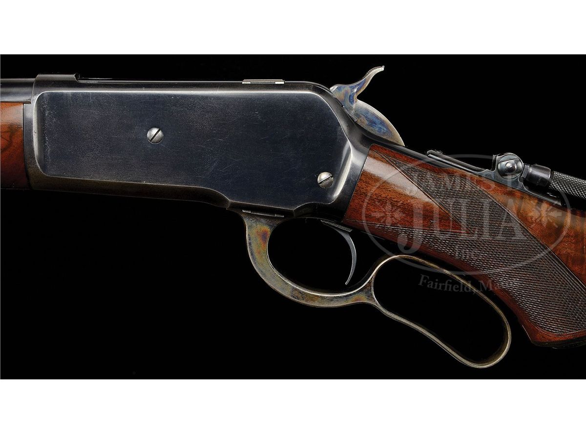 SN 122201. Cal. 33 WCF. Beautiful deluxe '86 with special order 24" lightweight tapered rnd bbl, half magazine, broken ivory bead Beach's front sight, semi-buckhorn rear sight and Lyman combination tang sight. Mounted with about 3X, very highly figured, center crotch, flame grain American walnut with H-style checkered forearm and capped pistol grip buttstock that has Winchester hard rubber buttplate. Left side of buttstock is inlaid with a 1-5/16" X 7/8" silver oval engraved in period script "F.W. Briggs / Pittsfield, / Maine". Left side of the lower tang, under the wood is marked "XX" and with the assembly number "459". Matching assembly number is found in top tang channel of buttstock. A quick Google search disclosed that Francis W. Briggs was the President and member of the Board of Directors for The Somerset Traction Company (a railroad) based in Skowhegan, Maine and resided in Pittsfield, Maine. Mr. Briggs is so listed in several annual reports at least until 1911. This short line railroad was established in about 1895 and ran 16.8 miles from Madison, Maine to Skowhegan, Maine. The line was abandoned in the 1930s. No additional personal information was found regarding Mr. Briggs. PROVENANCE: Woody Frey Collection. CONDITION: Extremely fine, all matching. Bbl, magazine tube and forend cap retain virtually all of their crisp, orig factory blue. Receiver also retains nearly all of its orig factory blue with light sharp edge wear and some fine thinning on the belly and top rear edges. Hammer retains about all of its brilliant, orig factory case colors and the lever about 90% bright case colors, brilliant on the sides. Wood is sound with a few light scratches and retains most of its bright, orig piano varnish finish. Checkering shows light diamond point wear. Mechanics are crisp, brilliant, shiny bore. 4-48431 JR179