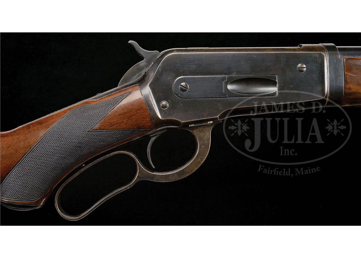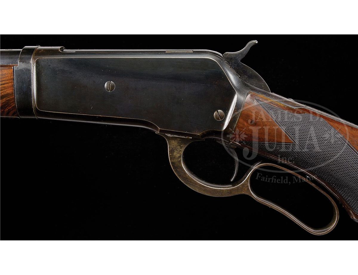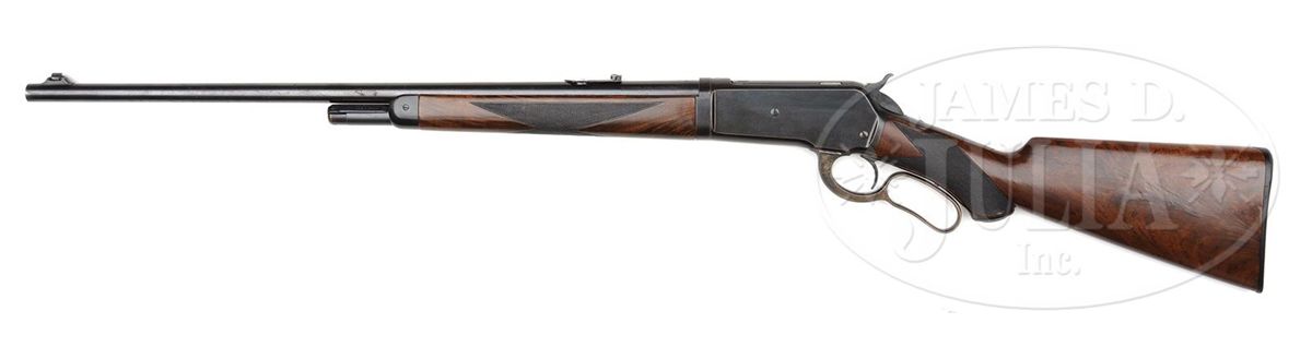 SN 138369. Cal. 33 WCF. Beautiful deluxe '86 with 24" tapered rd lightweight bbl, half magazine, pedestal mounted Lyman gold bead front sight & a modern Marble's folding carbine rear sight. Mounted with exceptional, about 3X, flame grain American walnut with H-style checkered forearm and capped pistol grip stock that has Winchester hard rubber buttplate. Left side of lower tang, under the wood is marked "XX" & the assembly number "163". Matching assembly number is also found in the top tang channel of the buttstock. The entire rifle, metal and wood, has been expertly refinished. CONDITION: Very fine, all matching. Overall retains virtually all of it's fine restored finish to both metal and wood with only light sharp edge wear on the metal and a few light nicks on the stock. Lever & hammer retain dark case colors. Mechanics are crisp. Brilliant shiny bore. 4-48618 JR149