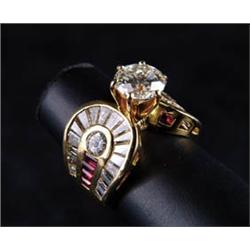 Lot 144 FINE DIAMOND AND YELLOW GOLD LADY’S RING Single 1.75ct diamond (round brilliant cut clarity VS1, color J) mounted in a yellow gold Tiffany style head flanked with two .30ct diamonds (round brilliant cut TW .60 clarity VS1, color G-I), thirty-four diamond baguettes (straight cut diamond baguettes TW 1.5ct clarity VS1, color G-I) and eight ruby melees (straight ruby baguettes TW .50ct clarity SI1, fair to good color) all hammer and channel mounted in a tapered yellow gold shank having a gross weight of approx. 7.3 dwt. The ring is unmarked and tests 22k. GIA appraisal accompanies lot. CONDITION: Very good. 5-70681