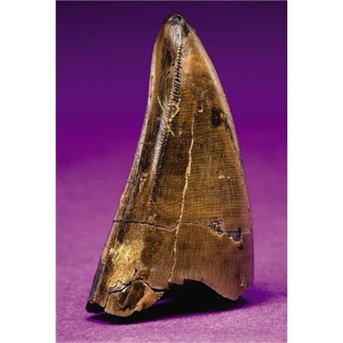 <B>FINE DINOSAUR TOOTH</B></I><BR> <I>Albertasaurus sarcophagus</B></I><B></B></I><BR><I>Cretaceous, Maastrichtian stage<BR>Judith River Formation, Glacier Co., Montana</B></I><BR>This Canadian dinosaur was relatively small for a Tyrannosaurid, but made up for it with a mouth crammed full of these vicious curved teeth. The present example is s pre maxilla tooth, meaning that it comes from the very front part of the dinosaur's jaw. This example is 1? inches long, with fine enamel and excellent serrations. It is thick and heavy with good dark color, and exhibits no restoration.<BR><BR><b>Shipping:</b> Requires 3rd Party Shipping (<a target="_blank" href="http://www.heritageauctions.com/common/shipping.php">view shipping information</a>)