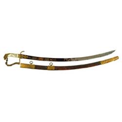 FINE EARLY 19TH CENTURY MILITIA SWORD. 30" single fuller blade with gold and blue etched panels on both sides. The eagle head hilt also has American eagle with shield languettes. The leather scabbard has gilt brass mounts all decorated with American eagles carrying banners with "E PLURIBUS UNUM". The throat has nineteen 6-pointed stars below the eagle and seven above. The center one has seven above and two below. The lower one has no stars but it has a sunburst with the letters "cTo" above the banner. CONDITION: The blade is bright with scattered spots of light surface rust. The gilt is strong on the eagle head but fading on the quillion and guard. About 60% of the gilt remains on the scabbard mounts. The scabbard is flaked and the mounts are loose, but it is not cracked or broken. It appears to be shrunk slightly as it is about 3/4" too short. The carved bone grip is fine. 9-99081 FS495