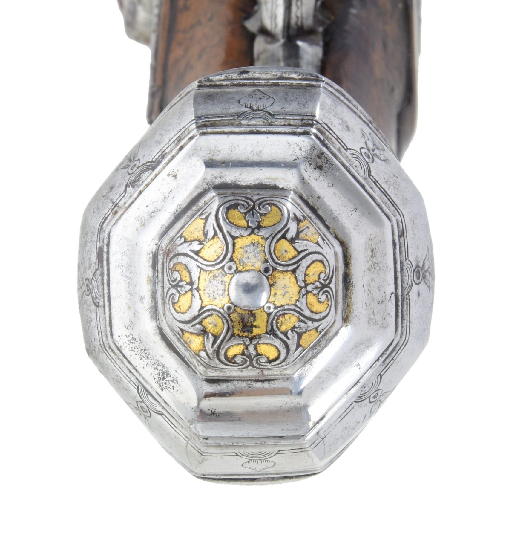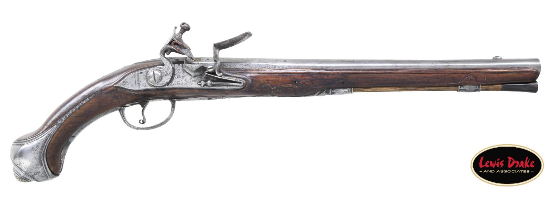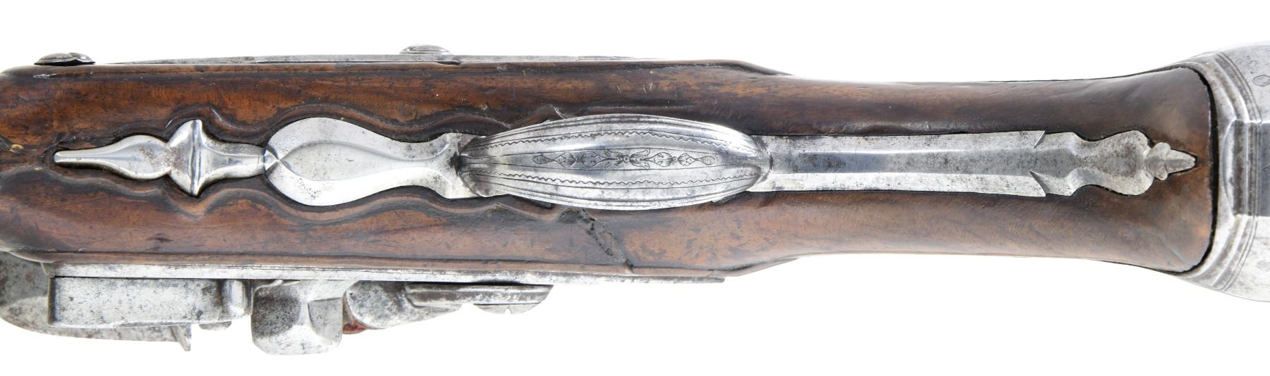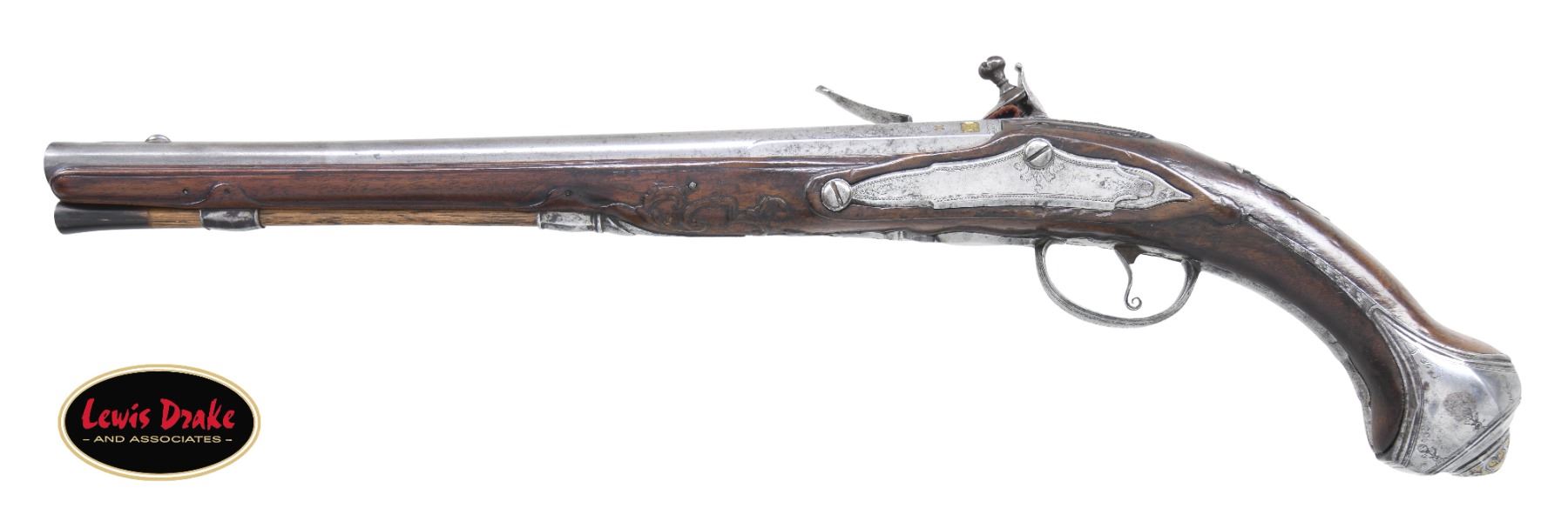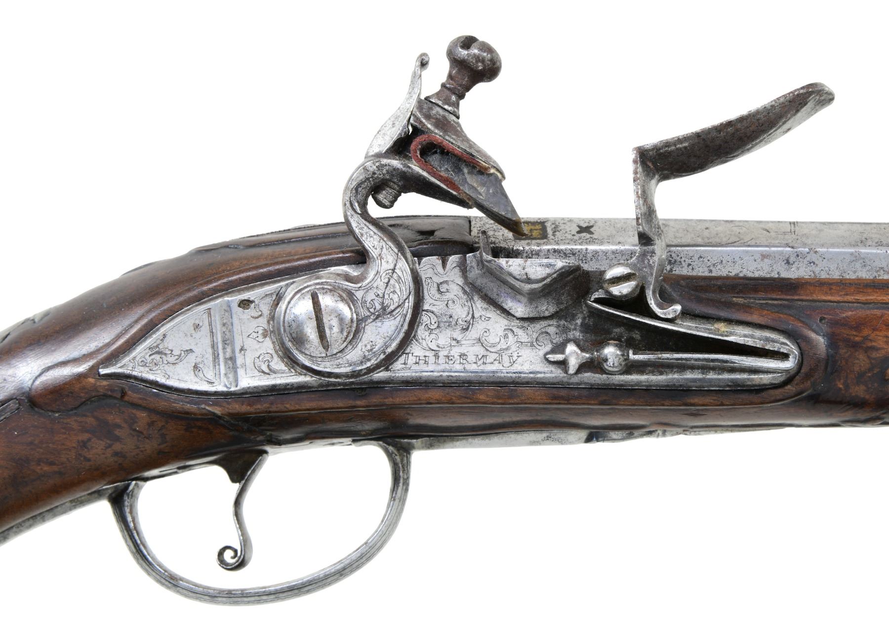 THIERMAY WITH SPANISH BARREL BY LUIS SANTOS. Cal. 58. S# NSN. Daniel Thiermay is known to have been working in Paris between 1700-40. Barrel maker Luis Santos was working in Madrid between 1691-1721. His 13-5/8" barrel with faceted breech section is deeply swamped to round with slight flare to muzzle. A top rib remains. Breech section has some scroll engraving along with four gold poincon; one bearing Santos' name and three depicting a griffin that he was know to use. Flint lock with deeply chamfered slightly arched plate and slight rebate to tail features serpentine cock, inset faceted pan, unbridled friction frizzen and feather spring with trefoil finial. Lock is scroll engraved and "Thiermay" is at bottom center. Trigger has pronounced curl at tip. Dense walnut stock extends to muzzle and is pinned to barrel. Iron mounts include deeply chamfered trigger guard with spear finial, faceted knob grip cap with side spurs and gilded pommel and long solid sideplate. Mounts show geometric borders and some well cut scroll. A vacant crest plate is at top of grip. Stock shows raised mouldings around all elements except grip cap and there are some well cut raised scrolls behind thimble. Walnut ramrod with horn tip mounts through beaded and faceted pipe and matching thimble. CONDITION: good. Metal parts cleaned to silver and gray. Stock remains sound; shows some wear and has been professionally extended from thimble area to muzzle. Bore is good with some scattered pits. Lock is good. PROVENANCE: from the renowned collection of quality sporting arms from Lewis Drake together with inventory of Lewis Drake Associates. (01-26141/MGM). ANTIQUE. $1,500-2,500.