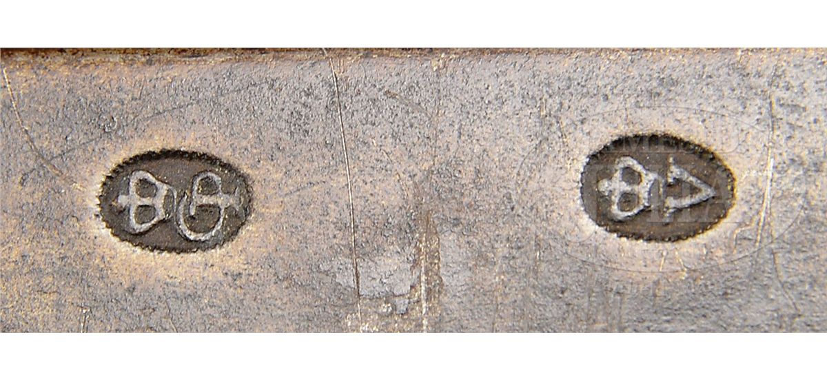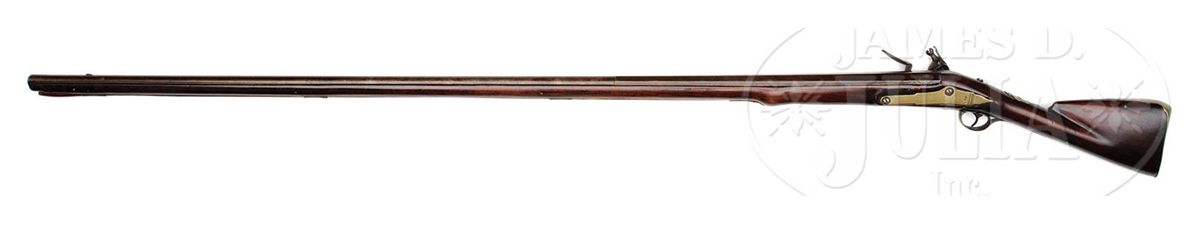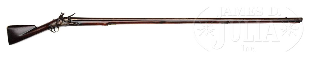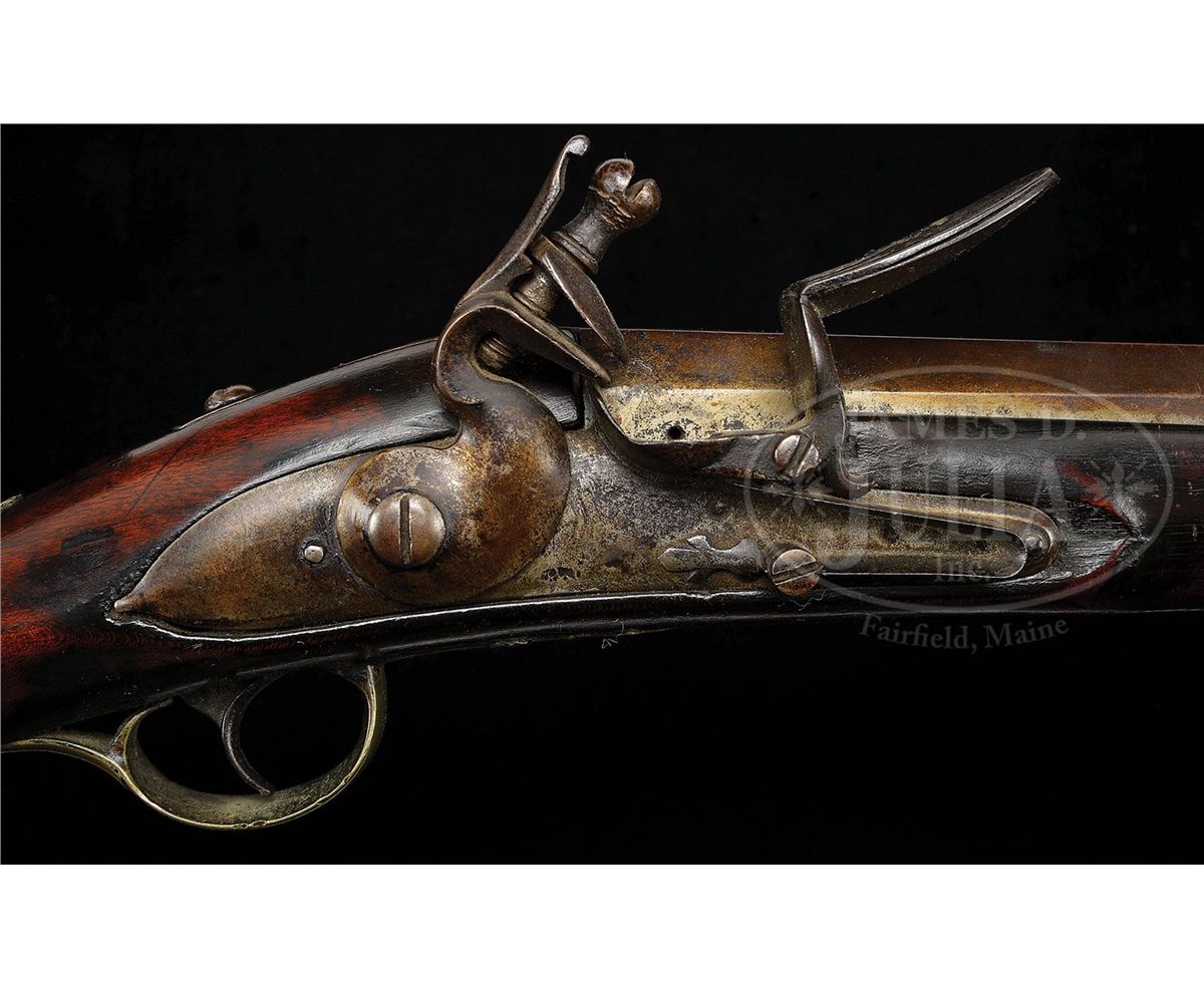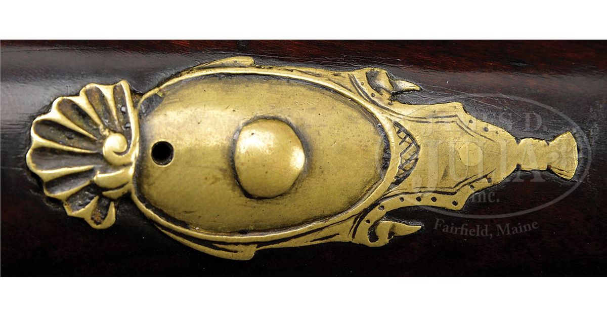 NSN. This early fowler has a 60 ½ inch octagon to round .80 caliber barrel with English view and proof barrel marks. This typically British style fowler is the type made in the Colony of New York or in adjacent Colonies such as Massachusetts or Rhode Island where the consigner states it was found years ago. Long fowlers of this type are often lumped together with Hudson Valley fowlers and may have been made in the same region. This very same fowler is illustrated on page # 187 of Tom Grinslade’s book Flintlock Fowlers, the first guns made in America”. (Mr. Grinslade’s original tag number, BS #15, is still intact). The full stock is Cherry wood with a rich Mahogany color and is fully sculpted with a long hand rail, high comb, and a bulbous swelling at the rear ramrod entry ferrule not unlike a first model Brown Bess. The original flint lock follows a similar design to the British Brown Bess, but is made in a commercial style with no external or internal markings. The brass hardware is the mid-eighteenth century style including a butt plate with a “three step” tang, a “trifid” tipped trigger guard finial, a large triangular molded side plate and an ornate cast wrist escutcheon with a relief shell pattern at its head. The four ramrod guides hold a period made hickory ramrod. CONDITION: The overall condition of this fowler is a special feature of this mid-eighteenth century fowling piece of American manufacture. When found most of these long fowlers have been broken, shortened and converted to percussion. The trigger guard’s rear extension shows a very neat mend using four tiny pins. There is evidence of a minor glued crack in the ramrod channel at the first ramrod pipe and some minor glued cracks at the muzzle. 4-49675 RG8