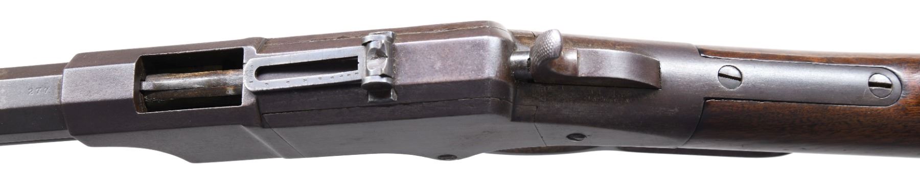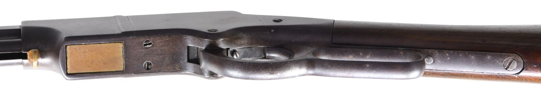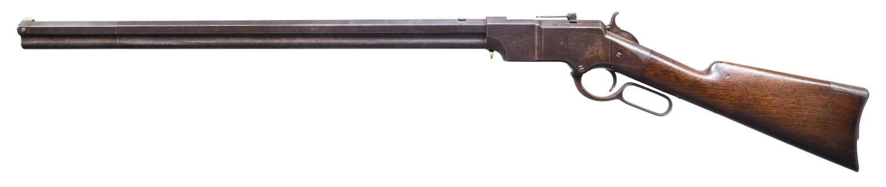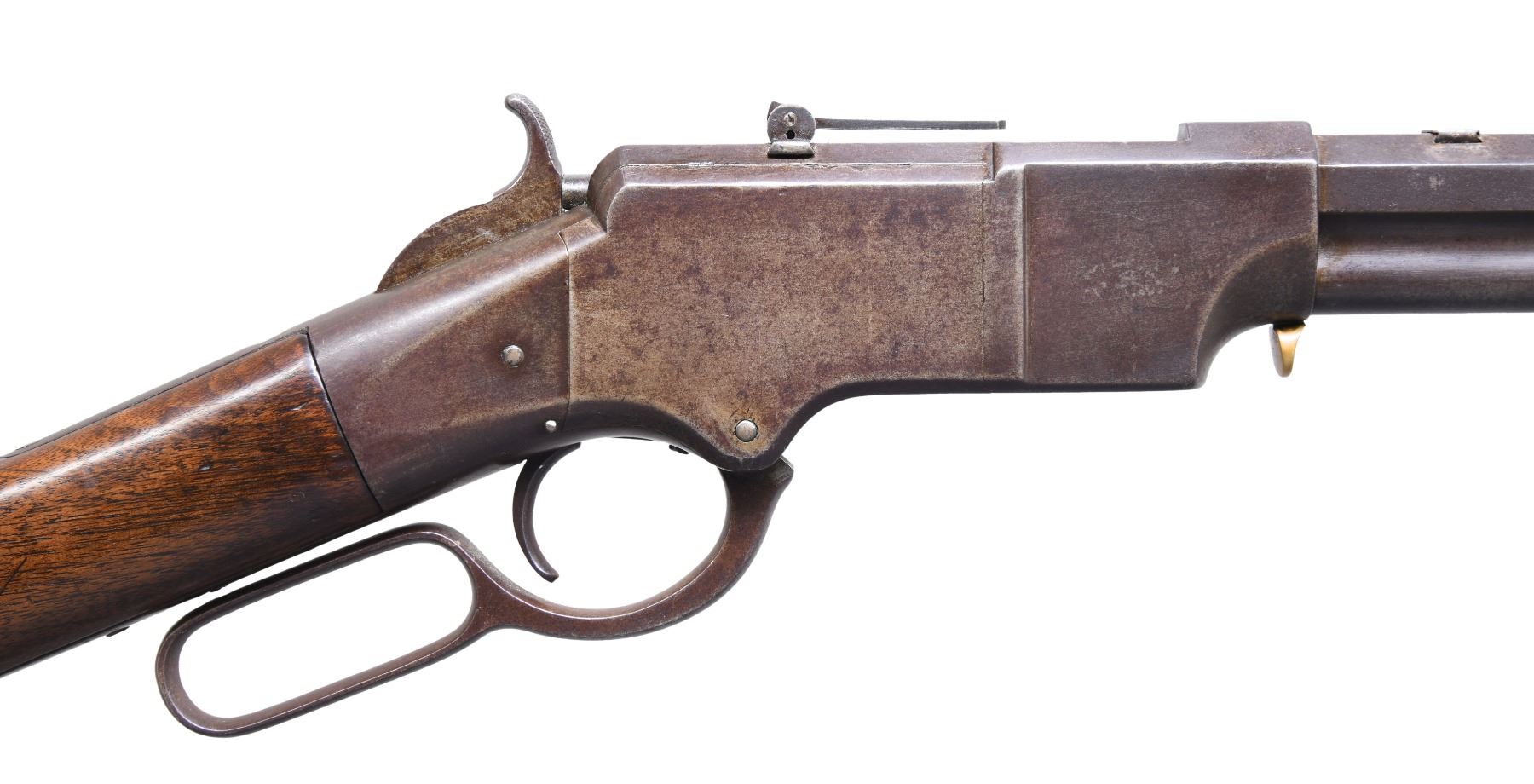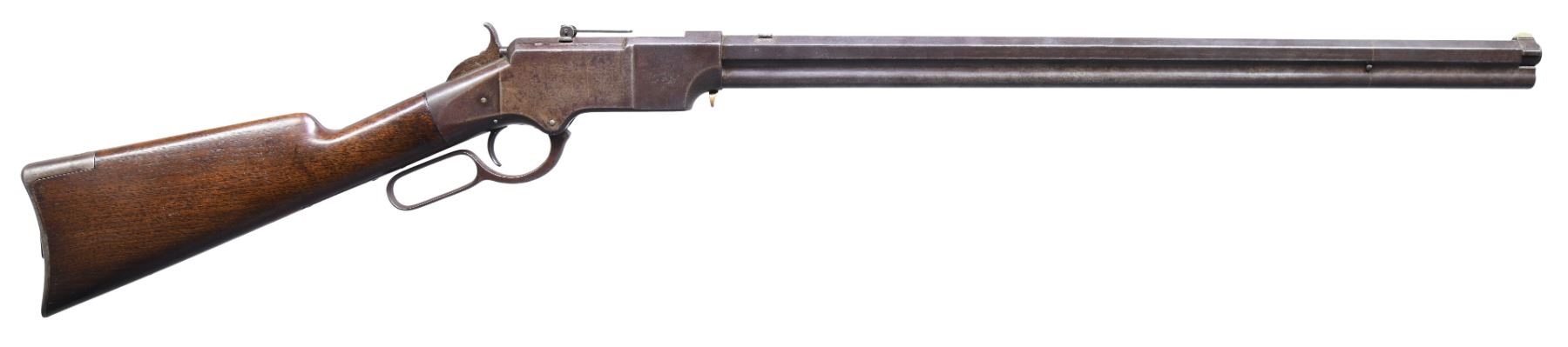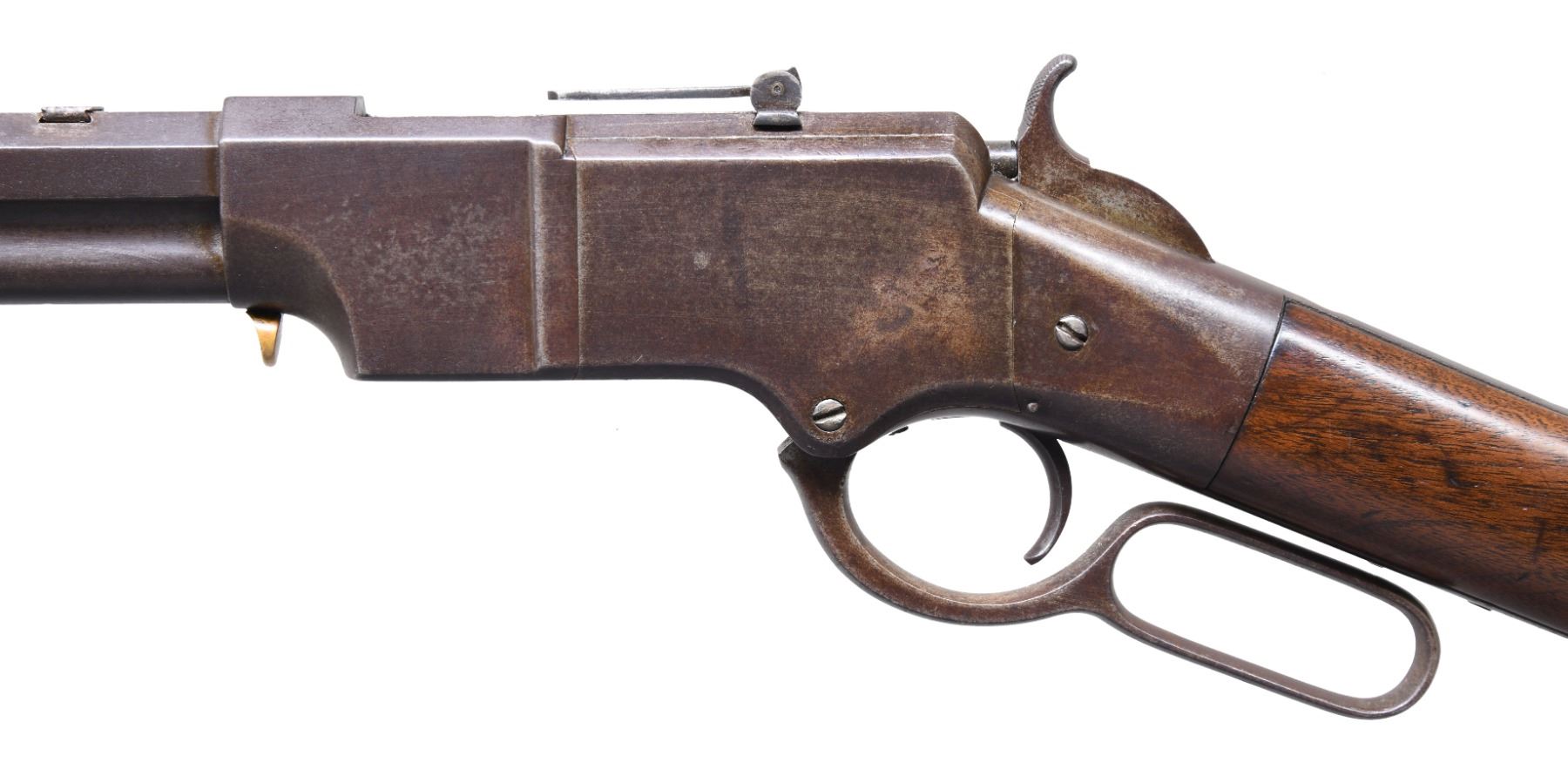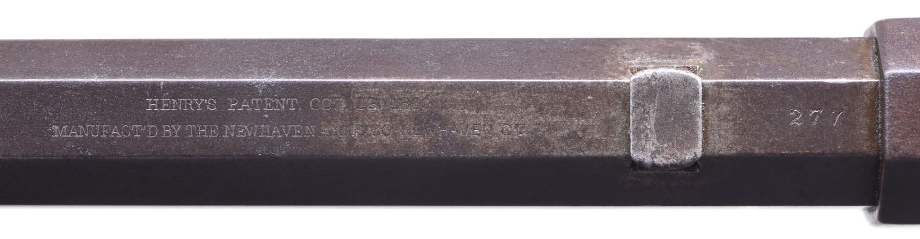 Cal. 44. S# 277. The 1st Henry Rifles were made with iron frames in a total production estimated 225-250, there are 98 survivors documented S# 1 to highest S# 355. 355 iron frames were not made as brass guns in same configurations are interspersed with few duplicate numbers. All early iron & brass up to about S# 400 have standard features including 1000 yard adjustable rear sight, brass half moon crescent inset front sight, earliest two line address with small fonts with mixed serif and san-serif fonts, measuring about 2.5" in length on 24 3/8" octagonal barrel with integral full length magazine sleeve, varnished straight grain walnut stock with correct large .92" diameter mortised cleaning rod chamber with extra shallow groove required for space for the largest early four piece wood and metal cleaning rod set which is still present. CONDITION: very good overall, "as found", smooth plum patina, good markings throughout. The scarce correct original 1000 yard sight is complete. Rifle is complete, matching and original throughout. The 3 tang screws and 2 butt plate screws have matching serial numbers as does stock, lower tang and butt plate. Good six groove rifled bore. Stock is tight and well fit retaining some original varnish with scattered staining and cosmetic blemishes. (01-26365/JS). ANTIQUE. $60,000-80,000.