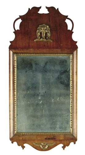 FINE EARLY MAHOGANY QUEEN ANNE MIRROR. Rectangular original plate has a mahogany frame with gilt liner, tall carved crest with gilt urn of fruit. Bottom carved crest has gilt decoration. Top crest with a nice curving back. SIZE: 26-1/2” l x 12-1/2” w. CONDITION: Generally very good. 9-27389