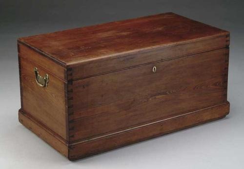 FINE EARLY PINE DOVETAILED SEAMAN’S CHEST. Natural finished pine chest fitted with brass double lift ends on an applied base. SIZE: 19” h x 38” l x 20-1/4” d. CONDITION: Very good. 9-27948