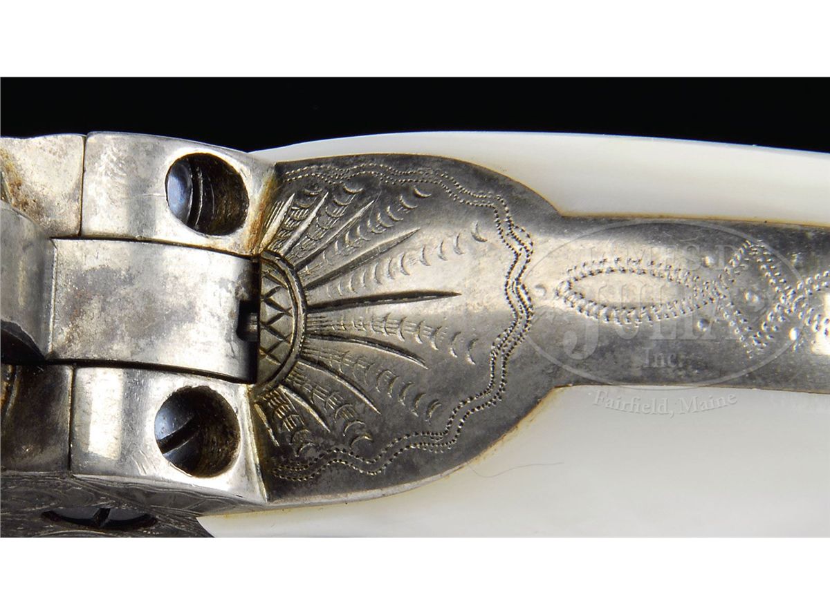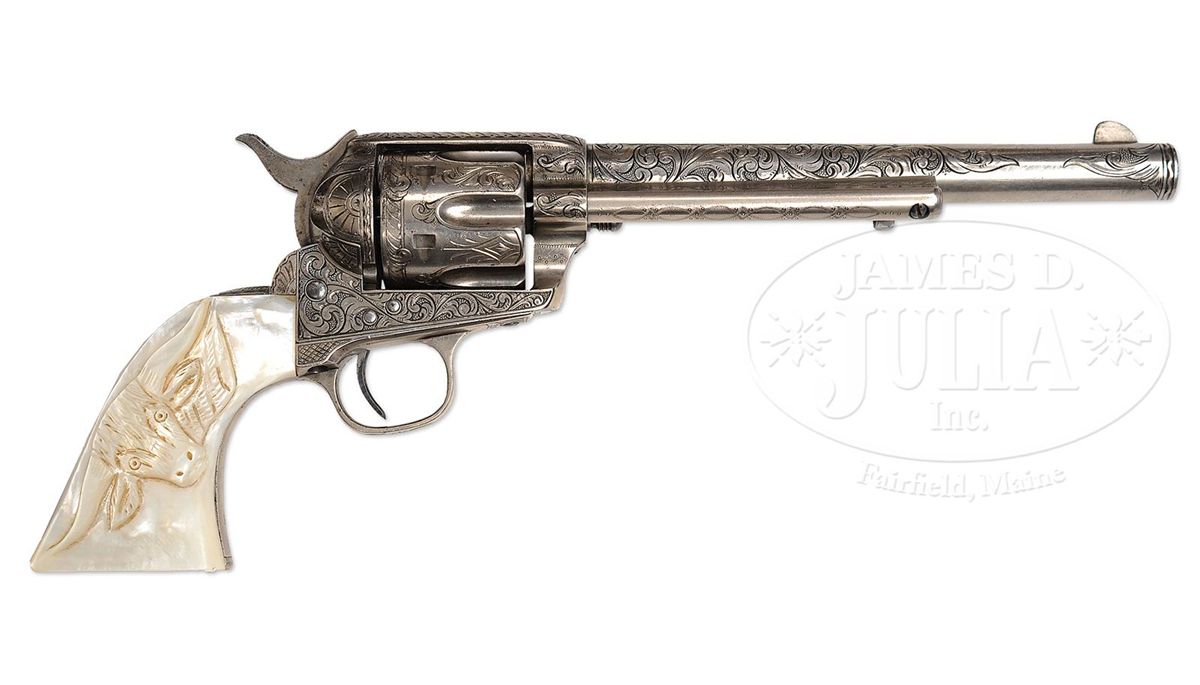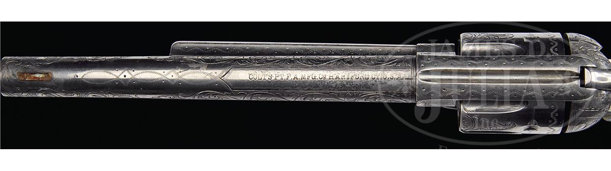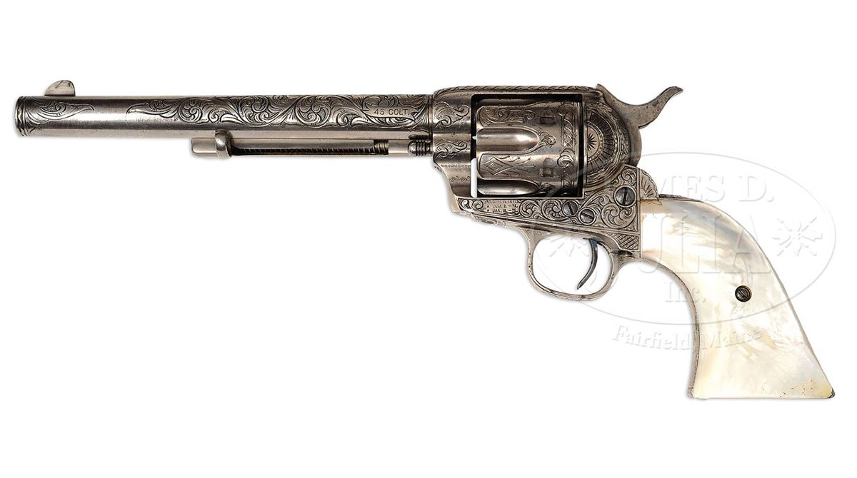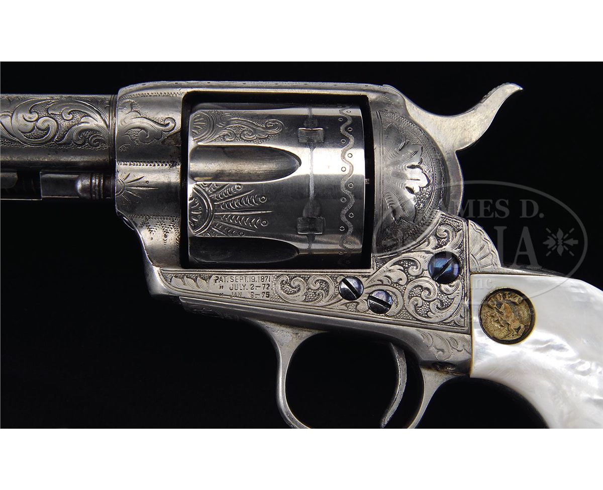 SN 129317. Cal. 45 Colt. Nickel finish with 7-1/2" bbl and 1-line block letter address with caliber marking on left side. Left side of frame has 3-line patent dates and left front web of trigger guard has the caliber marking. Mounted with fine 2-pc pearl grips with raised carved ox head on right side. Revolver is engraved in Cuno Helfrecht style but after-market and probably not period. Frame has nearly full coverage foliate arabesque patterns with pearled background and Mr. Helfrecht's style of fan pattern on recoil shield & loading gate. Top strap is engraved in feather patterns. Foliate arabesque patterns extend up both sides of bbl and on each side of muzzle with geometric patterns around the address. Top of backstrap is engraved also in Mr. Helfrecht's fan pattern with snake & dot and geometric patterns down the backstrap, geometric patterns on buttstrap & trigger guard. Cyl is engraved in alternating foliate arabesque & geometric patterns on the lands between the flutes with smaller patterns back of the flutes and a feather border around the rear edge. Ejector housing is engraved with a snake & dot pattern in the gullet and geometric patterns on the outer radius. This is a beautiful, well-executed engraved Colt but not by Mr. Helfrecht or from his shop. CONDITION: Fine to very fine. Overall retains just about all of its custom nickel finish with minor pimpling in a couple of spots on the frame, front & backstraps; cyl also has fine pimpling with the front face being polished metal; screws retain faded blue and the hammer strong case colors. Grips are outstanding with great fire & color. Mechanics are fine, strong bore with dark fine pitting. 4-48801 JR354