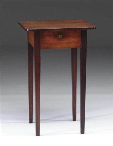 FINE FEDERAL ONE DRAWER STAND. Ovolu cut corner top with good overhang, single dovetailed drawer fitted with brass knob. Four tapered legs, mahogany top and bridseye maple drawer front. SIZE: 26” h x 16-1/2” w x 15-1/4” d. CONDITION: Very good. 9-27452