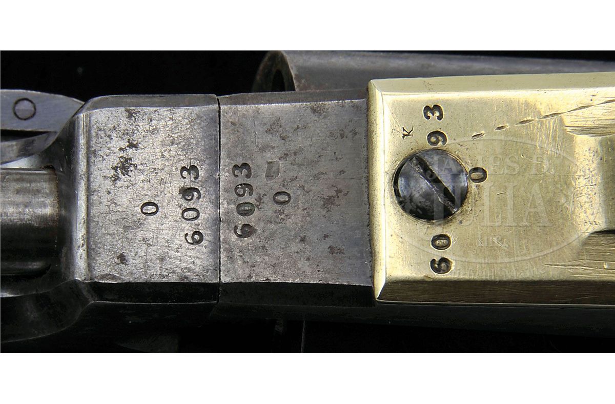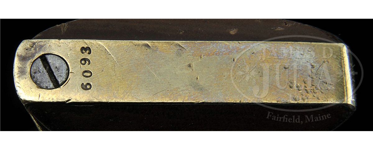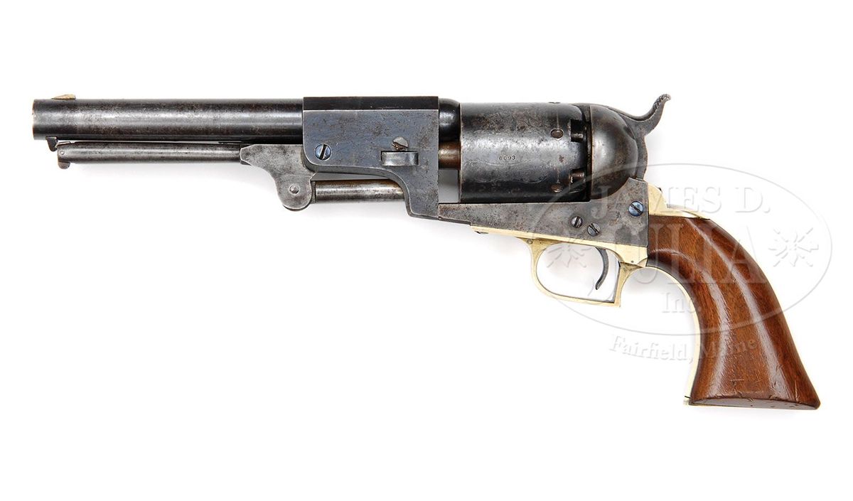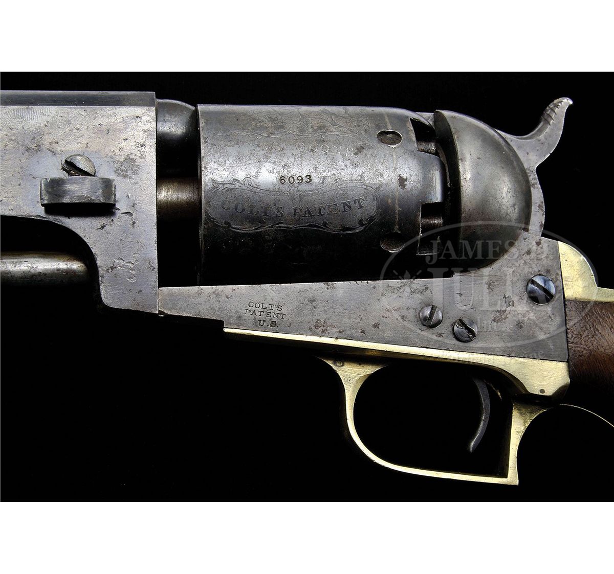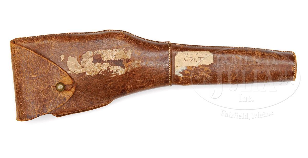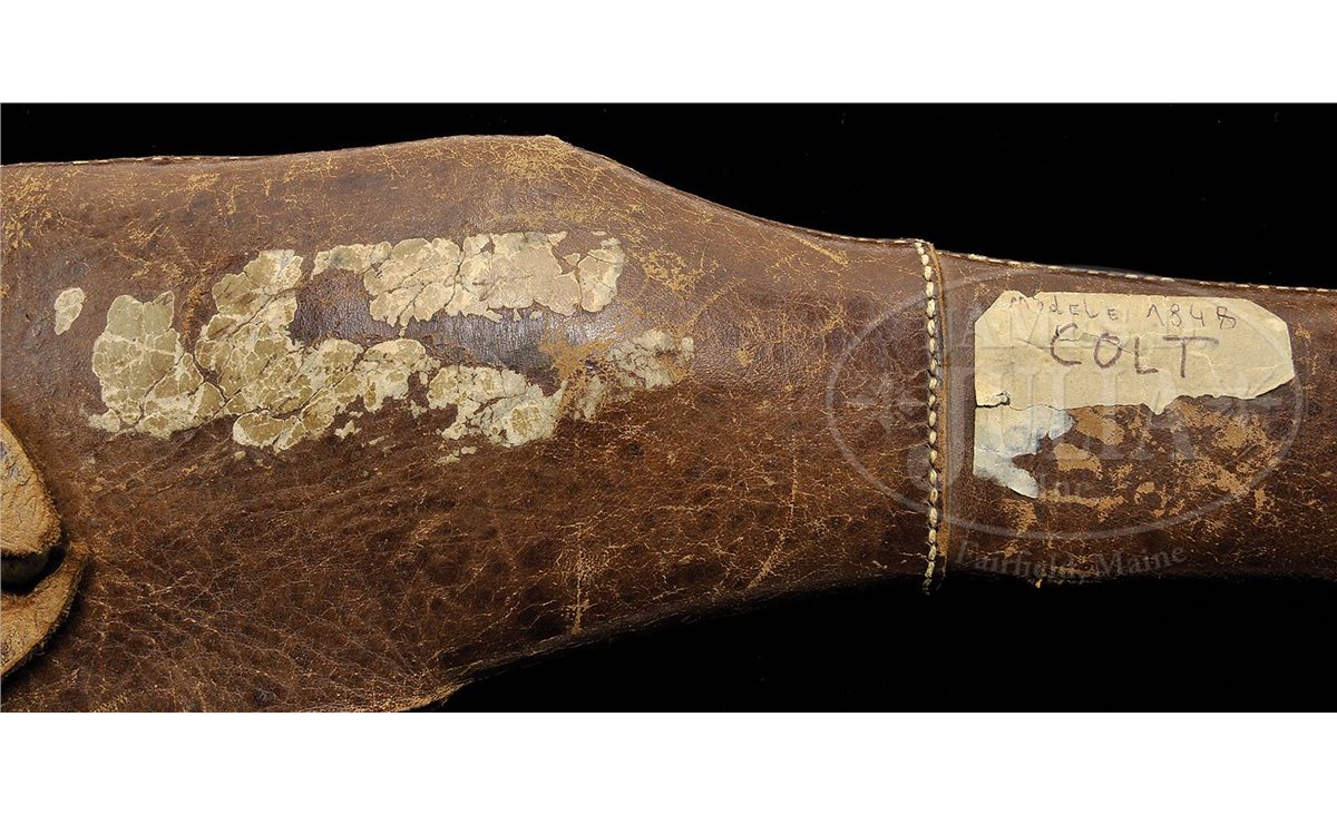 SN 6093. Cal. 44. This is a fine example of a scarce civilian first model Colt Dragoon revolver retaining much of its orig finish. This gun conforms to other first model Dragoons having 7-1/2" round bbl with half oct bbl housing. Bbl is correctly marked with New York City address and SN 6093 is found on most major parts including bbl, frame, trigger guard, backstrap, arbor and cylinder. The cylinder seen on this gun is crisp, showing all of the Ormsby rolled Dragoon/Indian fight scene. Cylinder is also engraved with the more desirable "U.S. Dragoons/Colts Patent" marking. This is a beautiful first model Dragoon that functions perfectly and appears unfired with a like new shiny bore. This gun is accompanied by an unusual custom made brown leather holster which fits gun poorly and was probably made for a longer single shot pistol as there is about a 1 or 2 inch gap between plug and muzzle. There are remnants of an old tag with indiscernible partial text, along with a more modern tag which says "Modele 1848 Colt". CONDITION: Bbl and cylinder retain over 50% of their blue finish with much of the balance plum with scattered areas of rust and light pitting. Cylinder retains the entire Dragoon/Indian fight scene though there are scattered areas of staining and pitting. There are a few light dents in frame near wedge slot. Frame which is marked on the left side "COLTS/PATENT/US" retains much of its muted case colors with balance silver/gray. Backstrap and trigger guard have a yellow brass patina with small inspector letter "KT" stamped. Wedge appears orig though there is no SN. Frame screws retain much of their bright blue finish as can be seen in photos. Stocks retain most of their orig varnish. Mechanically gun functions well and has a bright crisp bore. Cylinder chambers still retain traces of bluing and cones appear sharp though 5 of 6 safety pins have been smashed flat. Trigger screw is broken and missing half, as can be seen, in hole on right side of frame. 4-48120 JS12