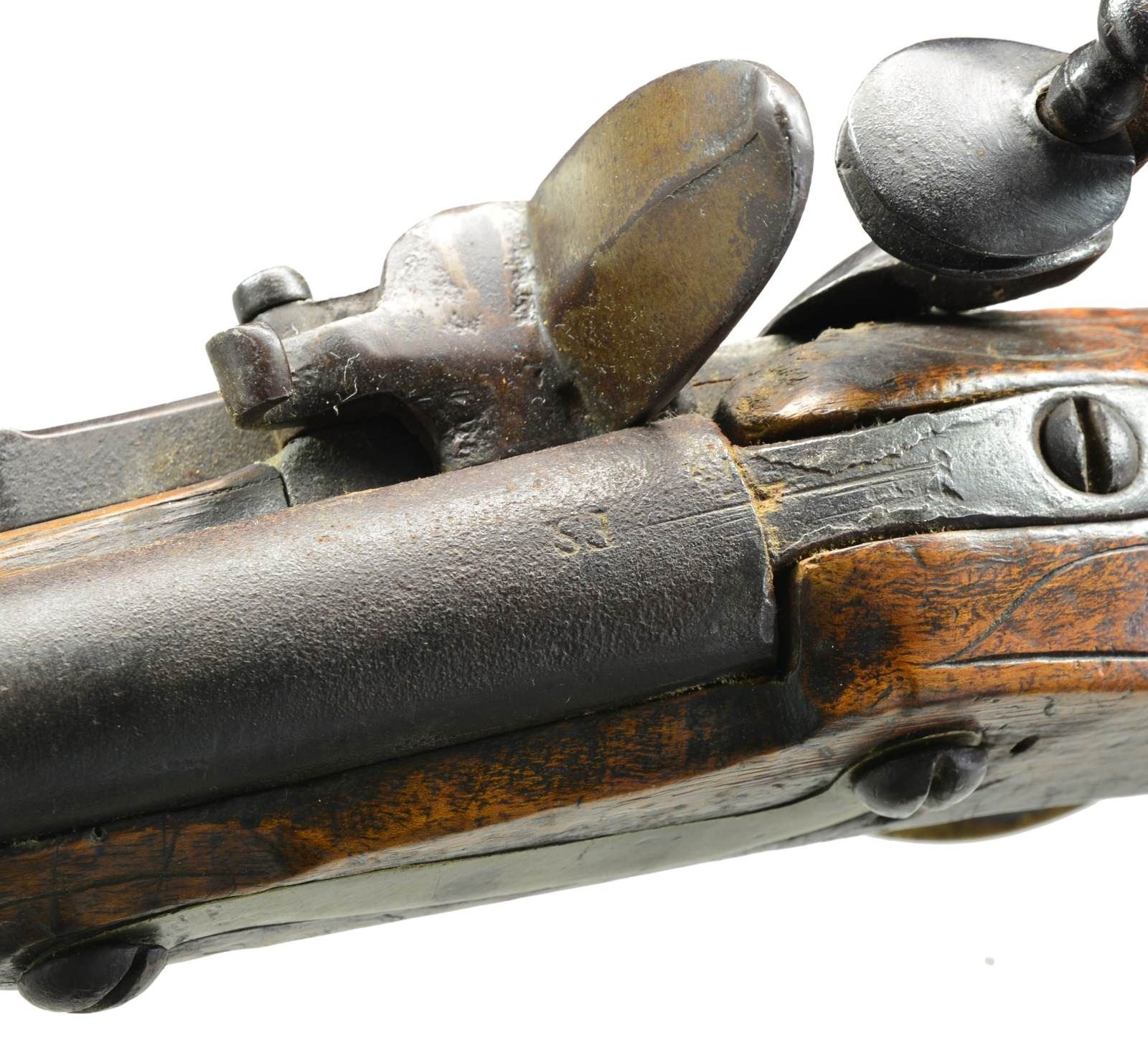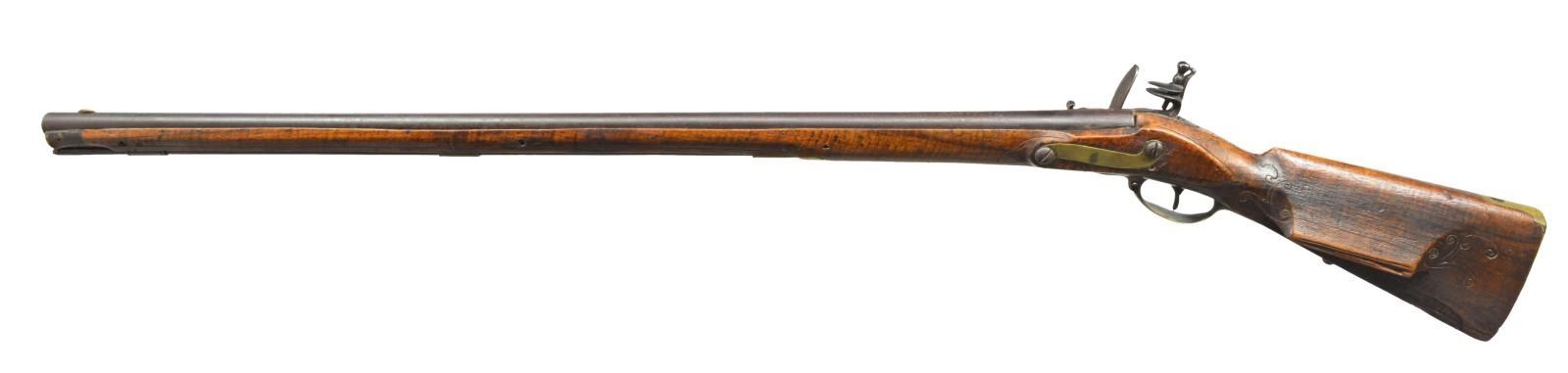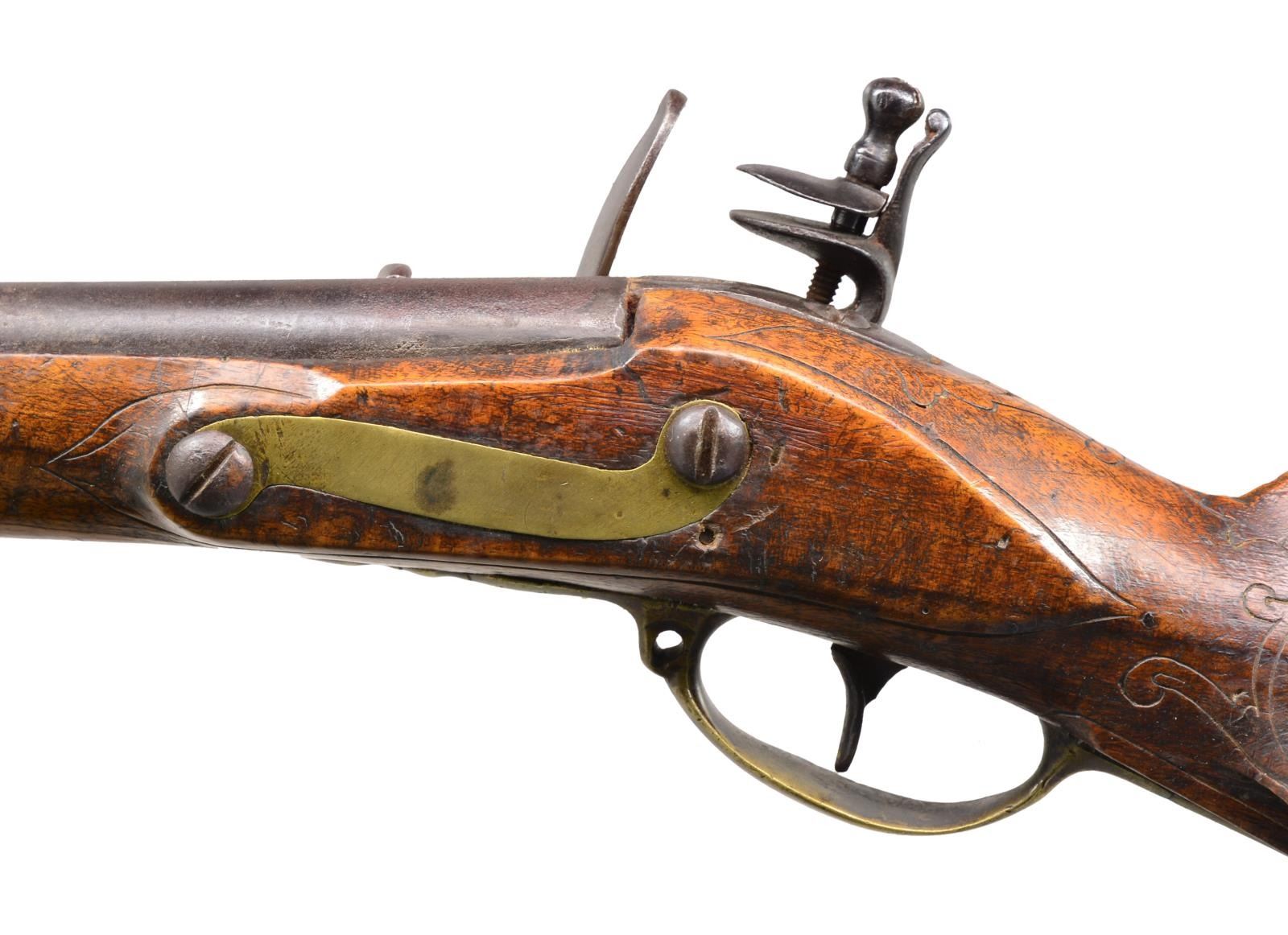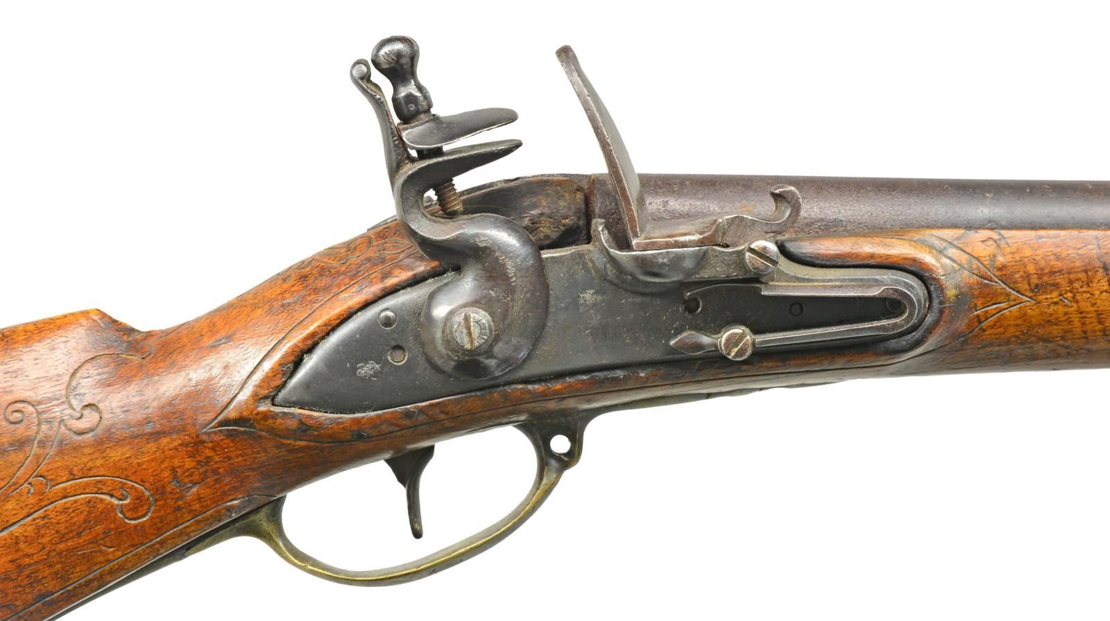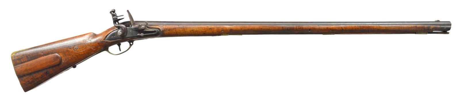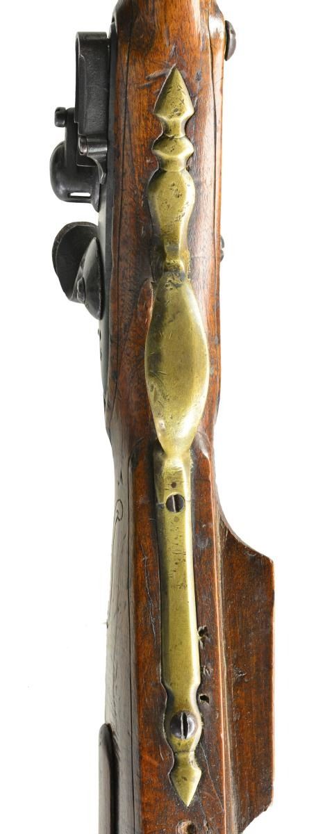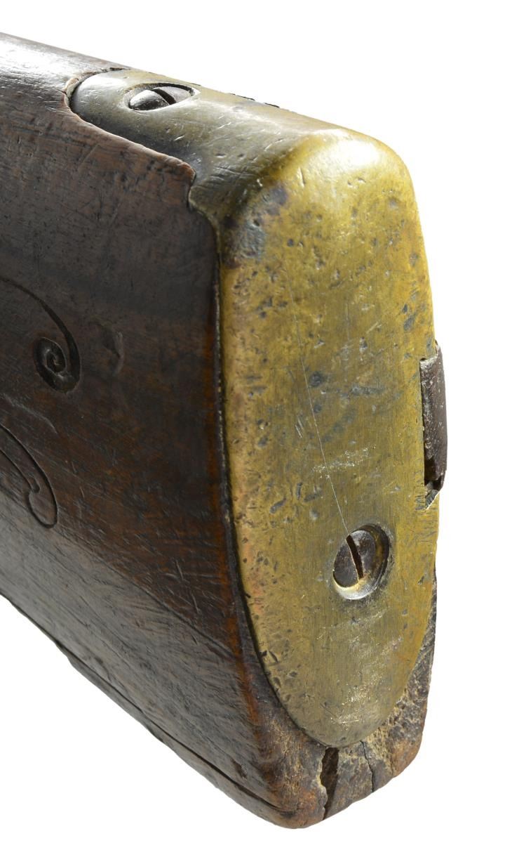 Cal. 70. NSN. 52" Overall. Bbl. 38" rnd. w/ thick brass blade front sight, brass mounted w/ military style buttplate & trigger guard. Gun is totally unmarked other than pair of initials on top of bbl. breech “F.S.”. Walnut stocked w/ incised carving, horn nose cap, sliding wood patch box. CONDITION: very good overall, appears original & complete though cock appears refinished, stock is sound w/ scattered cosmetic blemishes. Lock & bbl. have dark iron patina w/ pitting around breech, brass has medium mustard patina, trigger guard has crack at screw rear of trigger bow. PROVENANCE: From the Collection of John "Tim" Breth Jr. (01-17783/JS). ANTIQUE. $2,000-3,000.