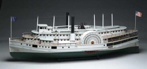 FINE FOLK ART SIDEWHEELER SHIP MODEL OF THE “MASSACHUSETTS”. The green and white hulled model has three decks painted in white with light green trim. Double smoke stack with red wheels and nicely detailed features. On one side of the wheel house is a decorative seal similar to Massachusetts. The Massachusetts was part of the Providence & Stonington Steamship Company and ran between New York and Boston. Other steamers included the Connecticut and Rhode Island. SIZE: 20” h x 58” l x 17” w. CONDITION: Generally very good. 9-27693