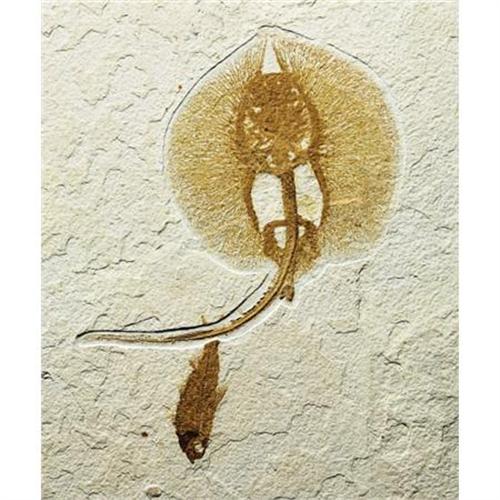 <B>FINE FOSSIL STINGRAY</B></I><BR> <I>Heliobatus radians<BR>Eocene<BR>Green River Formation, Wyoming</B></I><BR>Many of the aquatic animals that lived in the Fossil Lake of the Green River formation were descendants of marine species cut off from the oceans as the North American continents rose slowly from the primordial waters that covered much of the globe. This is the reason why the traditionally ocean-dwelling sting-ray was to be found in these fresh waters. Like their modern-day descendants, they were placid bottom dwellers, the fearsome tail barbs providing an excellent deterrent to predators that might otherwise have enjoyed them as a tasty dinner. As might be expected, the remains of these thin, delicate flat fish are rare. They are a cartilaginous fish, a characteristic highly antipathetic to fossilization, and although the strata of the "18-inch layer" of the Fossil Lake make it relatively easy to remove the abundant fossils found there, the "wing" bones of the ray present one of the greatest challenges to the excavator, having the thickness of only two sheets of paper. The preparator's skill is likewise keenly tested in its presentation, and the fine detail of the present example is testament to a master of this most painstaking art. The wingspan here is 6 inches, and it measures 12½ inches from tip to tail. As an added bonus, swimming perilously close to the dangerous stinger is one of the abundant <I>Knightia sp</B></I>., an ancestor of the modern herring, measuring 3¾ inches long. Both are presented on a natural limestone matrix plate measuring 16? x 13? inches overall.<BR><BR><b>Shipping:</b> Requires 3rd Party Shipping (<a target="_blank" href="http://www.heritageauctions.com/common/shipping.php">view shipping information</a>)