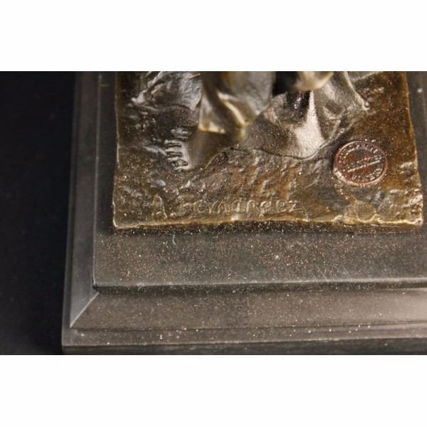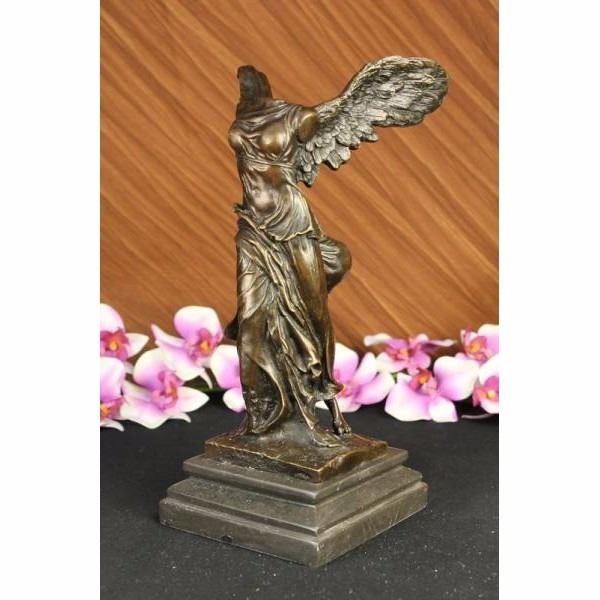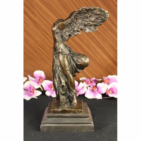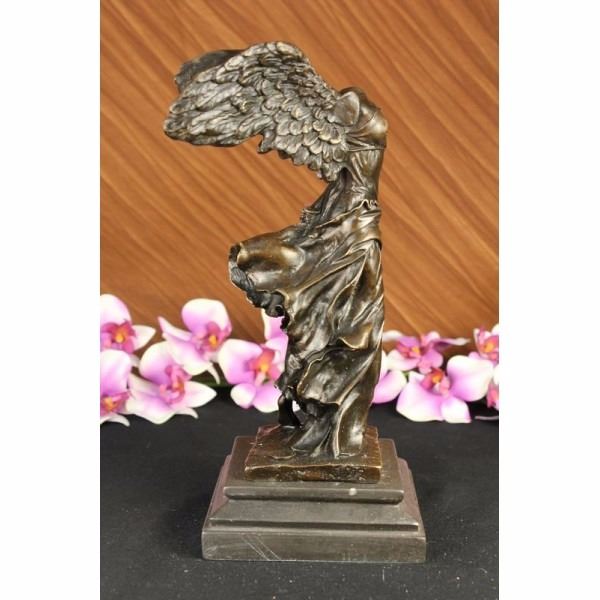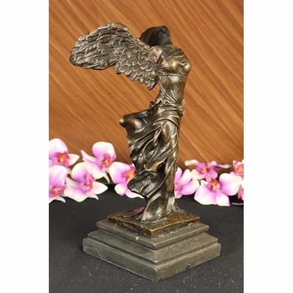 This replica casted in bronze is of the the Winged Nike of Samothrace,one of the most important and beautiful surviving masterpieces ofantiquity.The original marble statue of the Winged Nike of Samothrace(Nike of Samothrace) was uncovered on the island of Samothrace byFrench consul and amateur archaeologist Charles Champoiseau in 1863.In Greek mythology, Nike, also known as the Winged Goddess ofVictory, bestowed triumph, both in war and in contest. As a wargoddess she was often represented standing along side Zeus, Athena andAres. As goddess of contests, she typically is portrayed adorning thewinner with a victor's wreath and/or sash.The statue of Nike is one ofthe greatest surviving sculpture masterpieces of the Hellenisticperiod, even though it is significantly damaged; most significantlymissing its head and outstretched arms.Created by an unknown sculptor(Rhodian in origin), the piece is dated between period 220-190 BCE.This archaic duplicate can now be enjoyed on a daily basis for anyoneenchanted by this celebrated mastery or with Greek mythology. Thegoddess was cast to the original likeness using the lost-wax method andstained with a brown patina finish. She eternally stands upon a blackmarble base with the artist A. Fernandez's signature. Condition: This sculpture is in pefect condition. Bronze Dimensions with Marble Base:Height 12" x Width 5" Marble Dimensions:5" X 5" Height without base: 11" Weight :10 LBS Inventory : 64Y1073246
