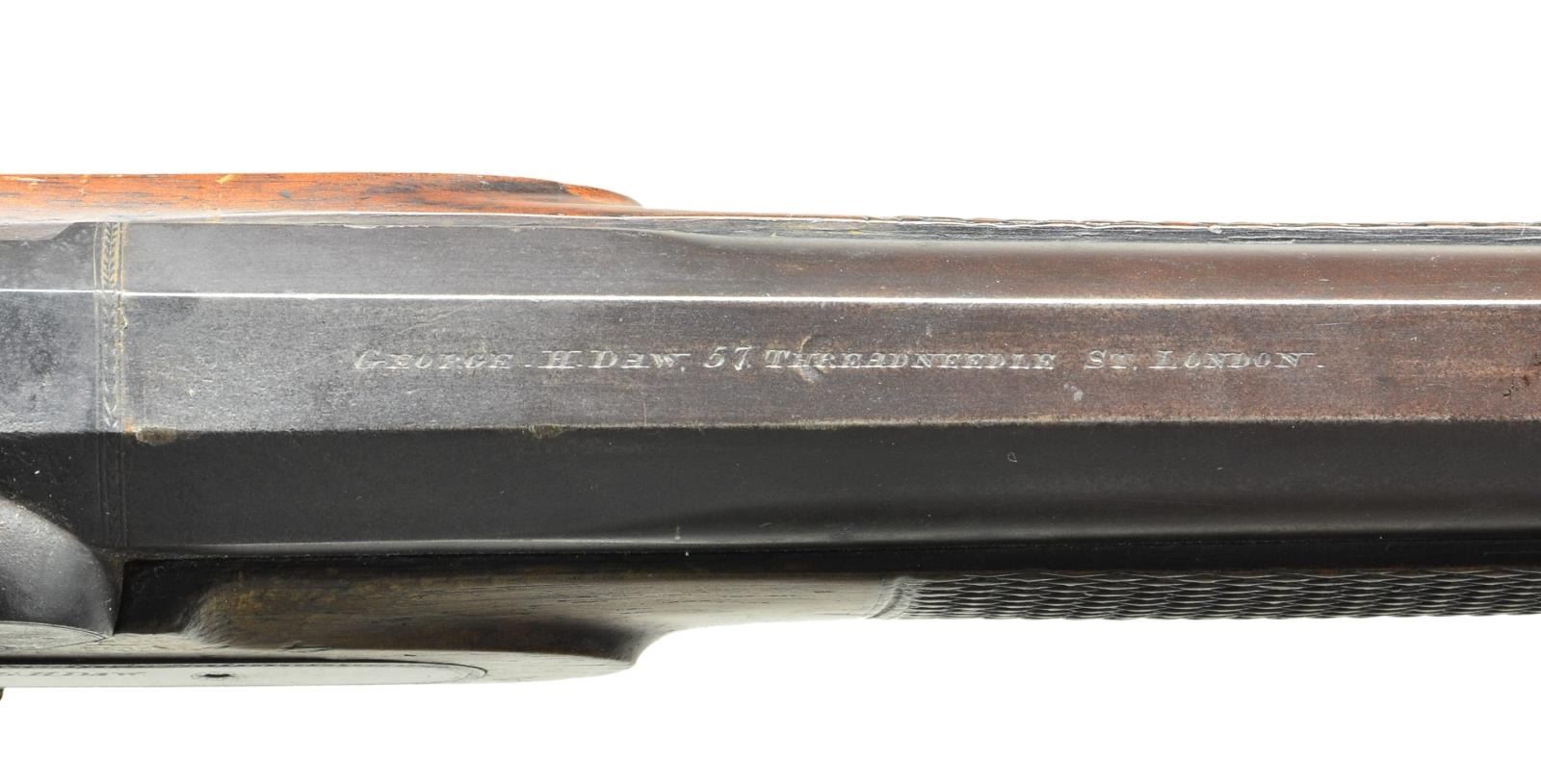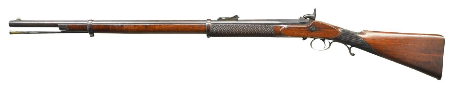 RIFLE. Cal. 577. NSN. George Daw has association with Confederate imports as several of his rifles came through the blockade and checkered volunteer rifles with known Confederate markings are well known. Iron mounted British Pattern 1856 Rifle, 33” barrel engraved “GEORGE H. DAW 57 THREADNEEDLE ST LONDON”, turned at muzzle for bayonet, standard Enfield long range sight, standard 3 groove military rifling, the lock marked “G. H. DAW”. Unlike standard military issue arms, this rifle has fine checkered wrist and forestock, vacant silver thumb plate, lighter weight tapered ovate barrel, and brass tipped ramrod. Since volunteers bought their own rifles, some could afford best quality and quality maker like Daw made them. CONDITION: fine overall, muted case color on lock, barrel has traces of blue with balance plum, stock has crisp checkering, complete and original with sling swivels long removed. Mechanics crisp, bright rifled bore. (01-21632/JS). ANTIQUE. $3,000-4,000.
