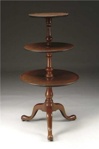 FINE GEORGIAN MAHOGANY QUEEN ANNE GRADUATED THREE TIER DUMBWAITER. Three tiers having dish molded shelves raised on three arch carved legs ending in well shaped pointed padded slipper feet. Third quarter of the 18th Century. SIZE: 48” h x 24” w. CONDITION: Good with some old repairs. 9-26641