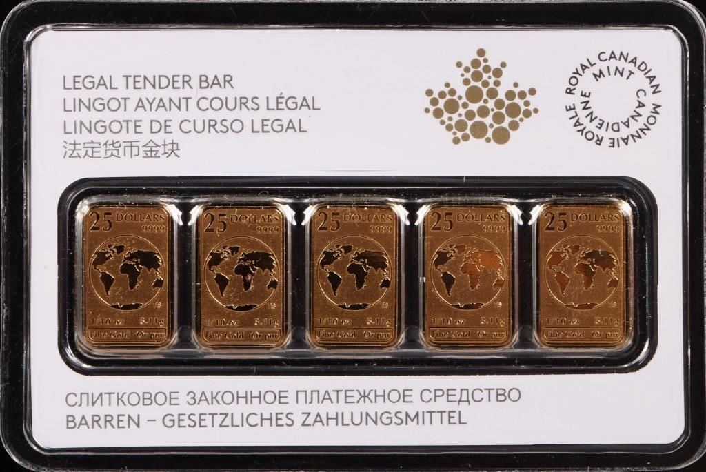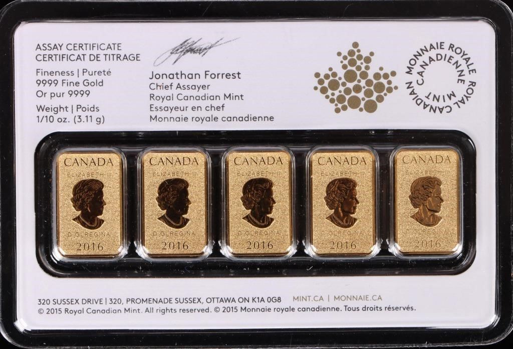 Fine gold Canadian Mint Assay Certified 2016 Elizabeth II five 1/10 oz $25 bars.