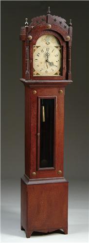 FINE GRANDFATHER CLOCK BY S. HOADLEY. The dial painted with blue and white urn with green and red decoration at corners. The large painted dial has two smaller dials, one in minutes and the other in days. The outstanding case has glass waist door and cutout base. Hood with turned posts and fretwork top that has fourteen pierced cutout stars. Three turned wood finials. The case has fabulous all over alligatored varnish finish. Two brass weights and pendulum are present. Wooden works with bell strike. SIZE: 91in. to top of finial x 19in. at widest x 12in. at deepest. CONDITION: Very good, as noted above. 9-26031