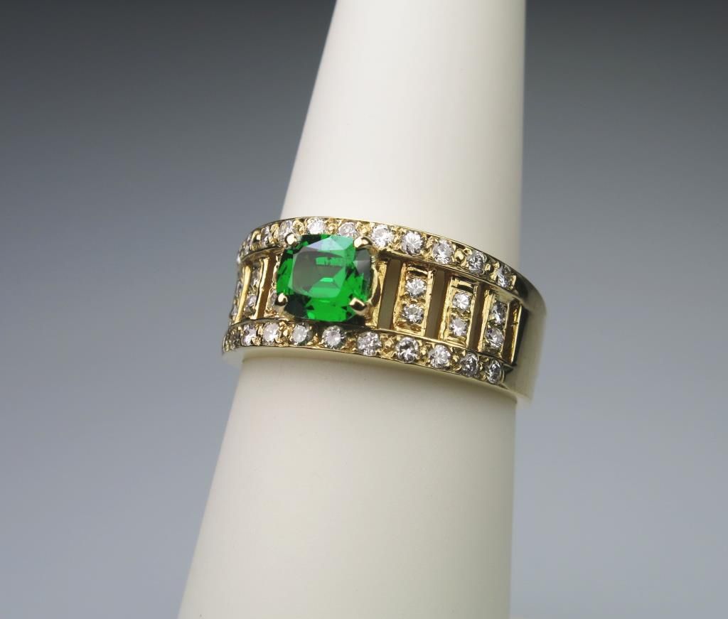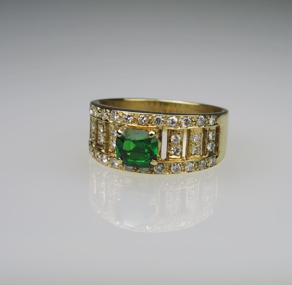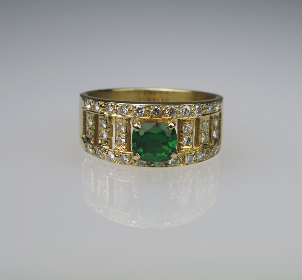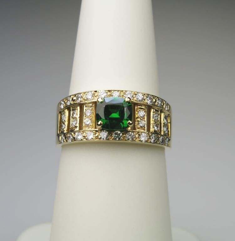 FINE Green Tsavorite Garnet and Diamond Ring with 0.75 carat Tsavorite Garnet accented with 34 round cut Diamonds weighing approx. 0.40 carats with F-G color and VS/SI clarity set in 14 karat yellow gold. Nice. Retail $2,000-$3,000 Estimate$1,500-$2,000.