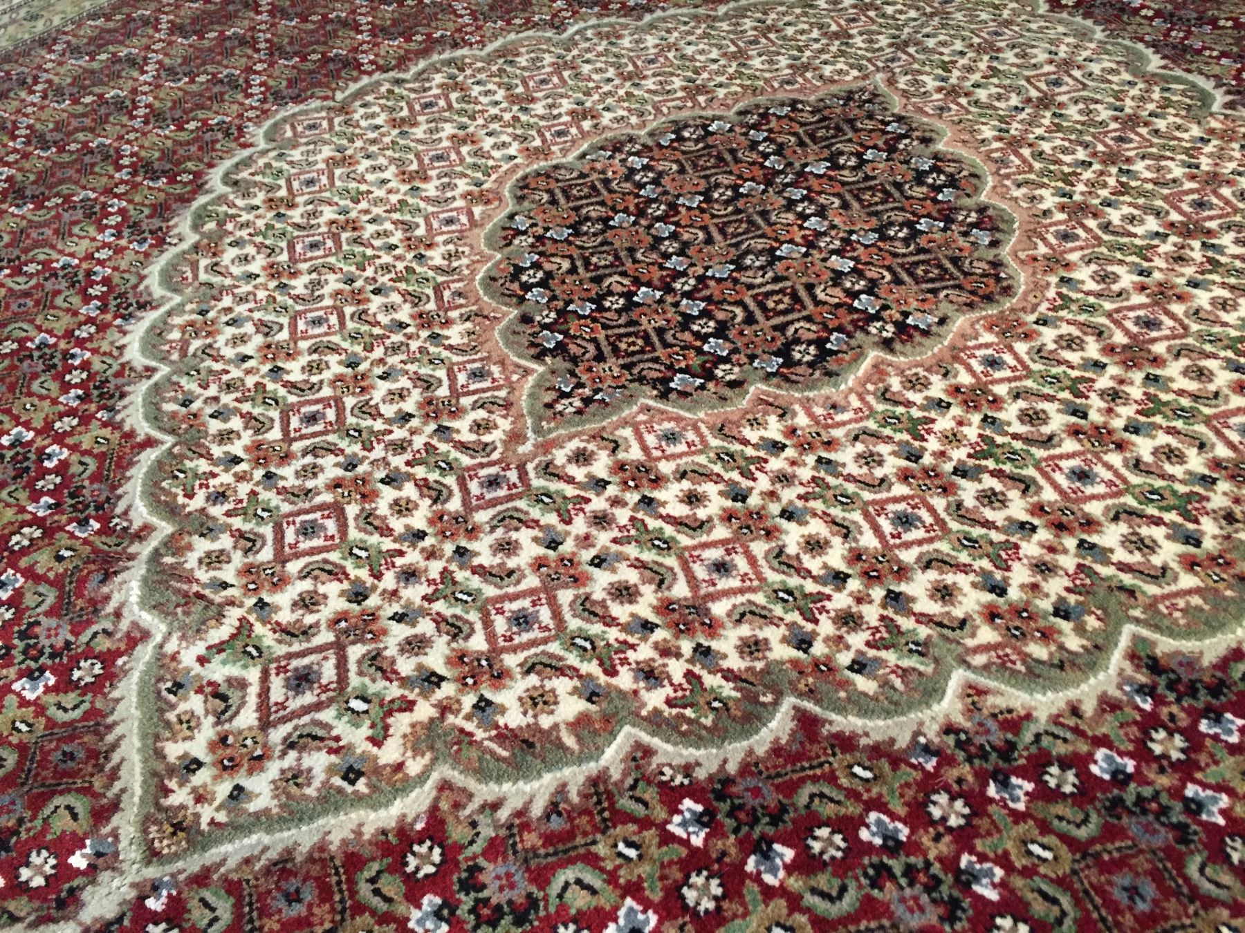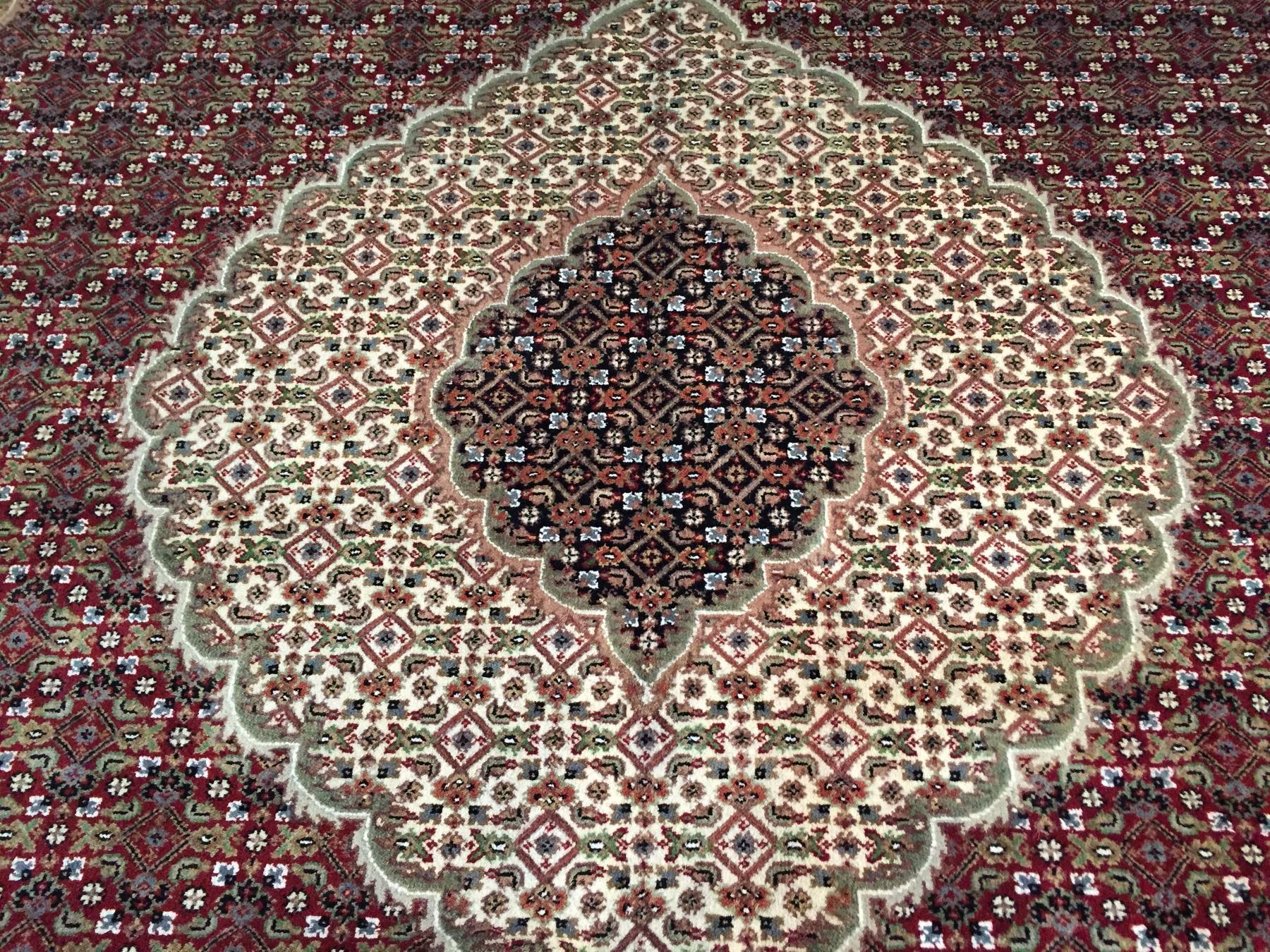 7'.10"X12'.2" FINE QUALITY HAND KNOTTED SILK AND WOOL TABRIZ "MAHI-MEDALLION" RUG, IN RED AND MULTI ACCENT COLORS ,VEGGIE DYE FINE HAND SPUN WOOL MASTER QUALITY RUG HAND KNOTTED IN INDIA.
