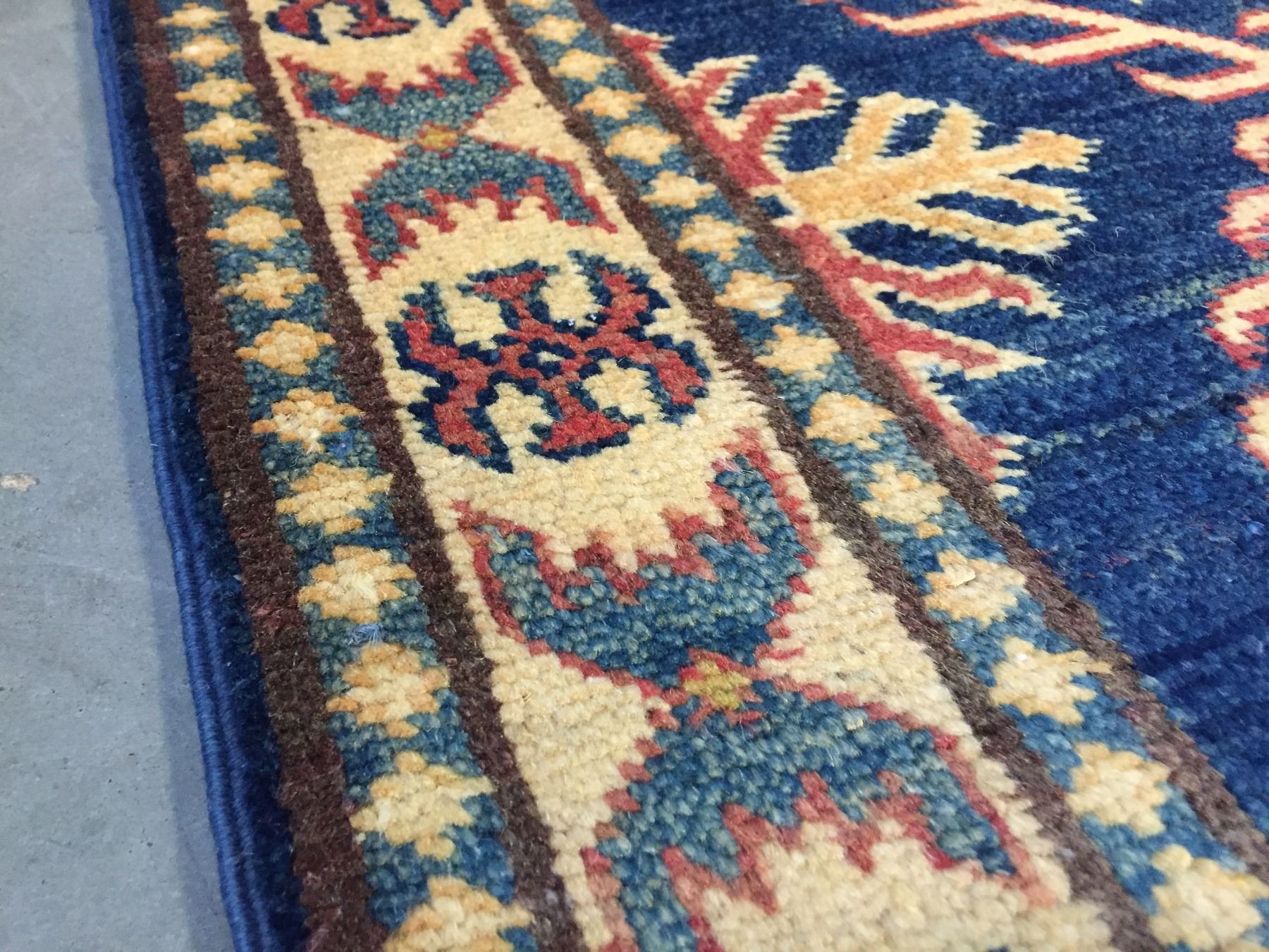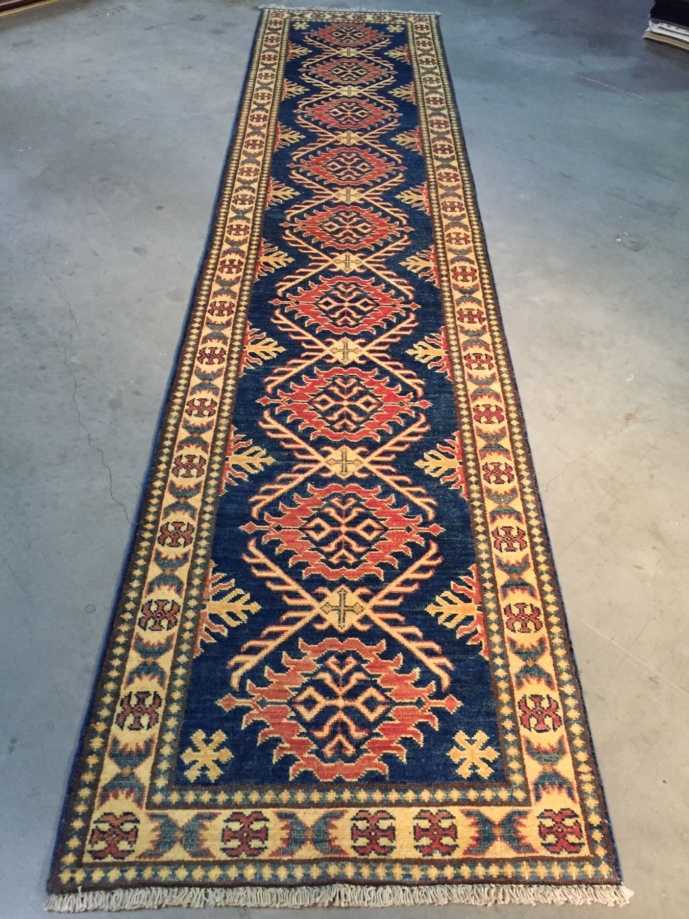 2'.6"X10' Fine Authentic Hand Knotted 100% Veggie Dye Natural wool Pile Geometric pattern Kazak runner in decorative Navy Blue, rust,Ivory and multi accent colors Hand Knotted in Pakistan.