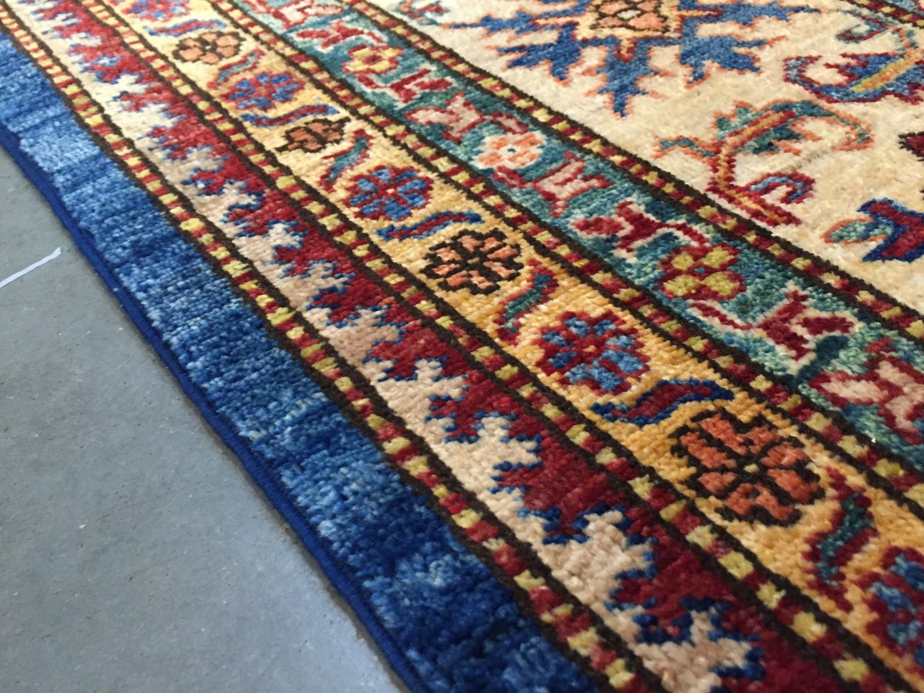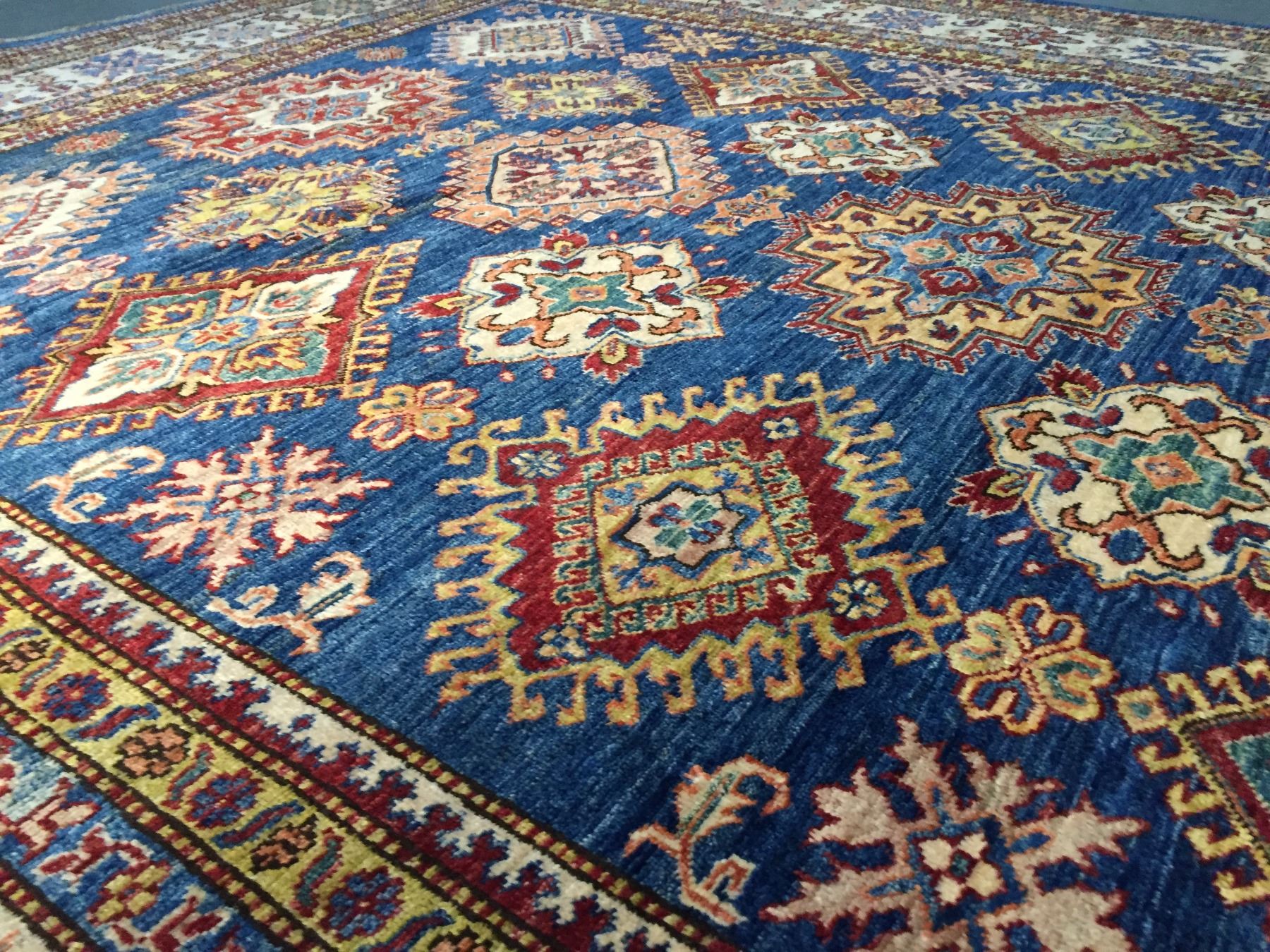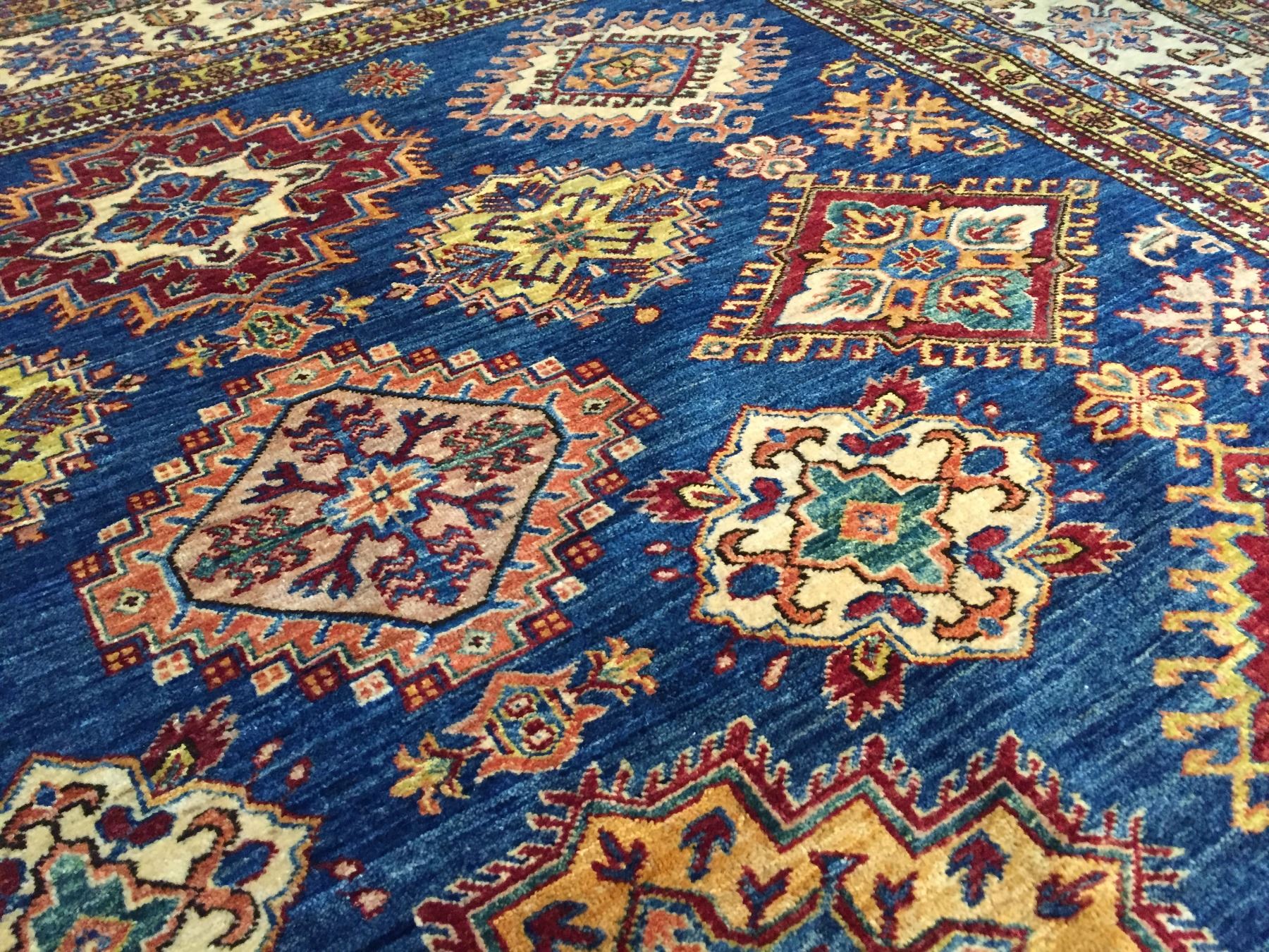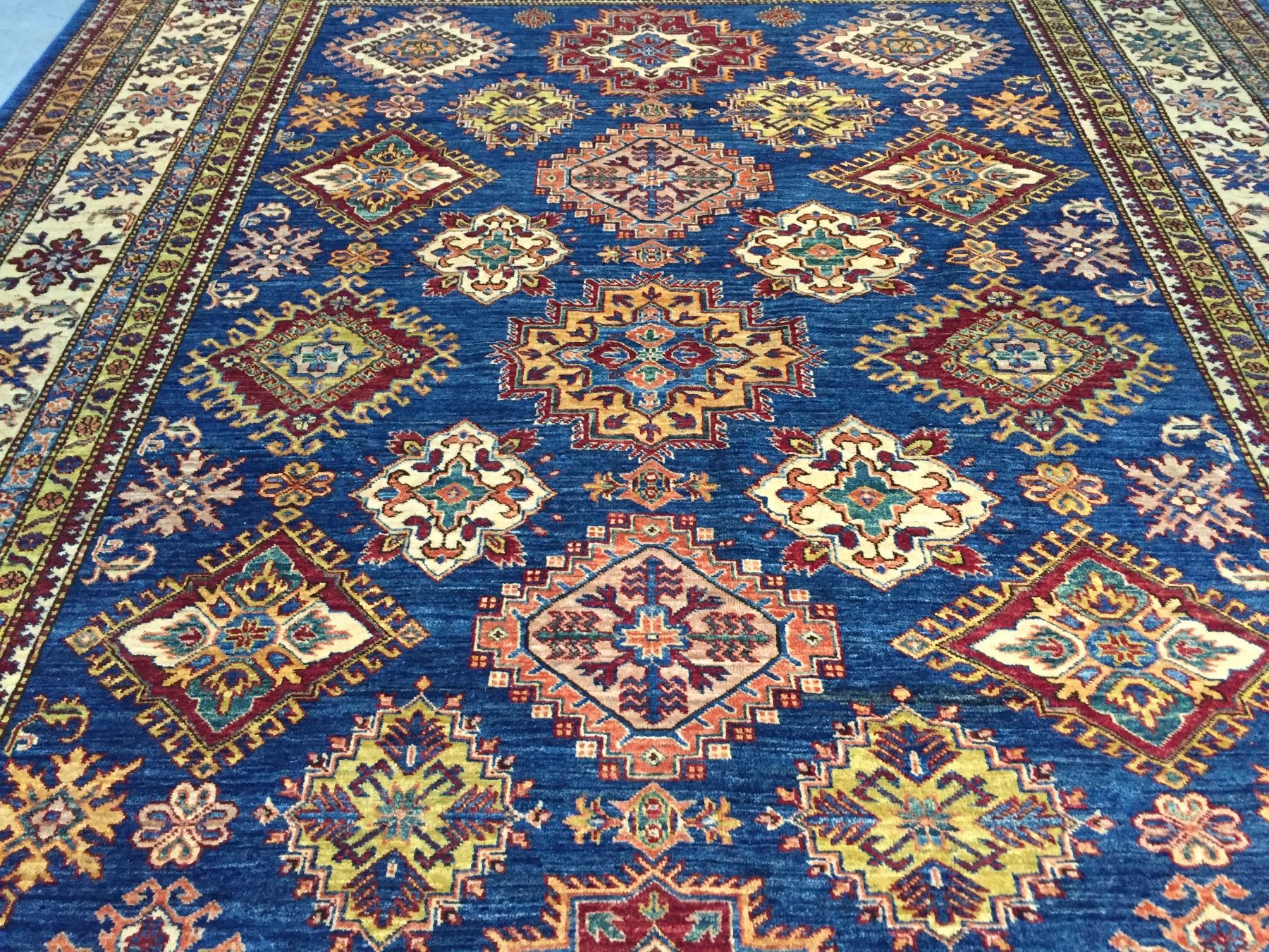 8'.2"x10'.7" Authentic Hand Knotted 100% Veggie Dye Natural wool Pile Geometric pattern Kazak rug in vivid, Royal Blue and multi accent colors Hand Knotted in Pakistan.