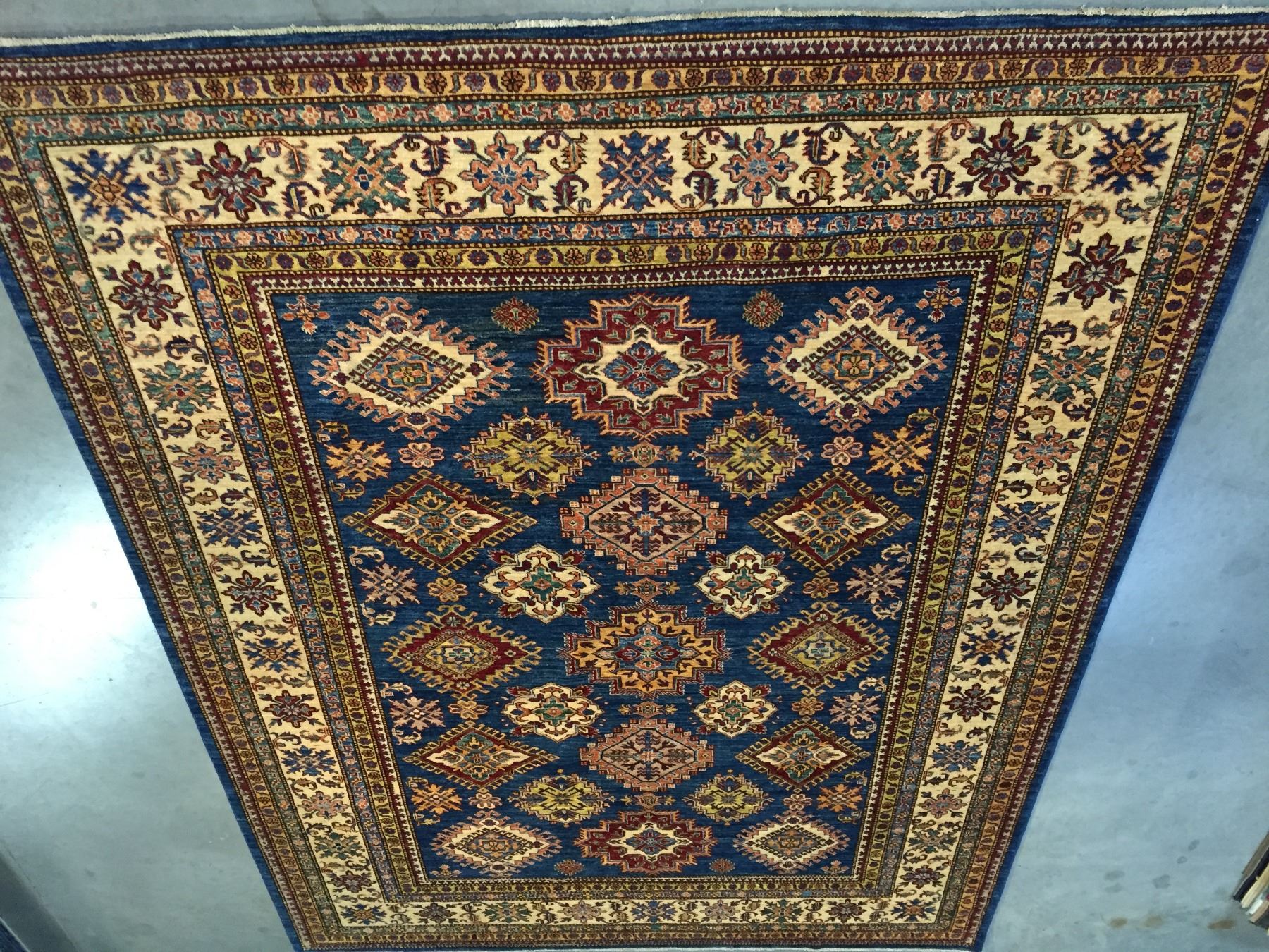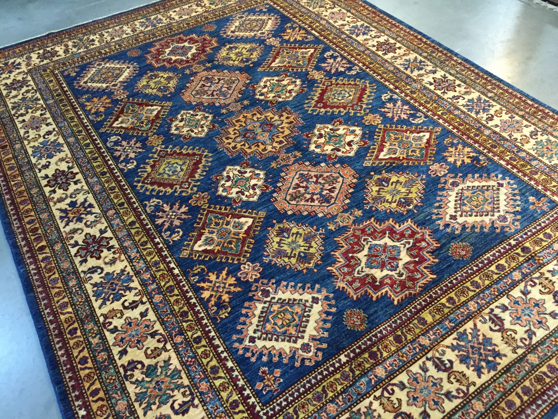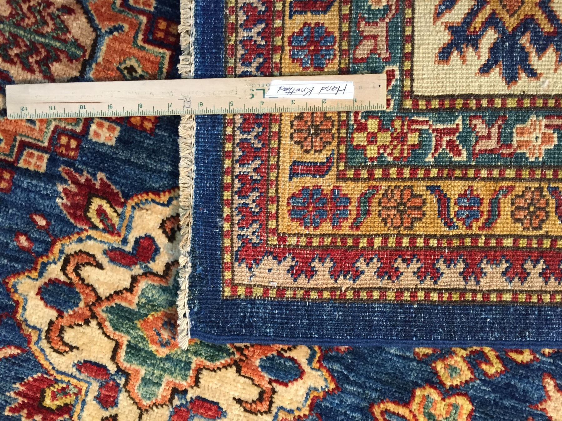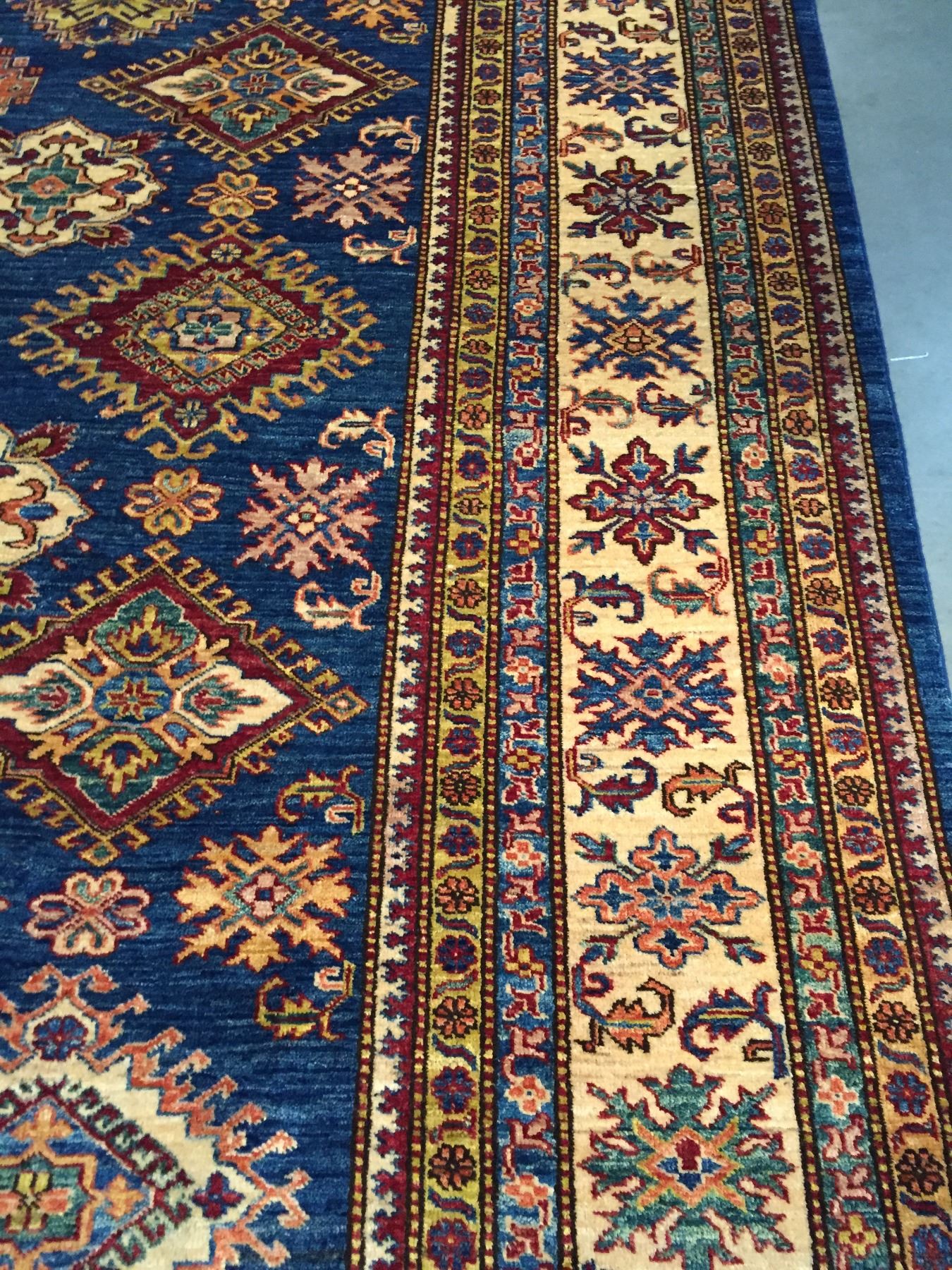 8'.2"x10'.7" Authentic Hand Knotted 100% Veggie Dye Natural wool Pile Geometric pattern Kazak rug in vivid, Royal Blue and multi accent colors Hand Knotted in Pakistan.