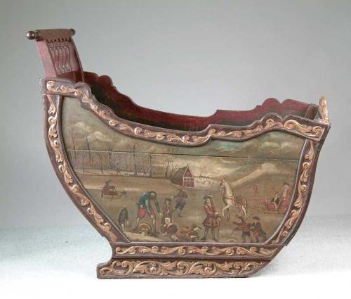 FINE HAND PAINTED DUTCH PUSH SLEIGH. The boat shaped sleigh with side hand painted scenes of frozen water and buildings with skaters, horse drawn sleigh and animals on each side. The painting is attributed to Friesland. Carved frame with gilt decoration in foliate leaf pattern. Turned banister type push handle at top of back. Back panel dated “1723” and having a swan hand painted cartouche. Interior fitted with opposing plank seat. SIZE: 38” h x 46” l x 19-1/2” w. CONDITION: Very good. 5-71745